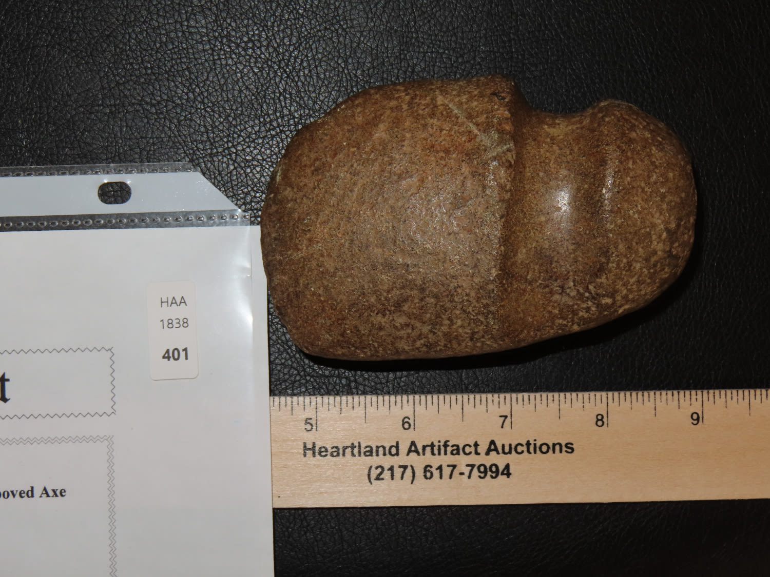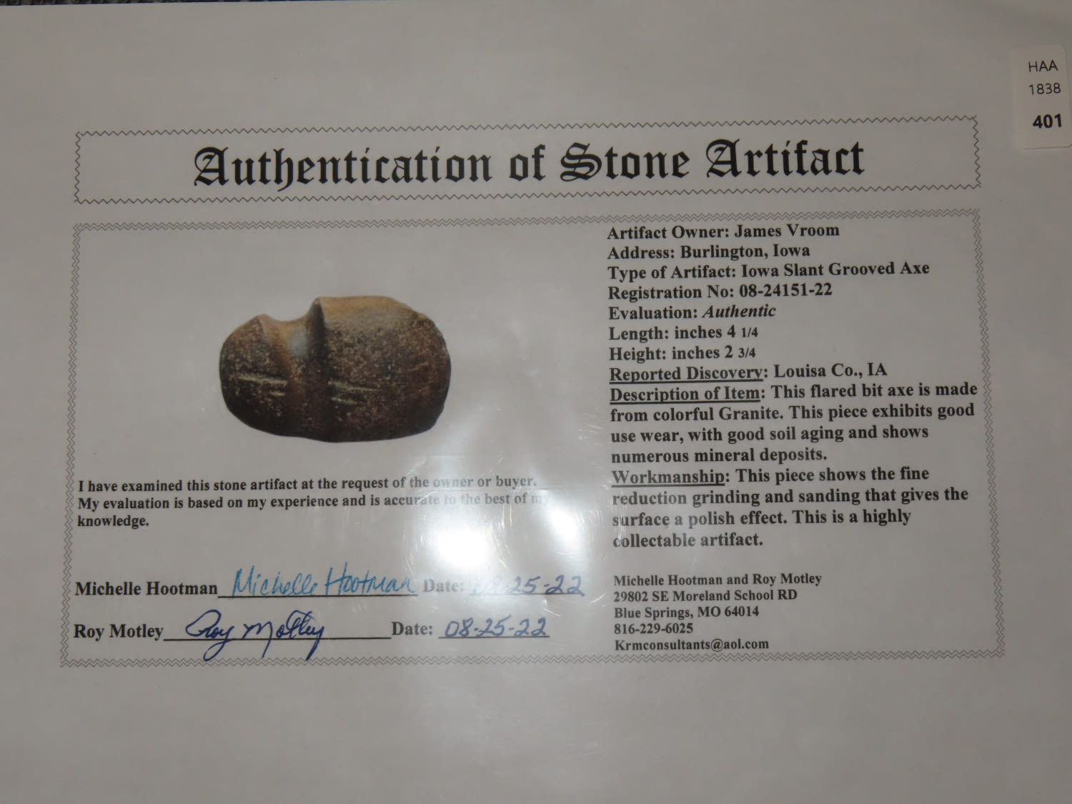 4 1/4″ Iowa Slant Groove Axe, Motley COA, found in Louisa Co. Iowa