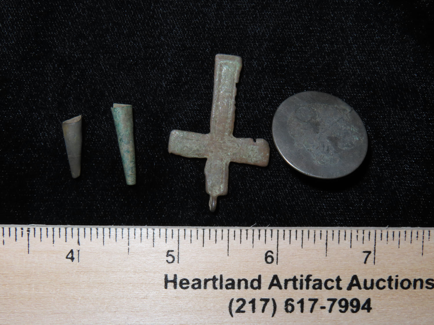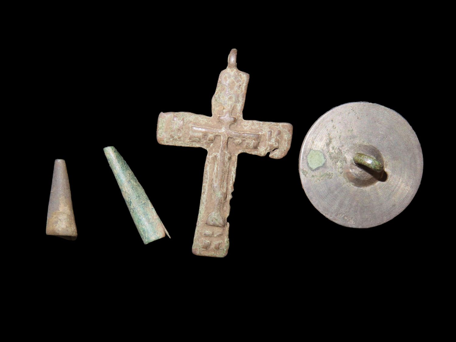 Grouping of Found Items-Jesuit Cross, Copper Tinklers, and Silver Button, Ex Greg Perdun.