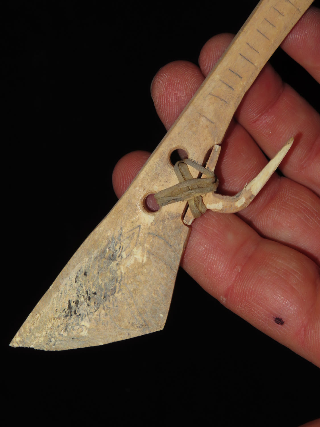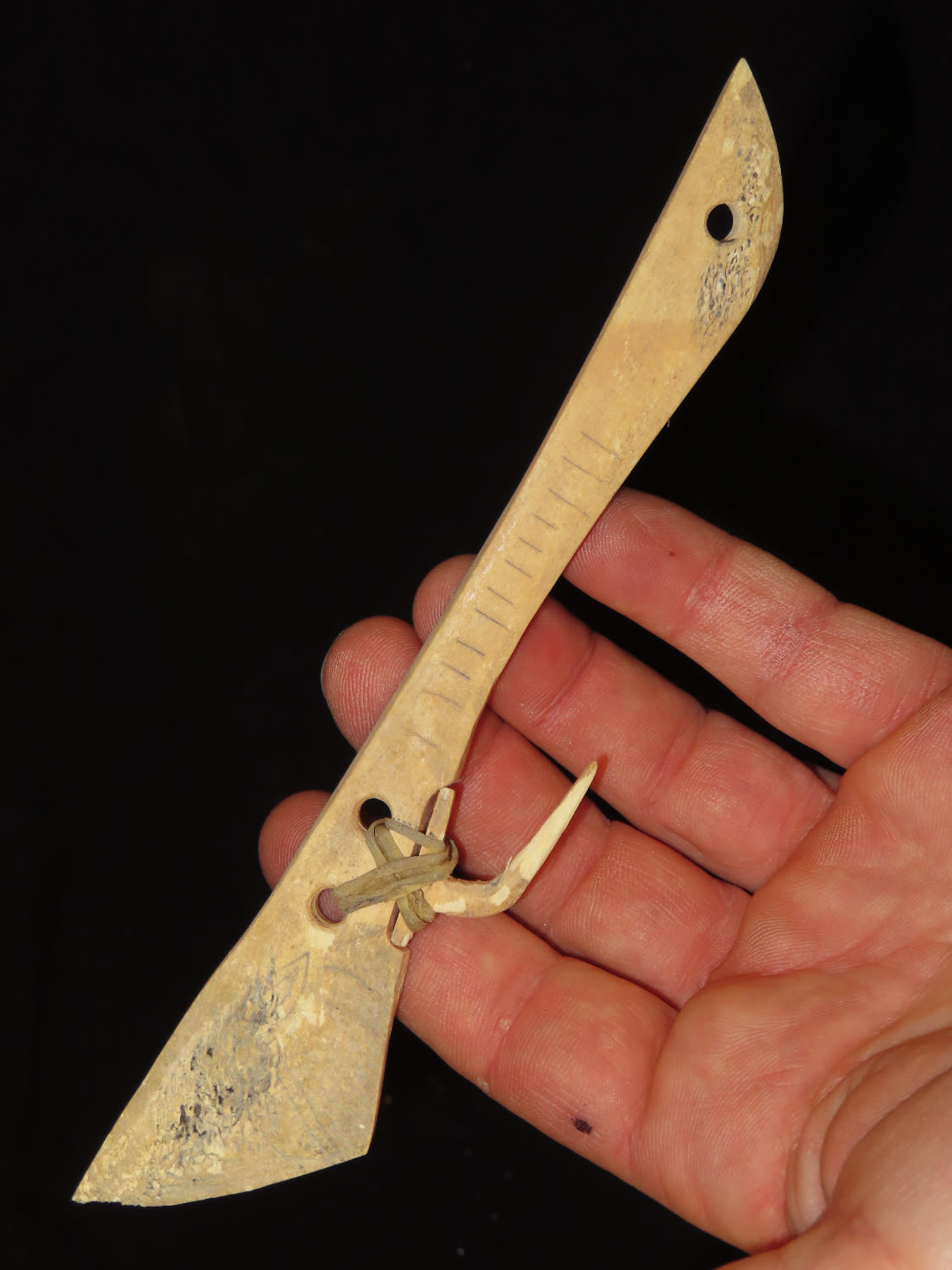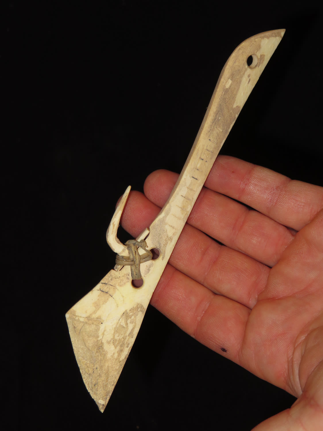 7″ Engraved Bone Halibut Fish Hook, Aleutian Islands Alaska, Inuit, Pre-1900, Collected by Famous Arctic Explorer Donald McMillan in the 1920’s Ex Tommy Bryden