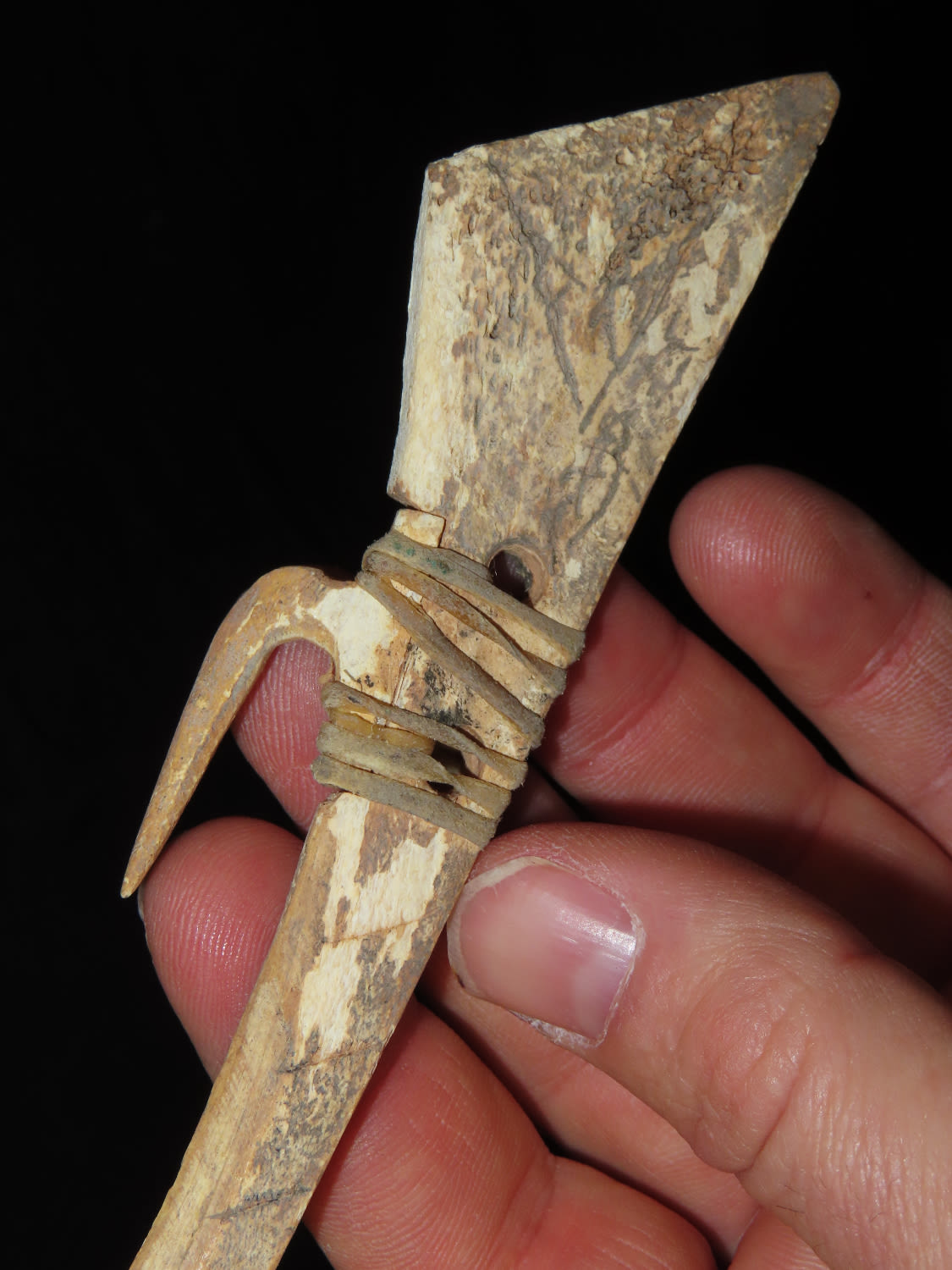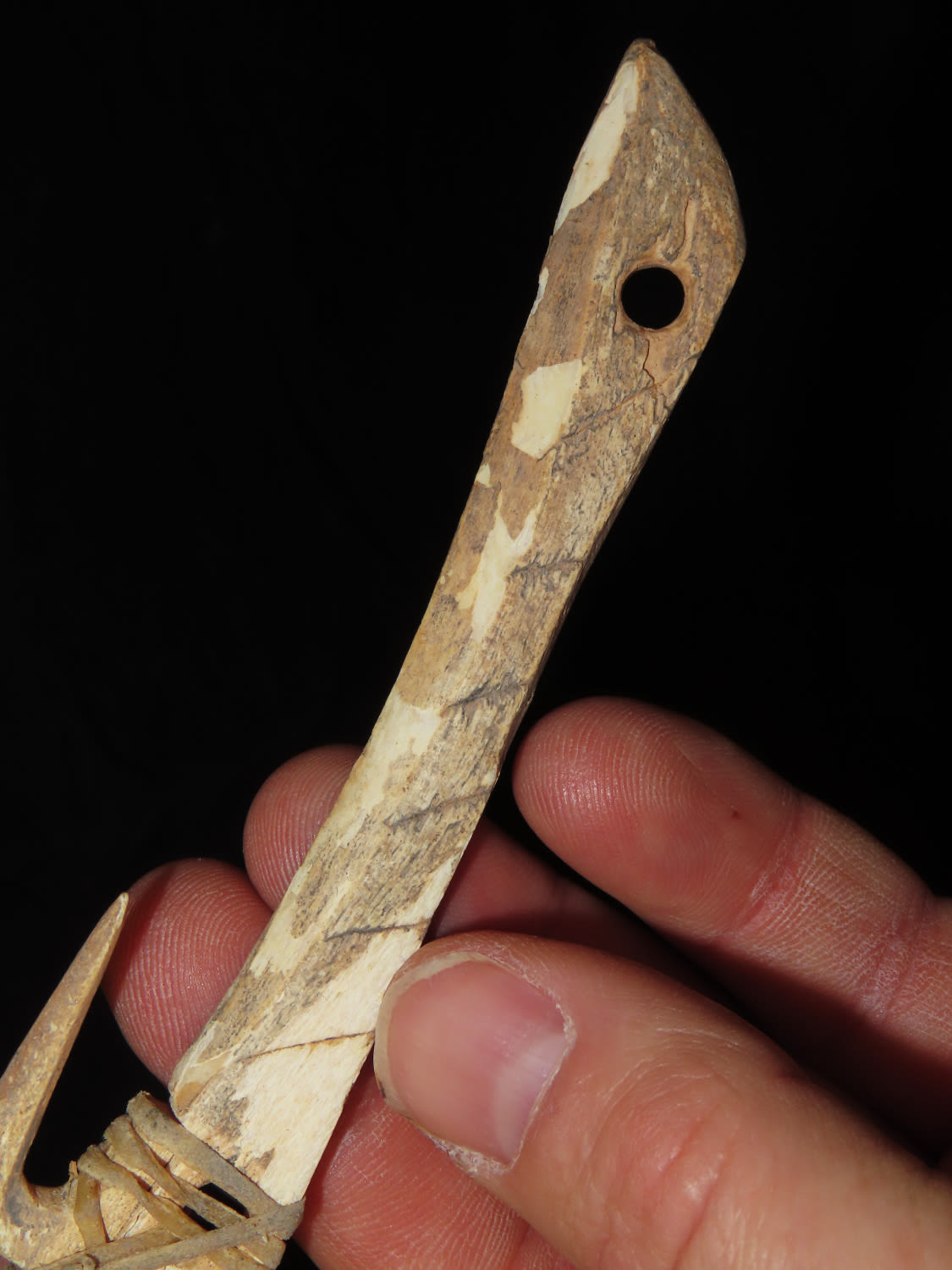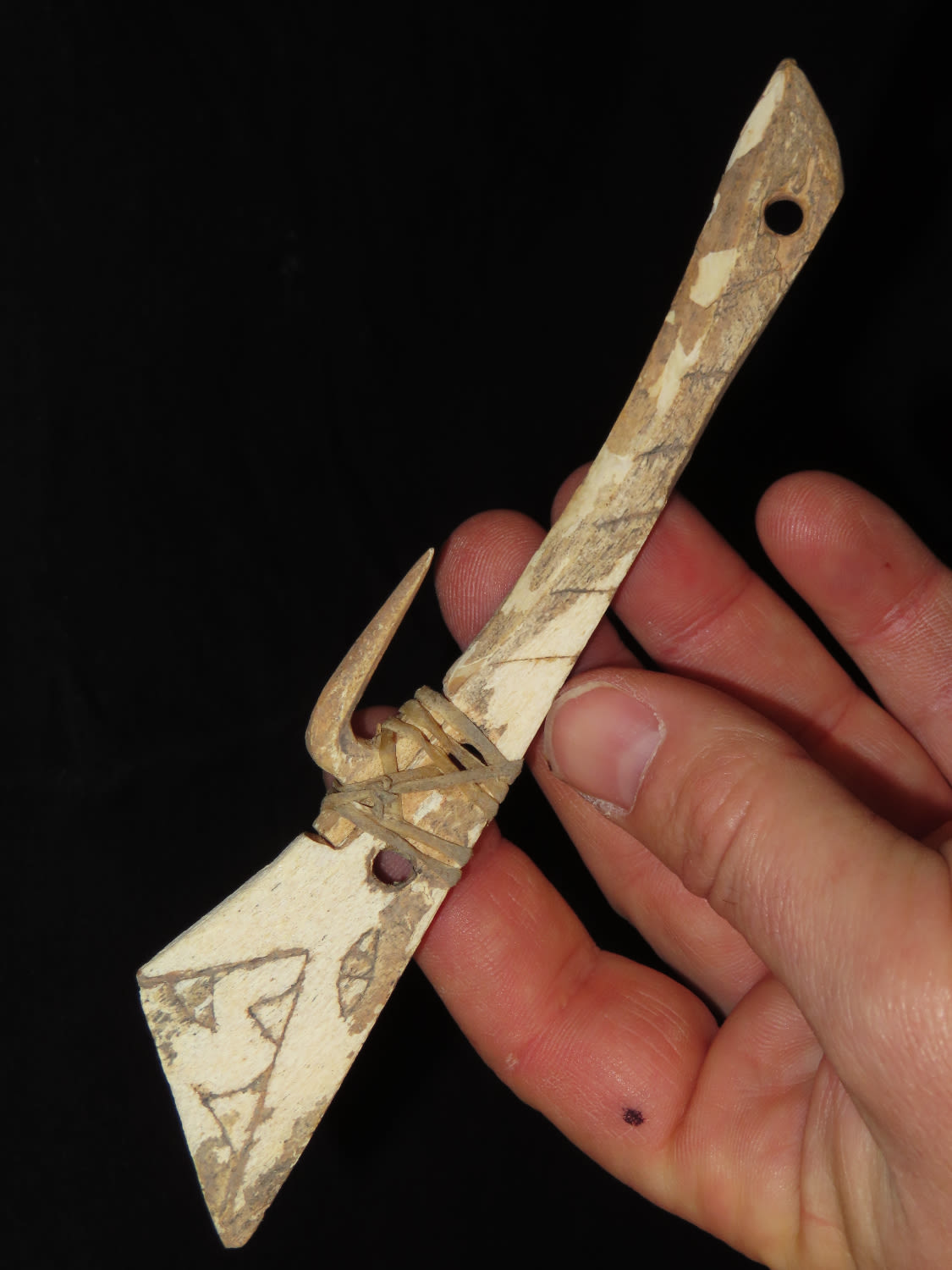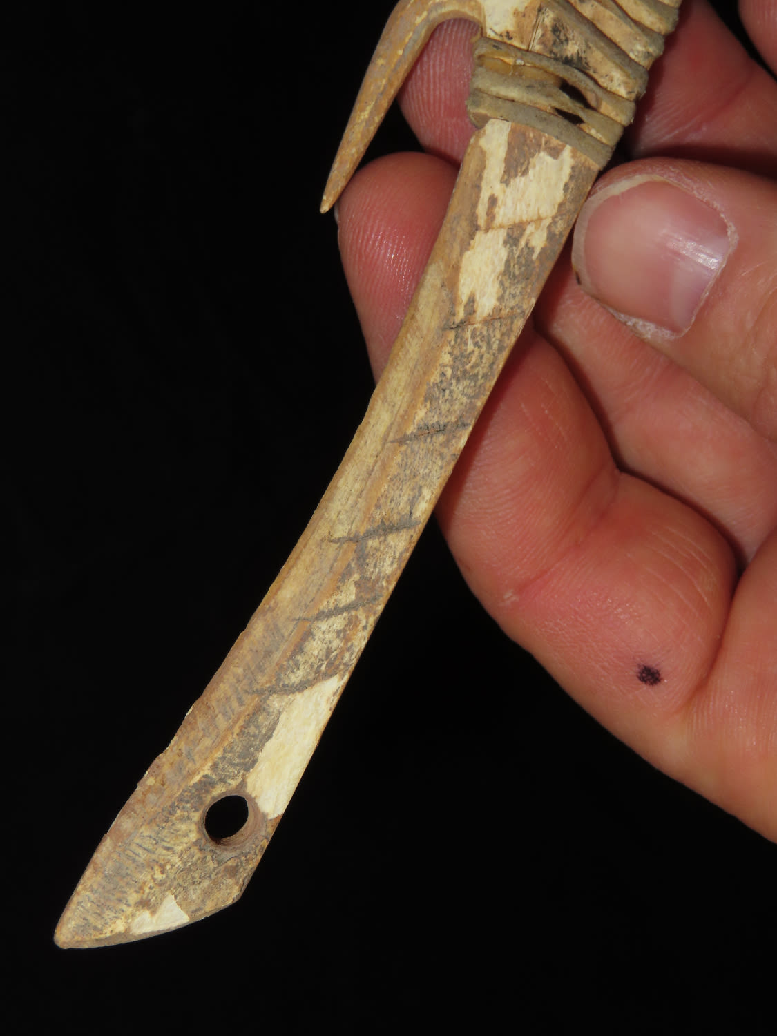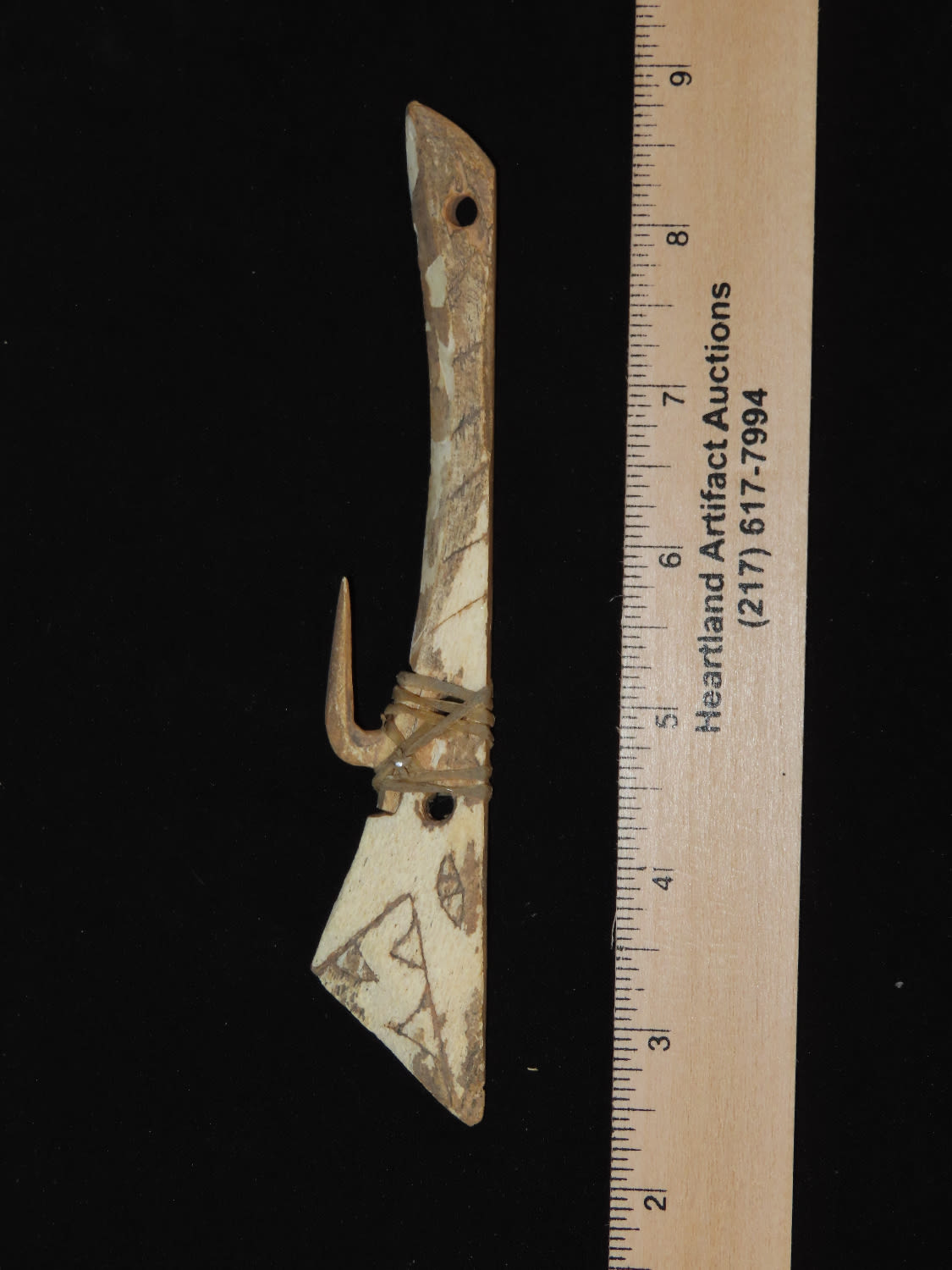6.3/8" Engraved Bone Halibut Fish Hook, Aleutian Islands Alaska, Inuit, Pre-1900, Collected by Famous Arctic Explorer Donald McMillan in the 1920's Ex Tommy Bryden