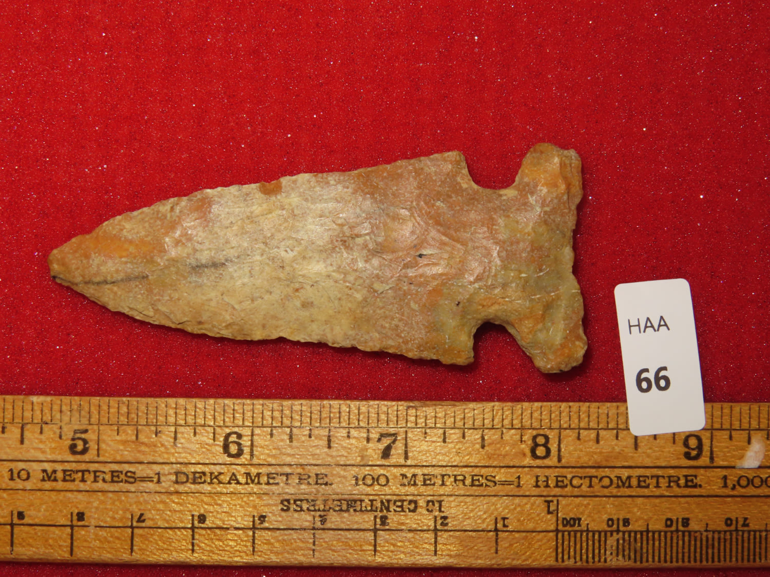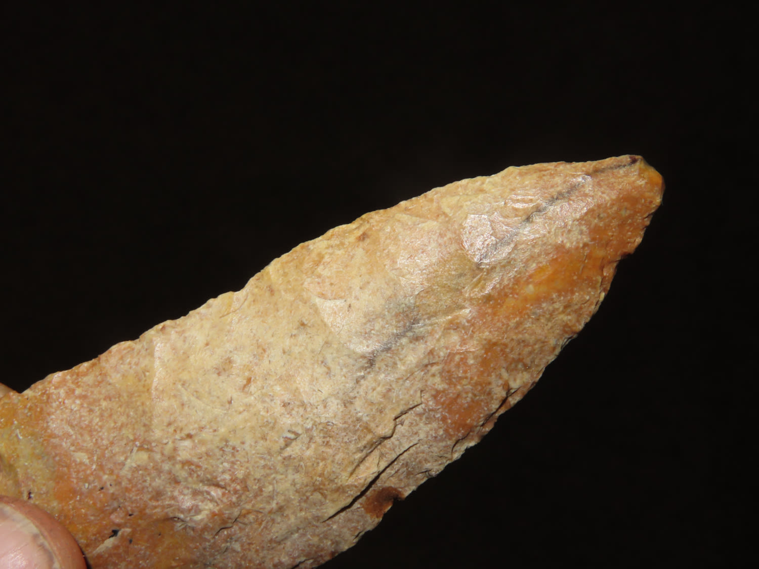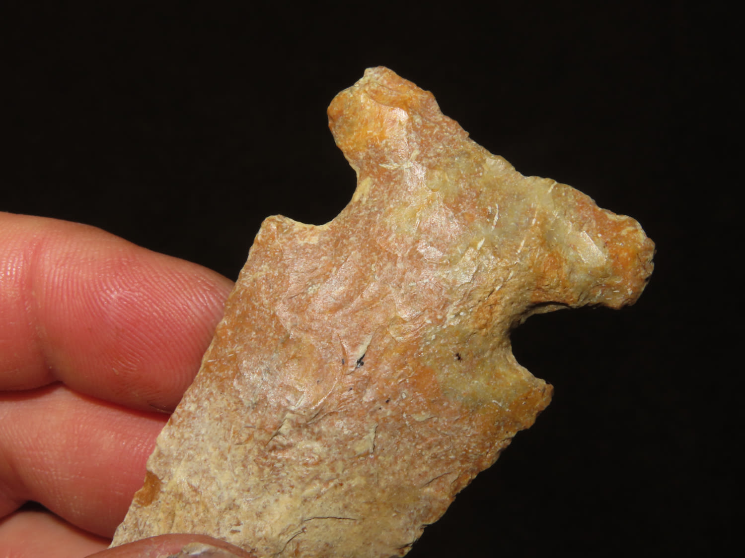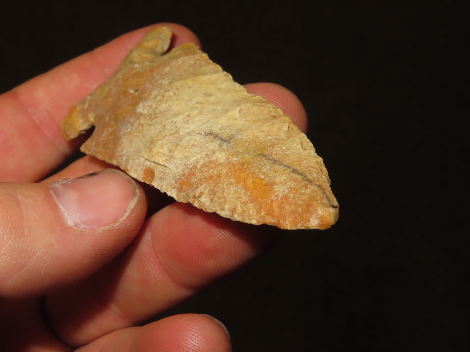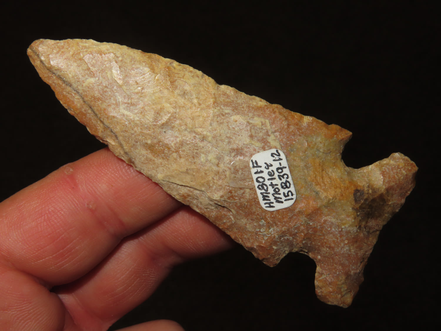 3 1/2″ Outstanding Thebes Point, Creek Stained Burlington Chert Material; Roy Motley COA; Found in Montgomery Co., MO.