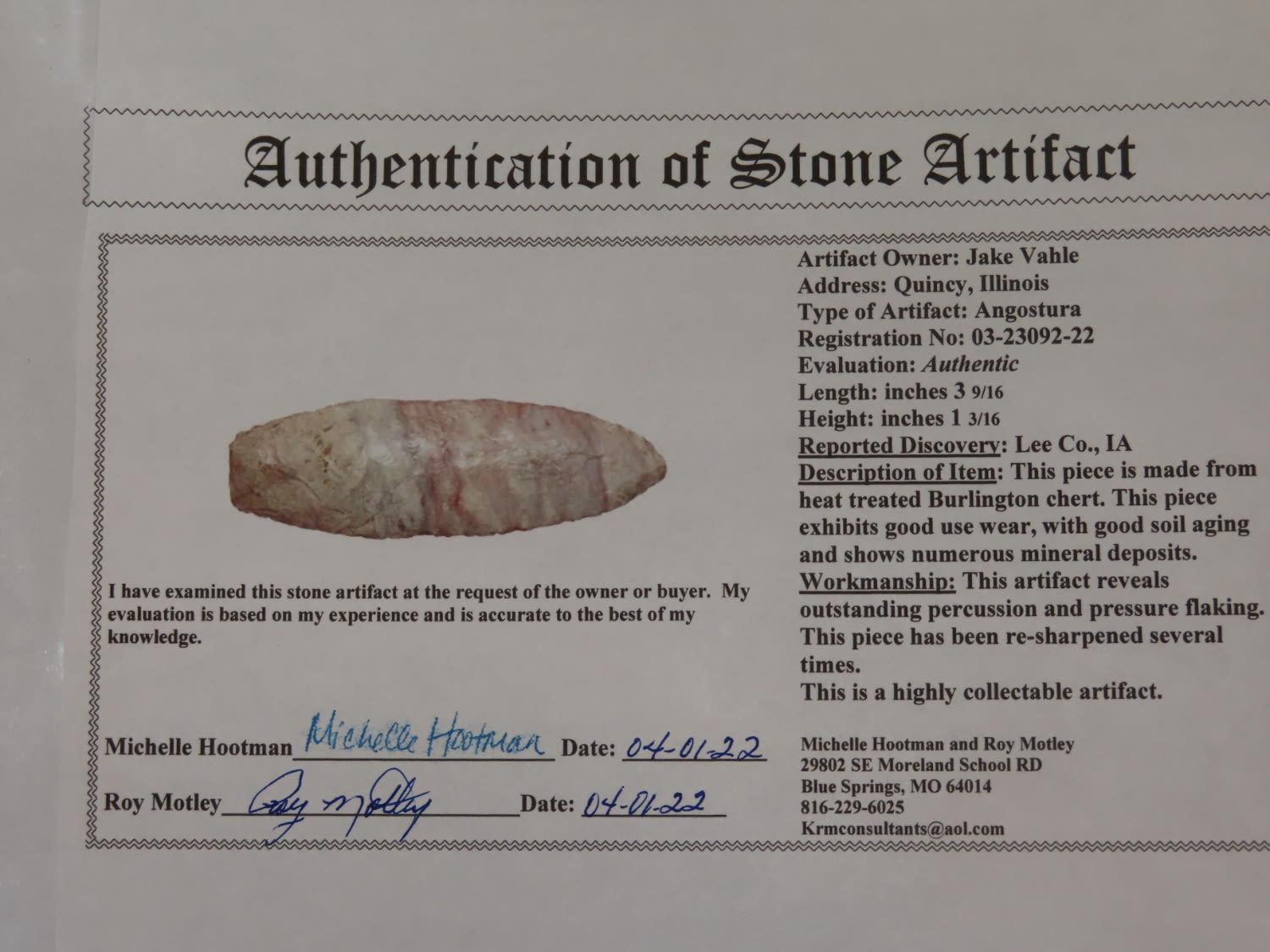 3 9/16″ Angostura; Roy Motley COA; Found in Lee Co., IA