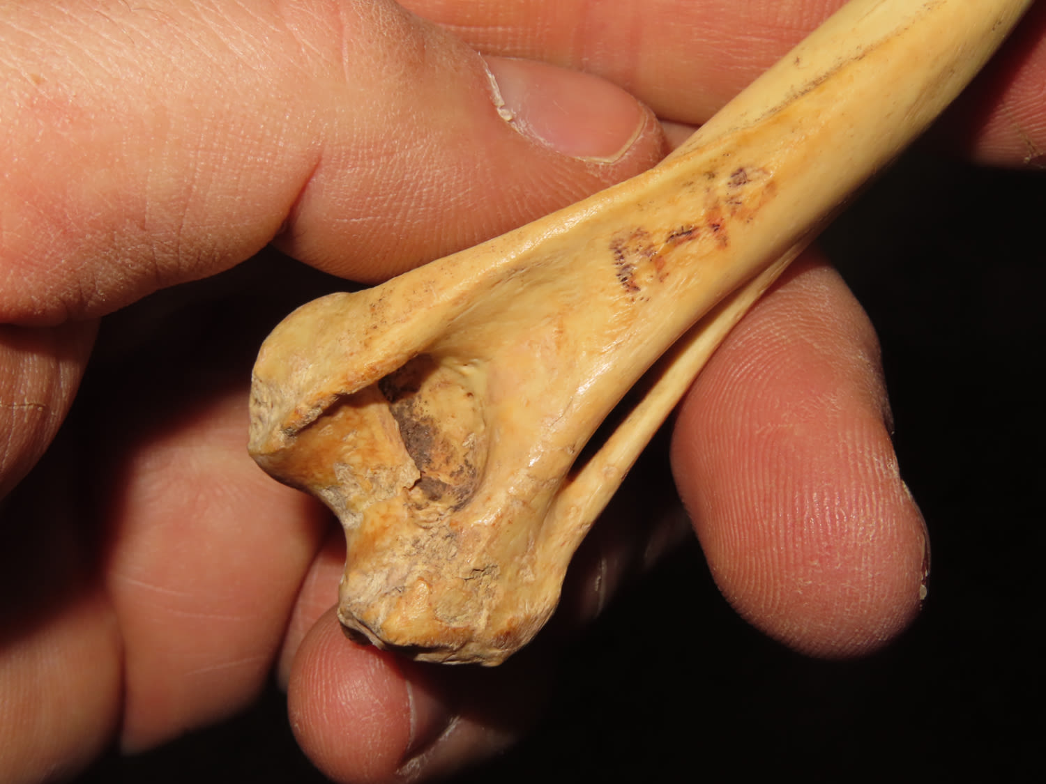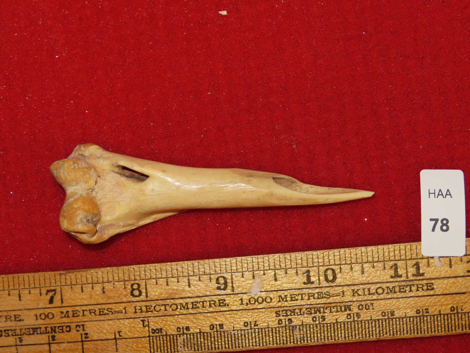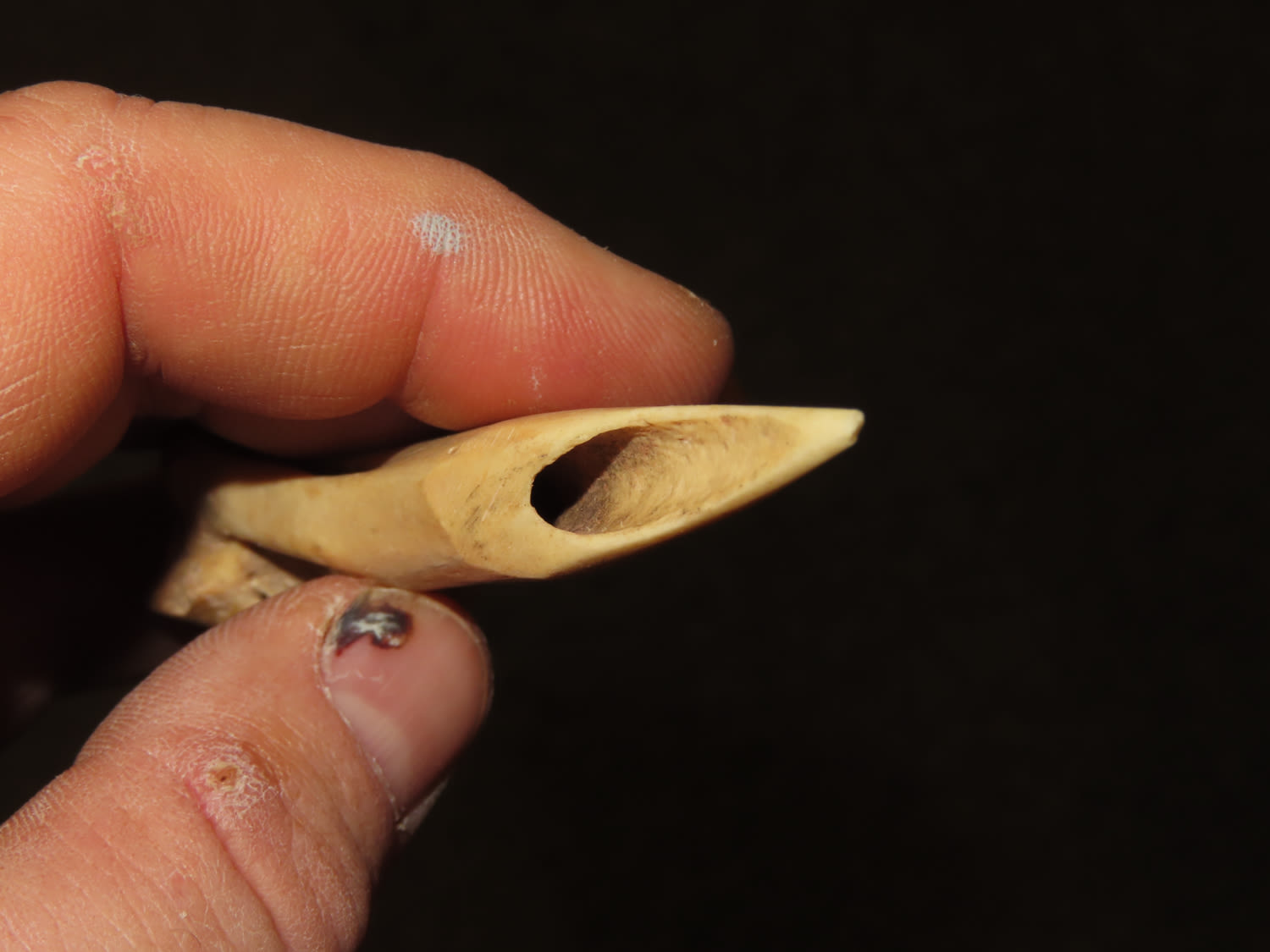 3 3/4″ Fossilized Bone Awl, found in Tennessee, Ex Tim Breakbill Collection