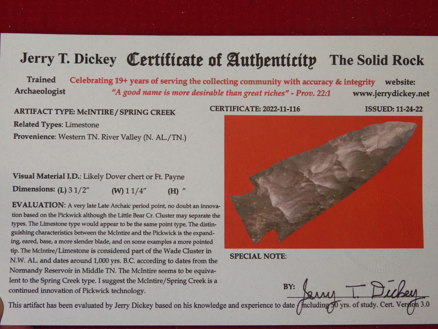 3 1/2″ McIntire/ Spring Creek; Jerry Dickey COA; Found in Western TN. River Valley (N. AL./TN.)
