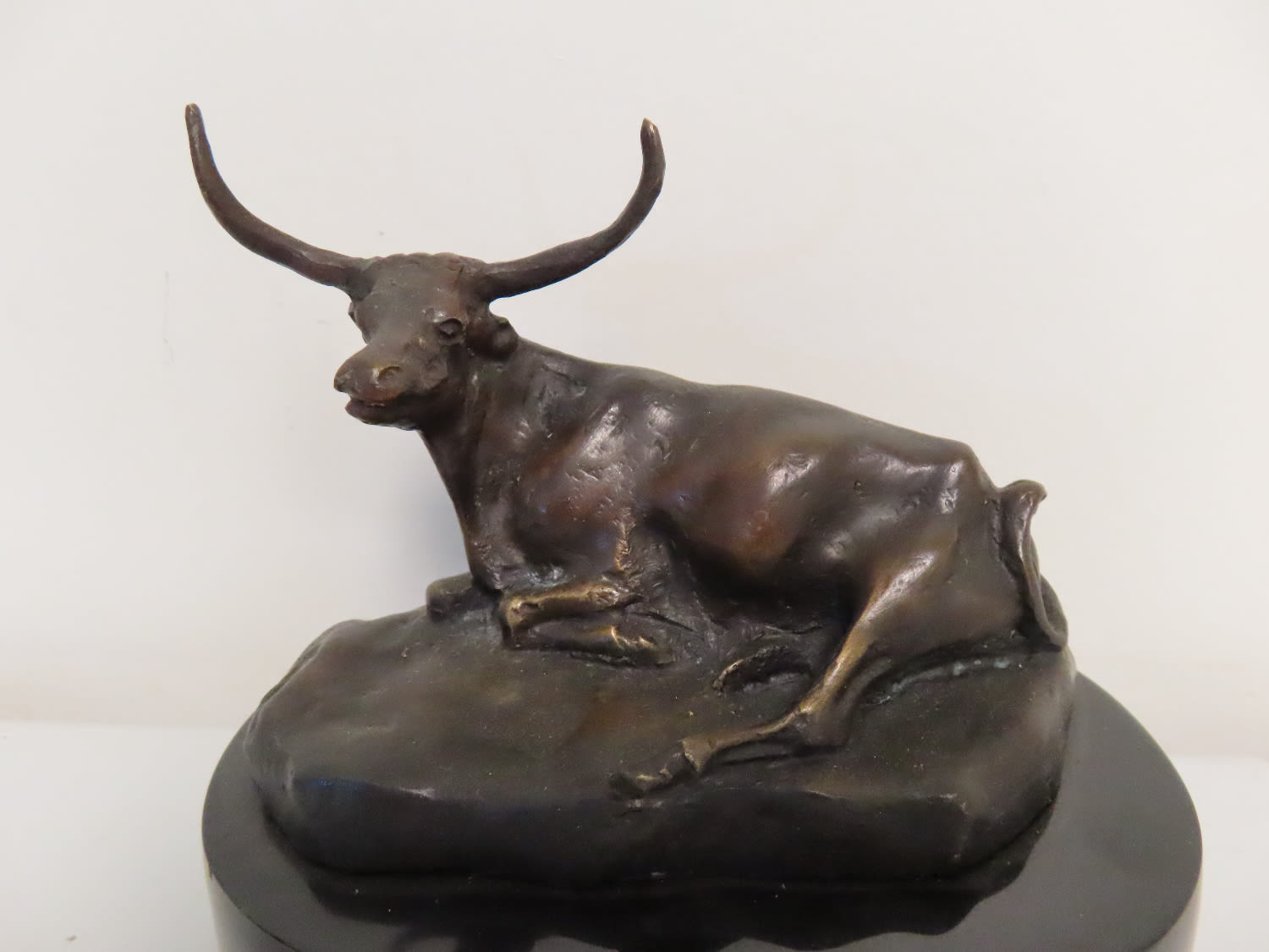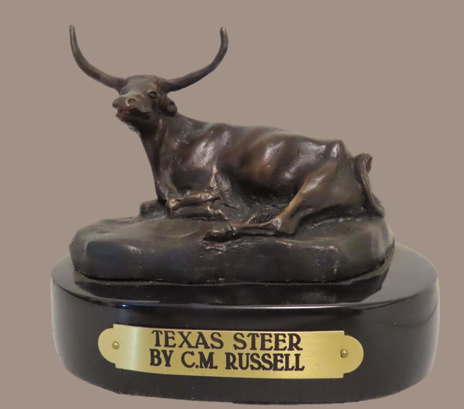 SOLID BRONZE STATUE “TEXAS STEER” BY C.M. RUSSELL, STANDS ABOUT 5 1/2″ TALL, ON ORIGINAL MARBLE BASE, NICE ART SCULPTURE