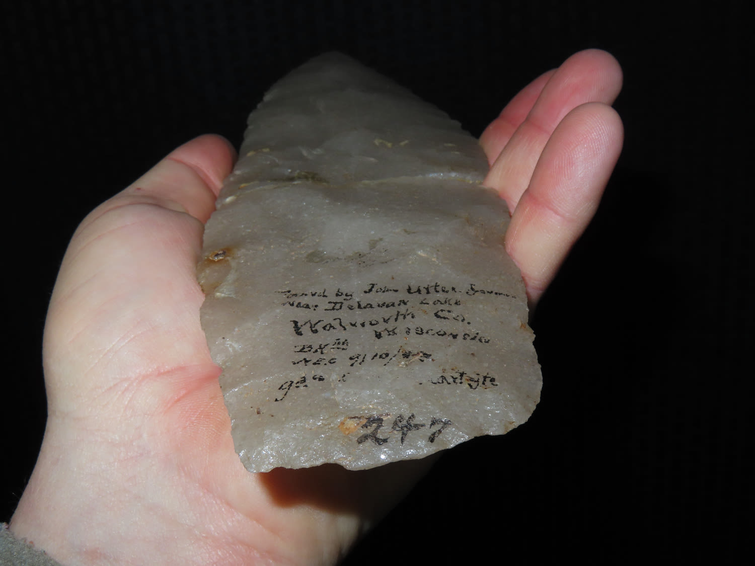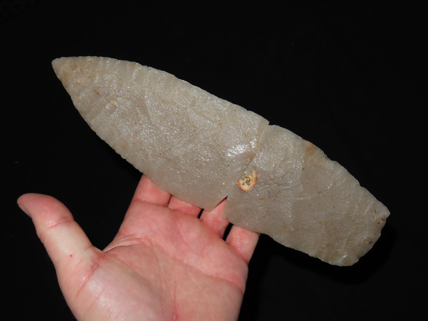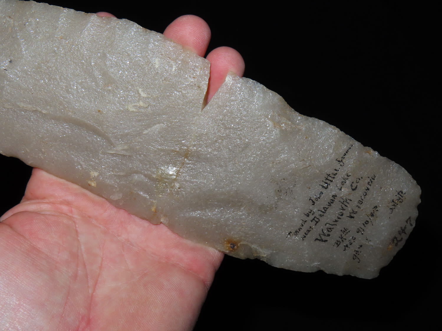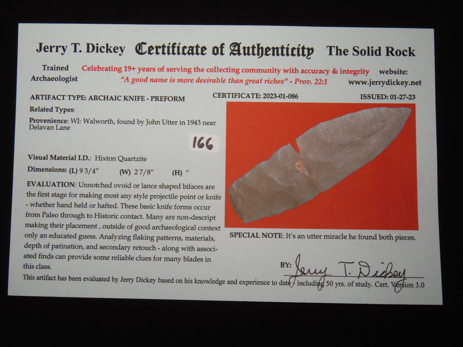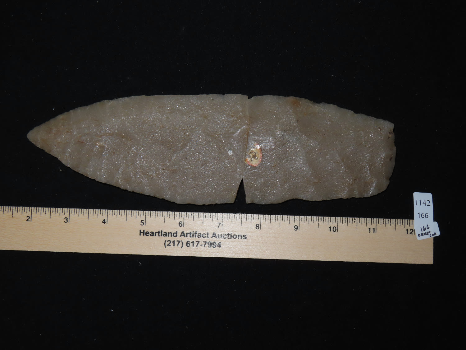 MASSIVE 9 3/4″ EARLY HIXTON KNIFE, DICKEY COA, FOUND IN WALWORTH COUNTY WISCONSIN IN 1943 BY JOHN UTTER NEAR DELAVAN LANE, HUGE EXAMPLE THAT IS VERY THIN AND WELL FLAKED, BROKEN AND GLUED IN THE CENTER