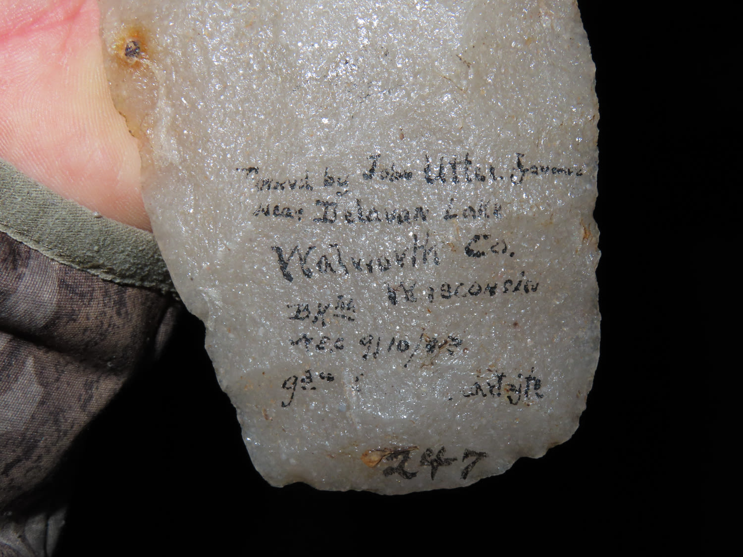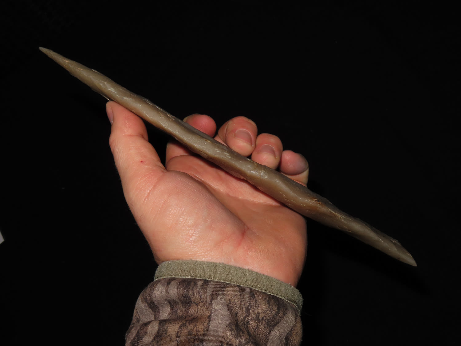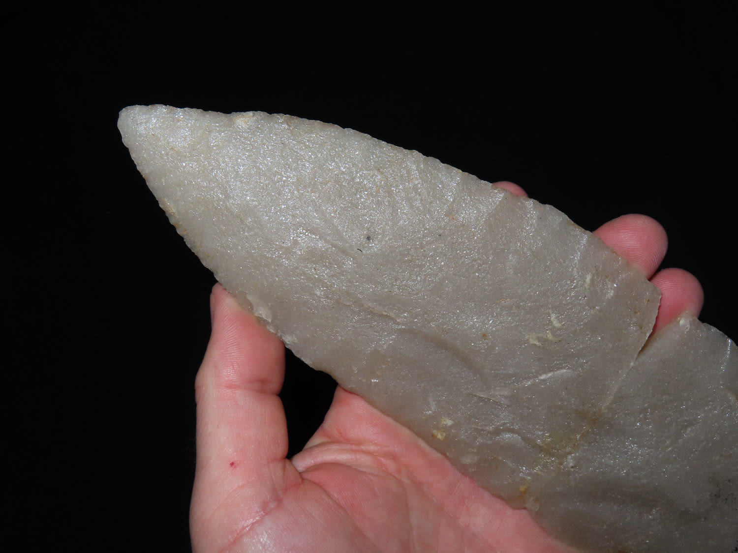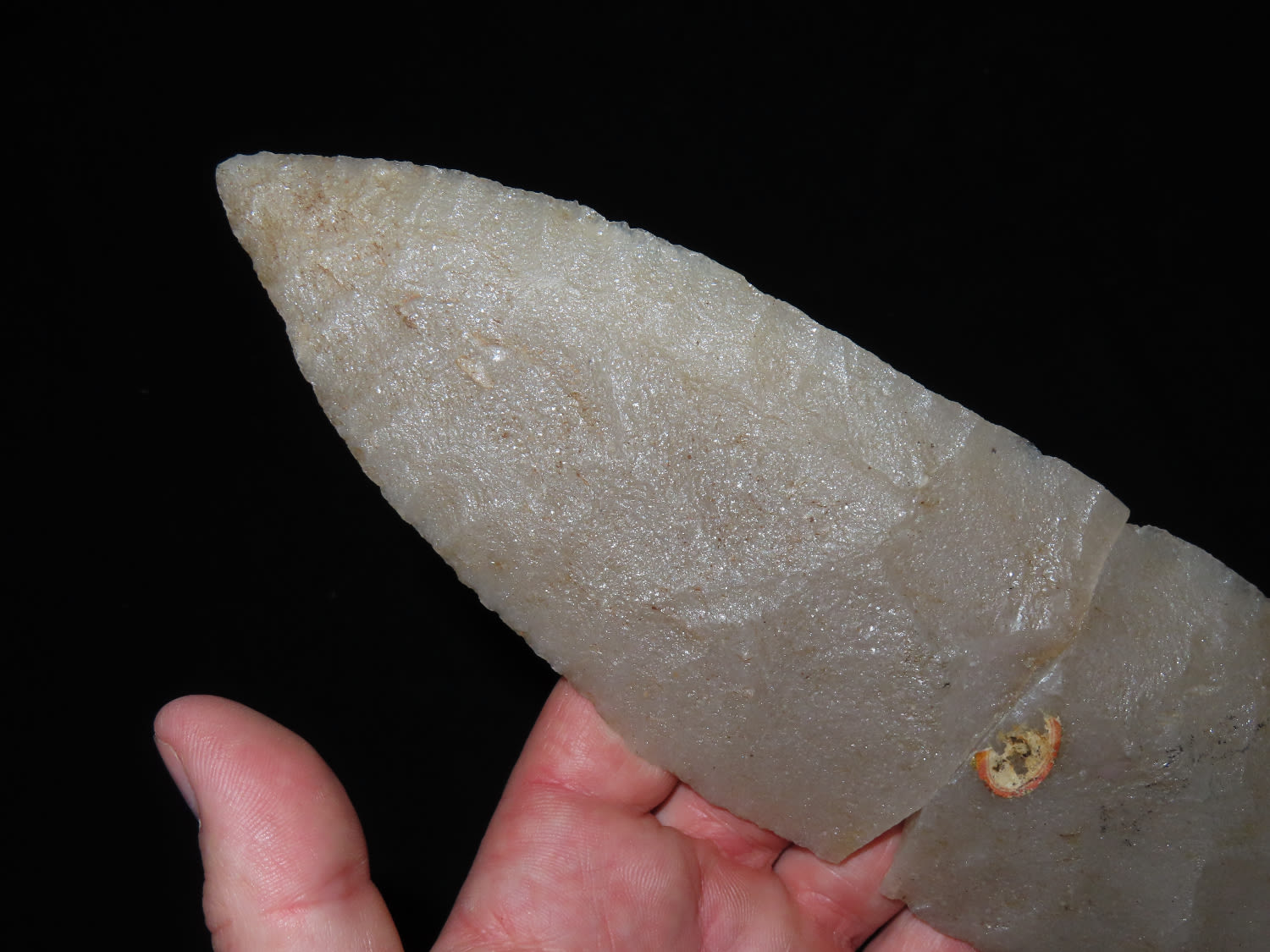 MASSIVE 9 3/4″ EARLY HIXTON KNIFE, DICKEY COA, FOUND IN WALWORTH COUNTY WISCONSIN IN 1943 BY JOHN UTTER NEAR DELAVAN LANE, HUGE EXAMPLE THAT IS VERY THIN AND WELL FLAKED, BROKEN AND GLUED IN THE CENTER