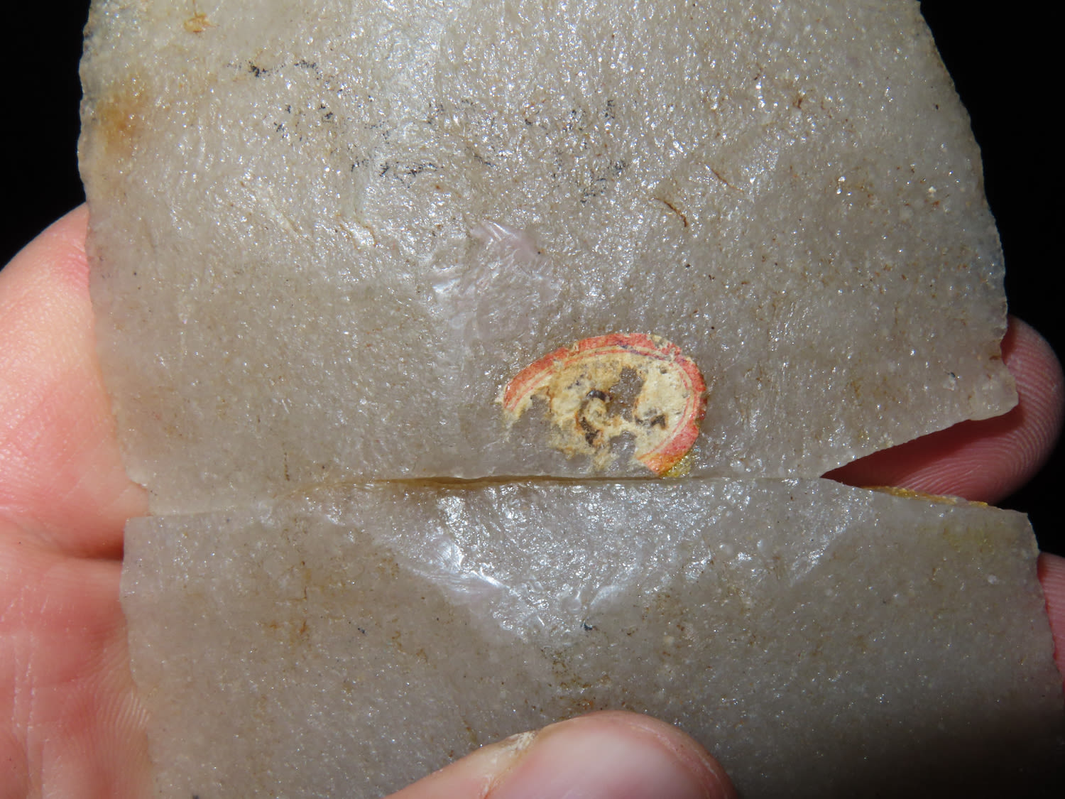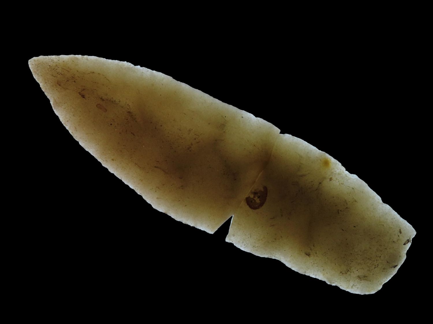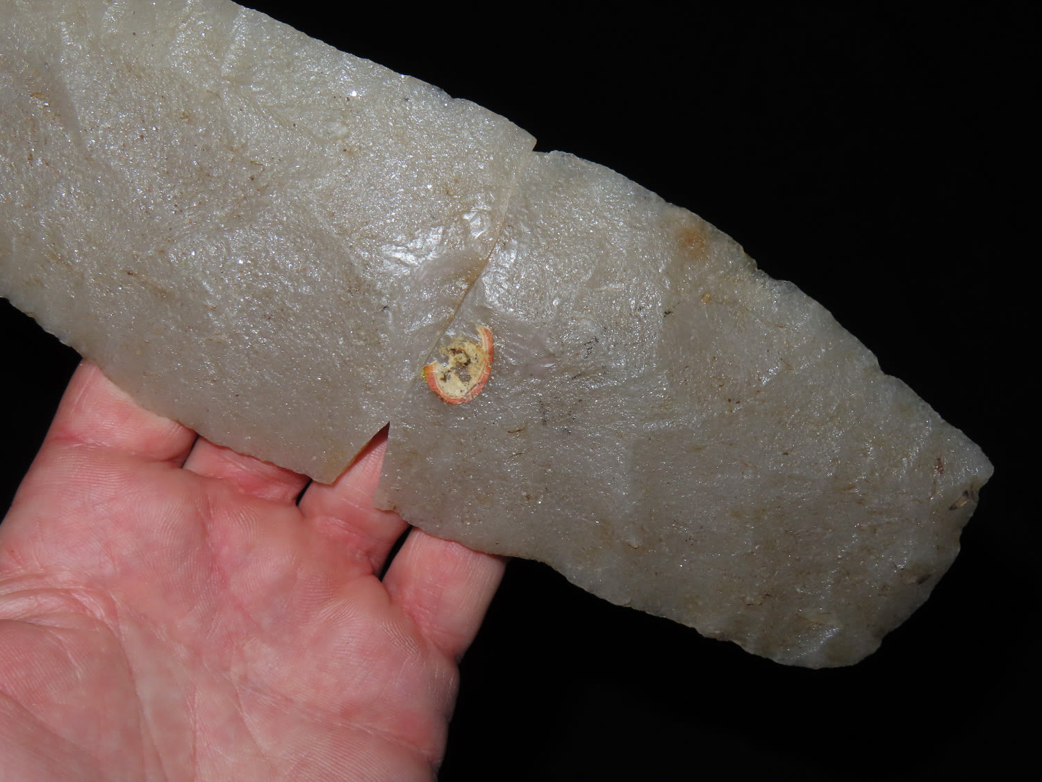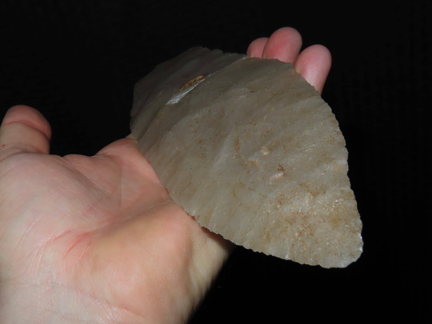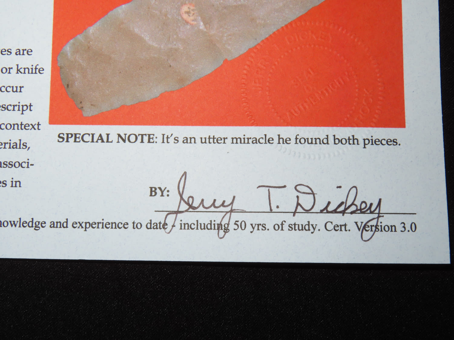 MASSIVE 9 3/4″ EARLY HIXTON KNIFE, DICKEY COA, FOUND IN WALWORTH COUNTY WISCONSIN IN 1943 BY JOHN UTTER NEAR DELAVAN LANE, HUGE EXAMPLE THAT IS VERY THIN AND WELL FLAKED, BROKEN AND GLUED IN THE CENTER