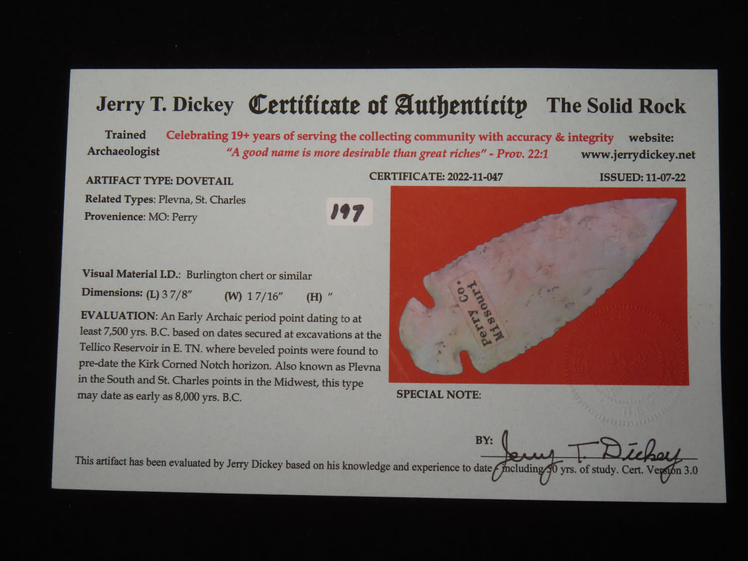 3 7/8″ PHENOMENAL DOVETAIL, DICKEY COA, FOUND IN PERRY COUNTY MISSOURI, JUST AN INCREDIBLE EXAMPLE, GREAT CLASSIC FORM, VERY THIN AND WELL MADE, NICE NO BRAINER PATINA AND NO DAMAGE. MEASURES 3 7/8″ LONG, TRULY AN INVESTMENT GRADE RELIC.