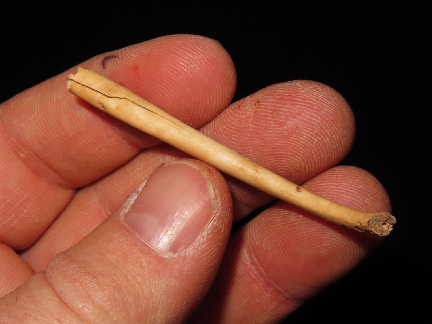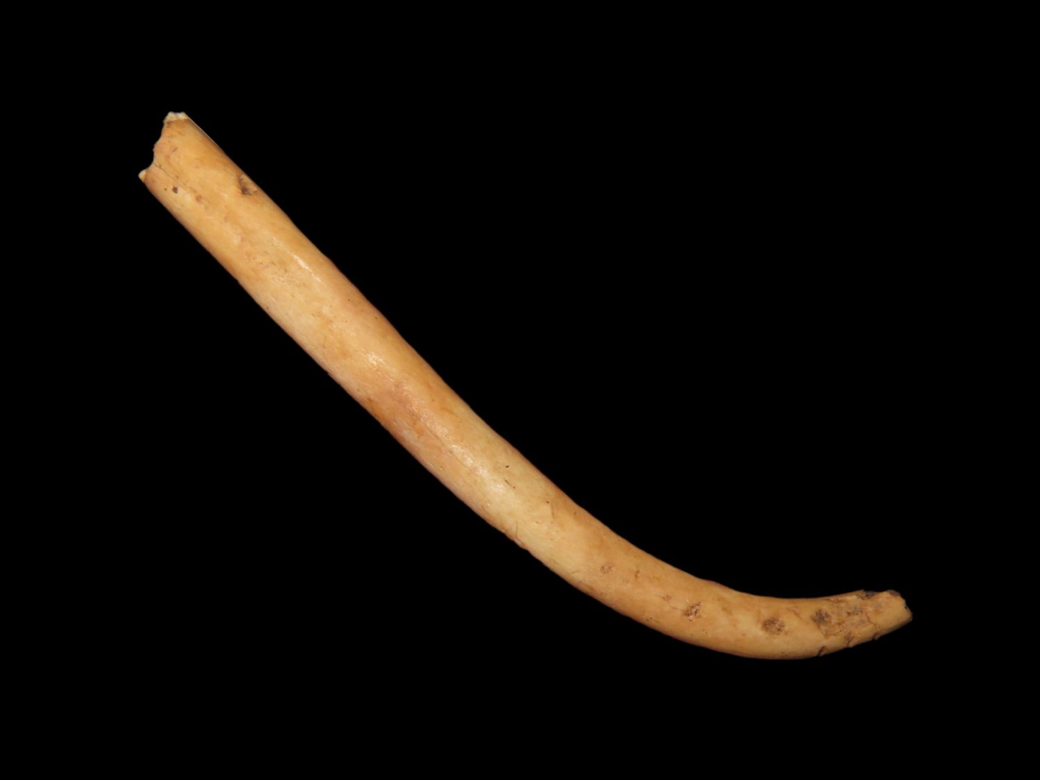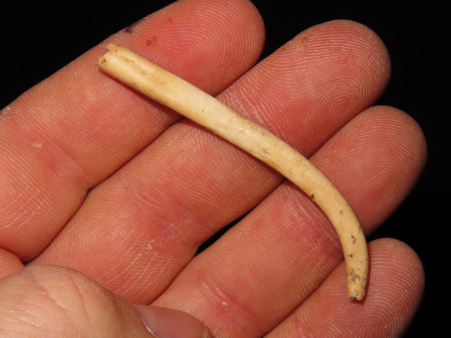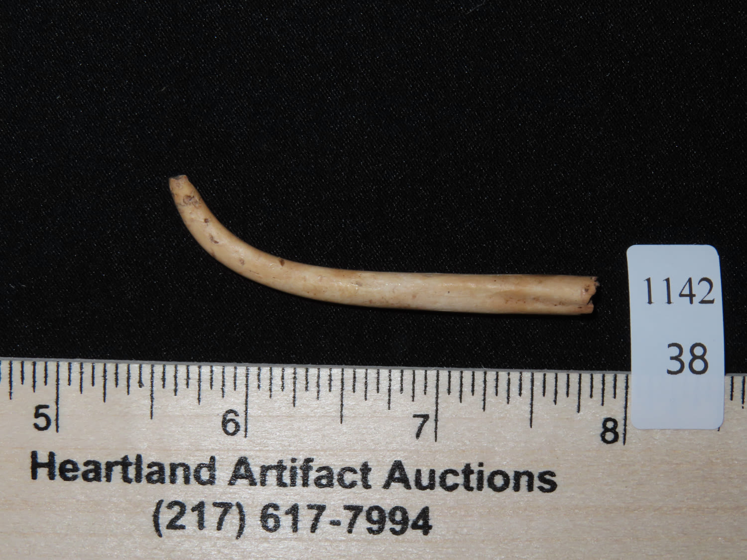2 5/16″ DRILLED, SHAPED & POLISHED RACCOON BACCULA, BROKEN AT HOLE, FOUND AT THE DUFFY SITE IN GALLATIN COUNTY ILLINOIS BY TOM HAGGERMAN