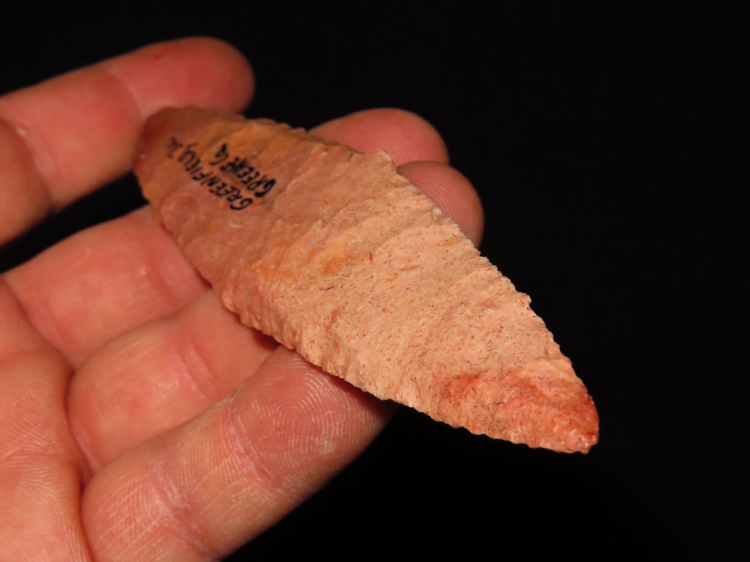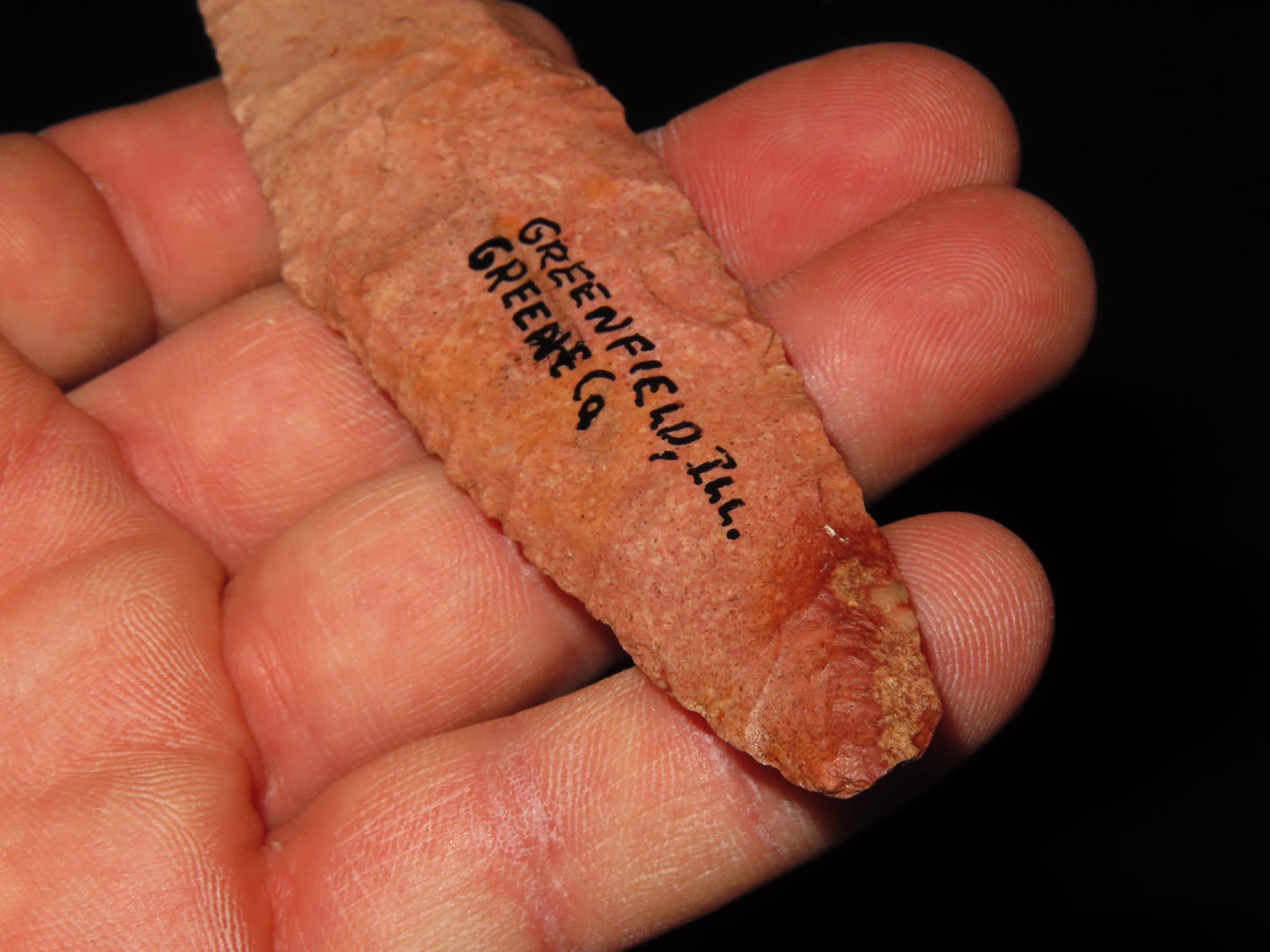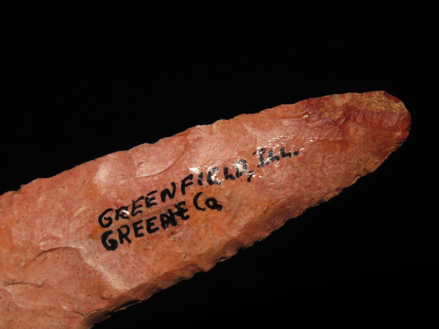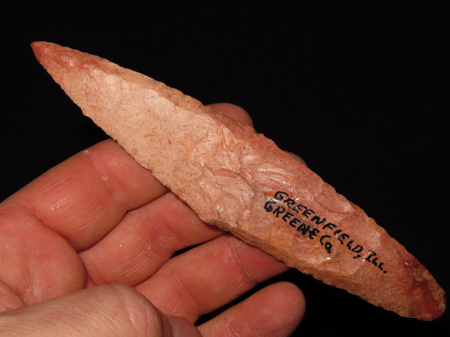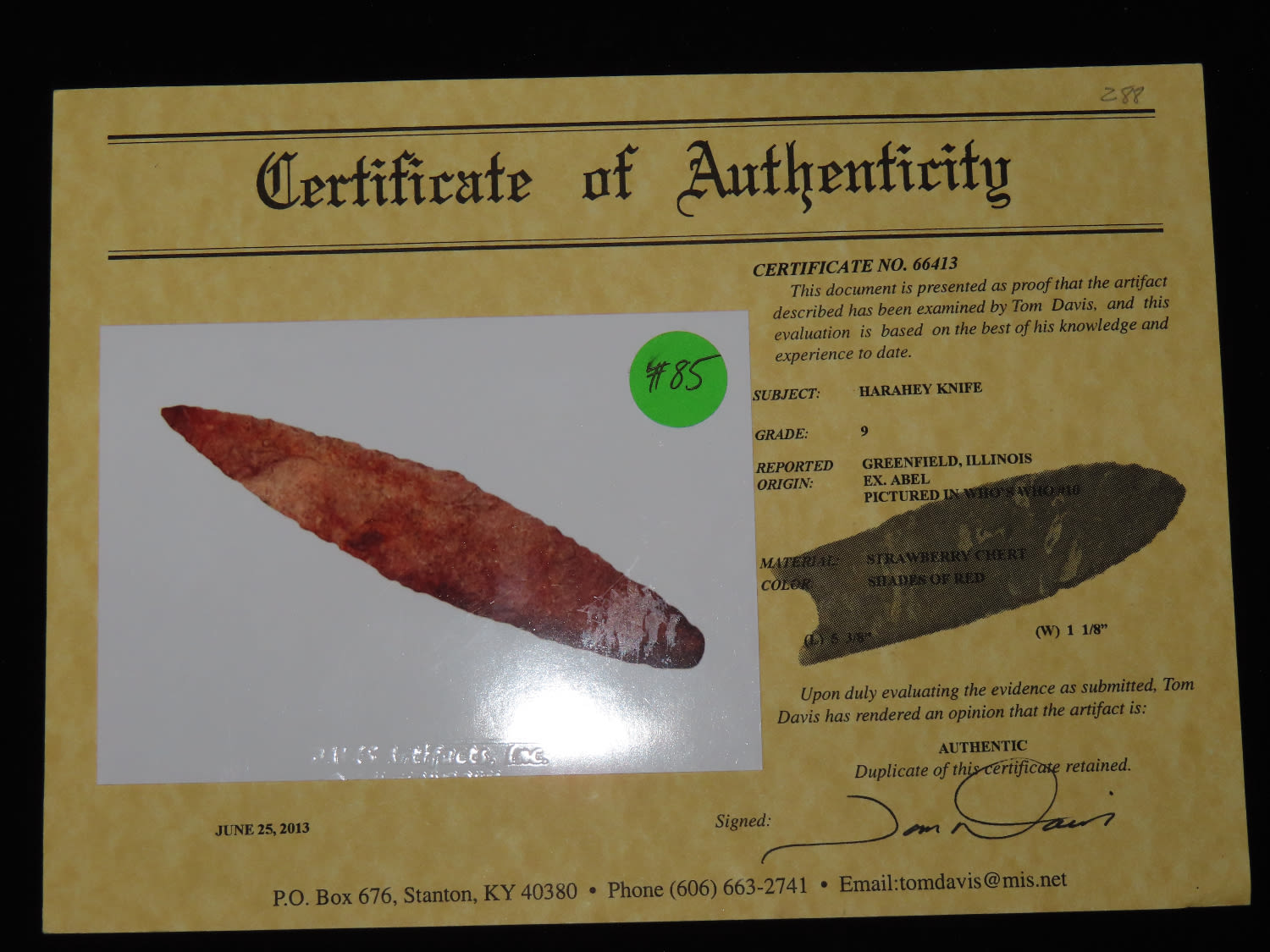 5 3/8″ COLORFUL 4-BEVEL HARAHEY KNIFE, TOM DAVIS COA, FOUND IN GREENFIELD ILLINOIS, EX FREDRICK ABEL, PICTURED IN WHOS WHO #10 ON PAGE 11