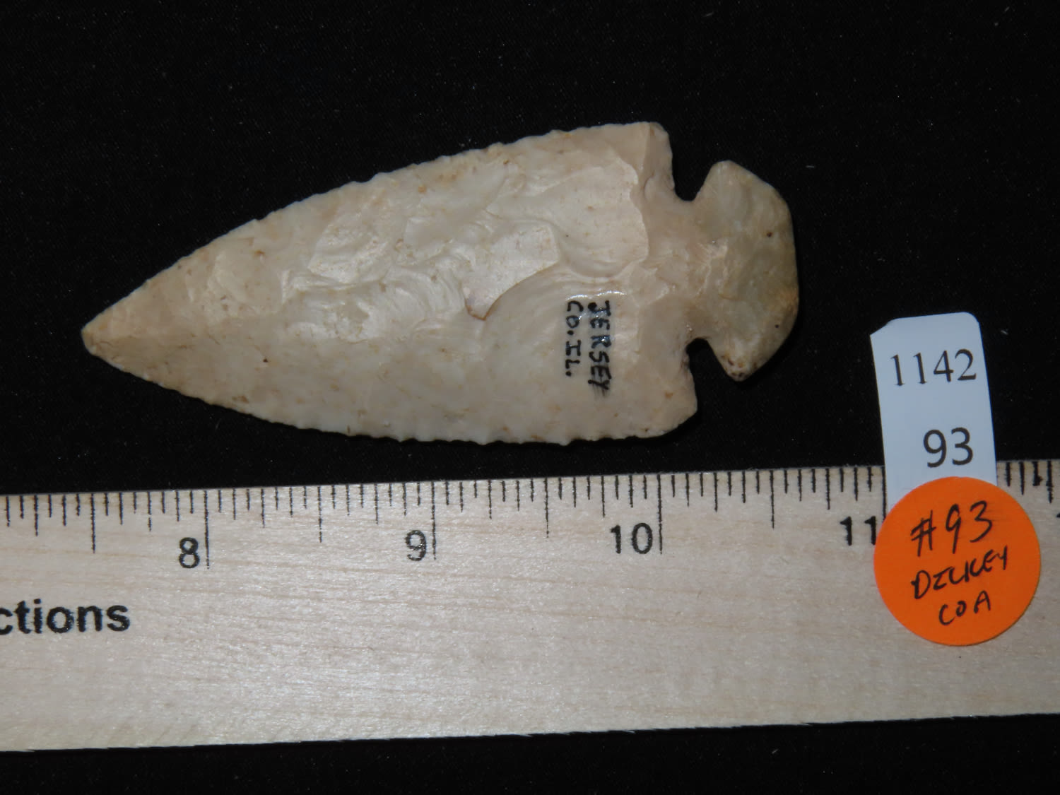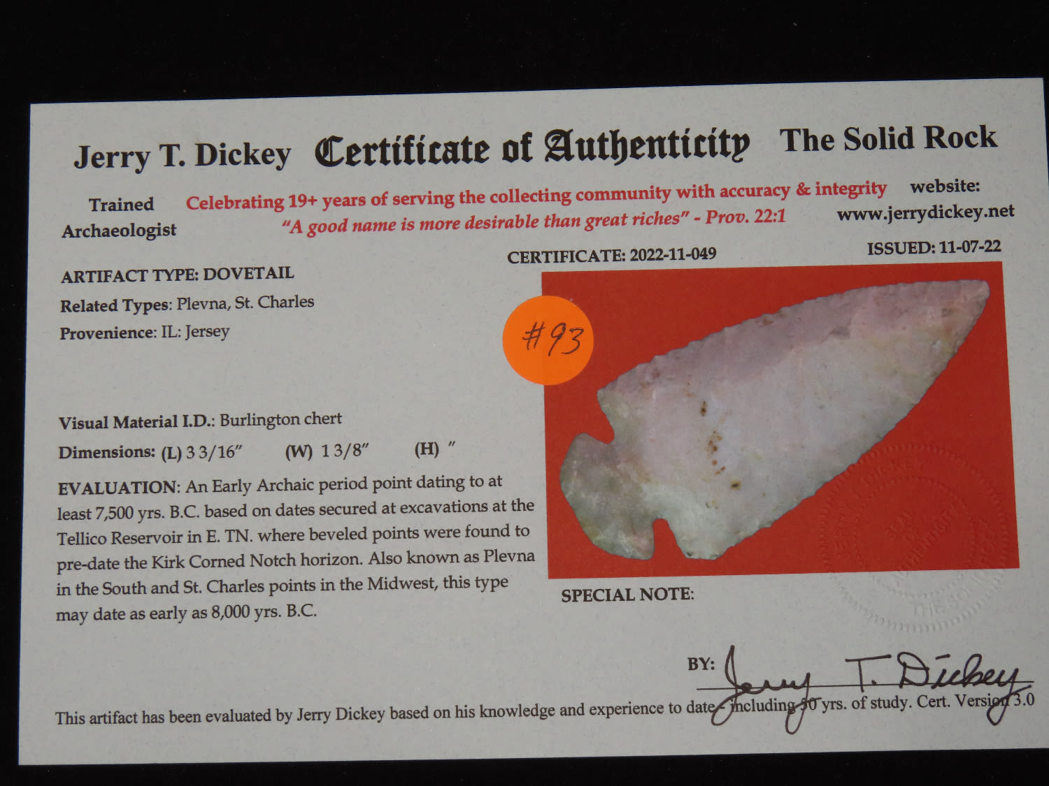 3 3/16″ OUTSTANDING DOVETAIL, DICKEY COA, FOUND IN JERSEY COUNTY ILLINOIS, EX FLOYD RITTER COLLECTION, INDIAN ARROWHEAD, ARTIFACT