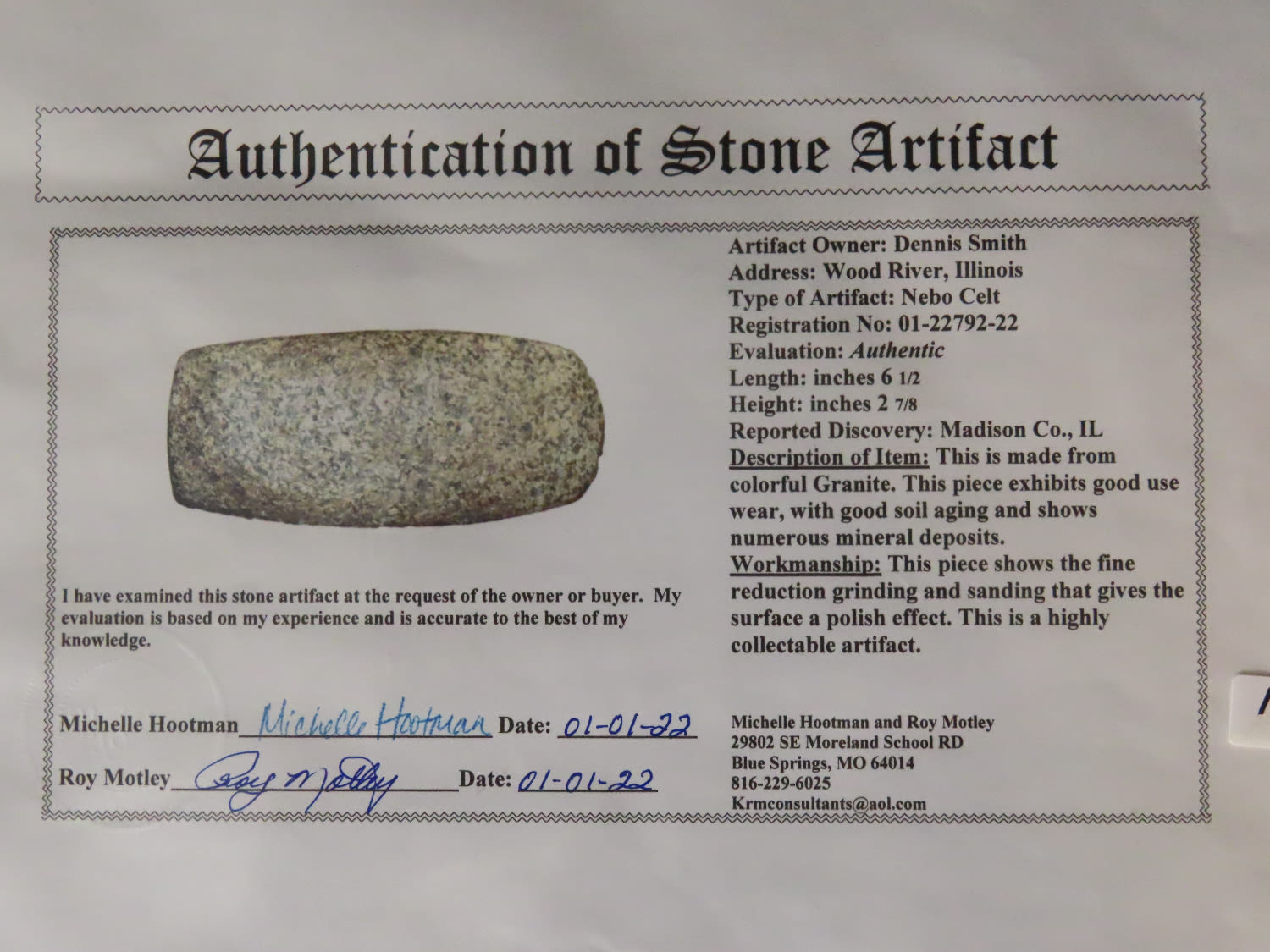 6 1/2″ Nebo Celt, Motley COA, Found in Madison Co Illinois, Nicely Polished, Square Back
