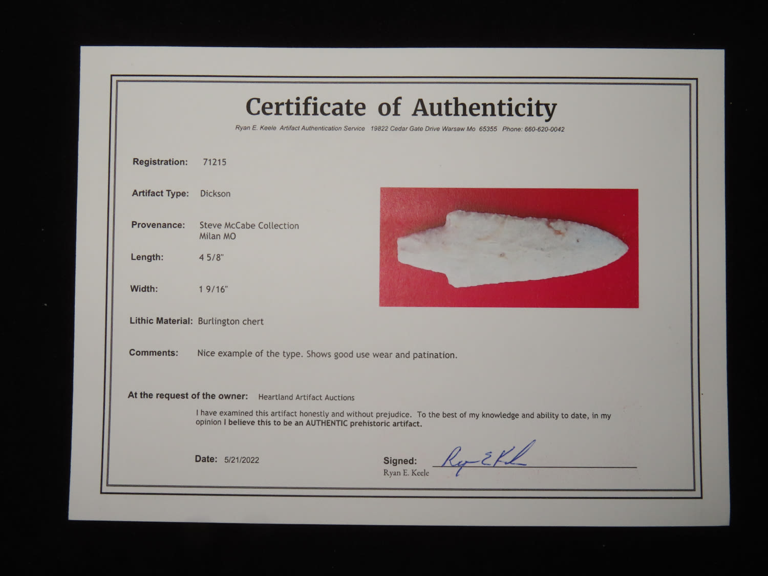 4 5/8″ Dickson, Keele COA, Ex Steve McCabe Collection, Milan, Missouri, Sullivan Co.-Expertly Flaked, Flared Ear/Square Base Variety, very thin for size
