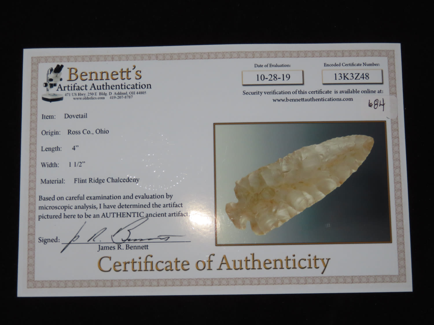 4″ Dovetail, Bennett COA, Made of Flint Ridge Chalcedony, found in Ross Co Ohio