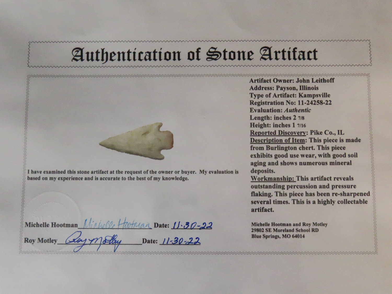 2 7/8" Picture Perfect Kampsville! Motley COA, found in Pike Co