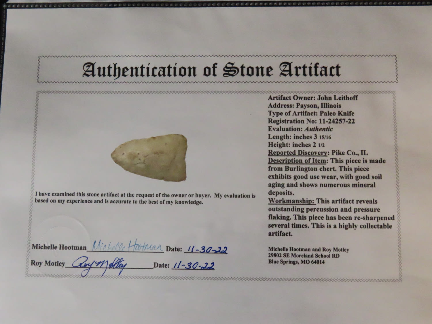 3 15/16″ Paleo Knife, Motley COA, found in Pike Co Illinois