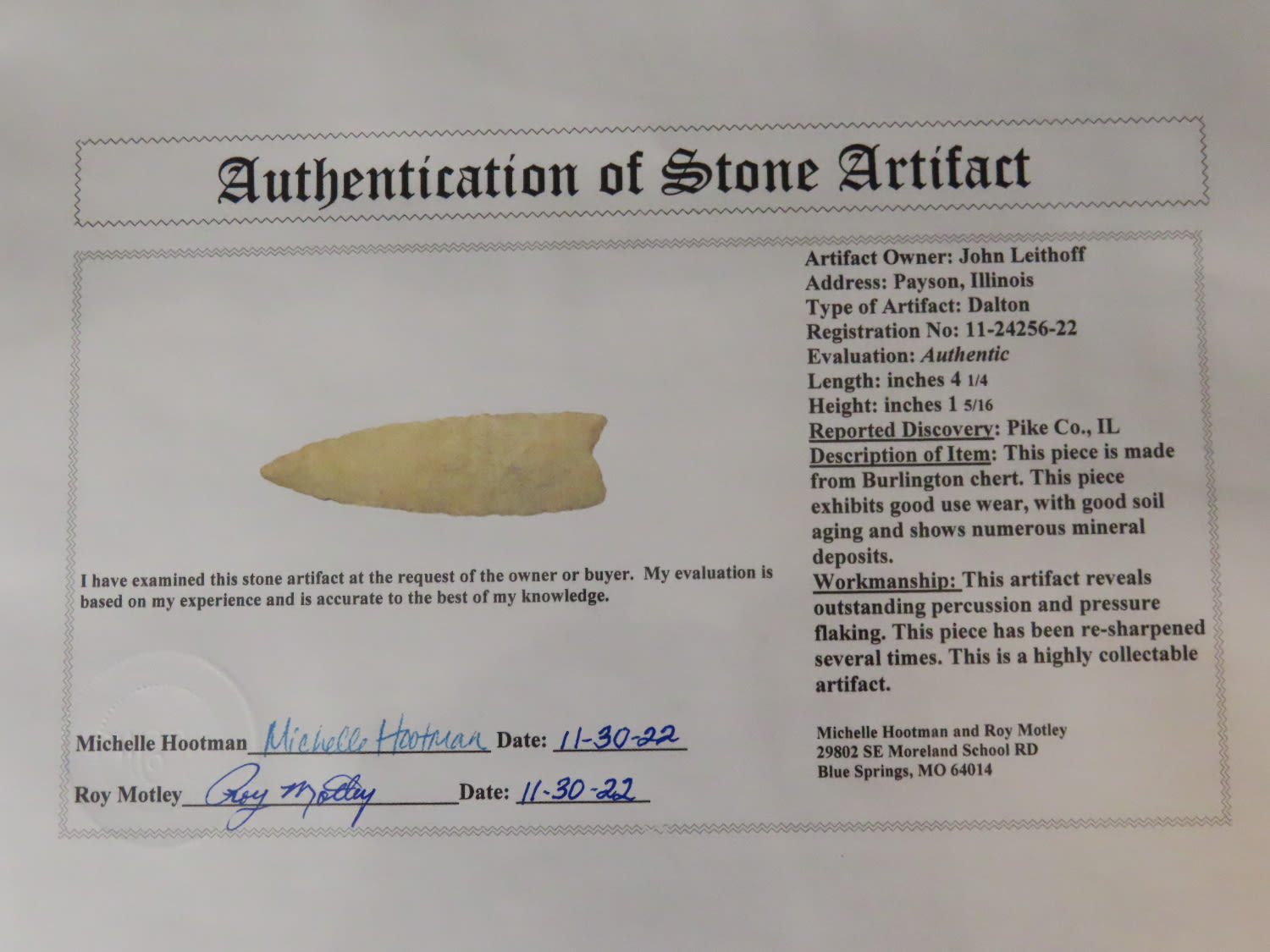 4 1/4″ Dalton, Motley COA, found in Pike Co Illinois