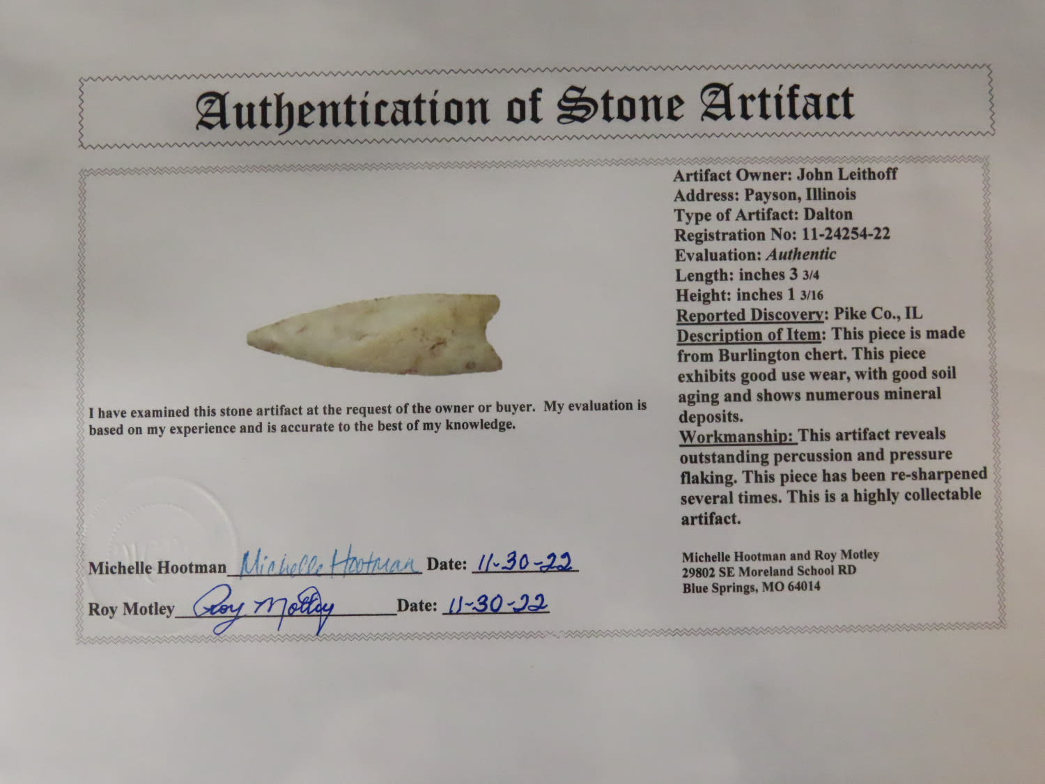 3 3/4″ Dalton, Motley COA, found in Pike Co Illinois