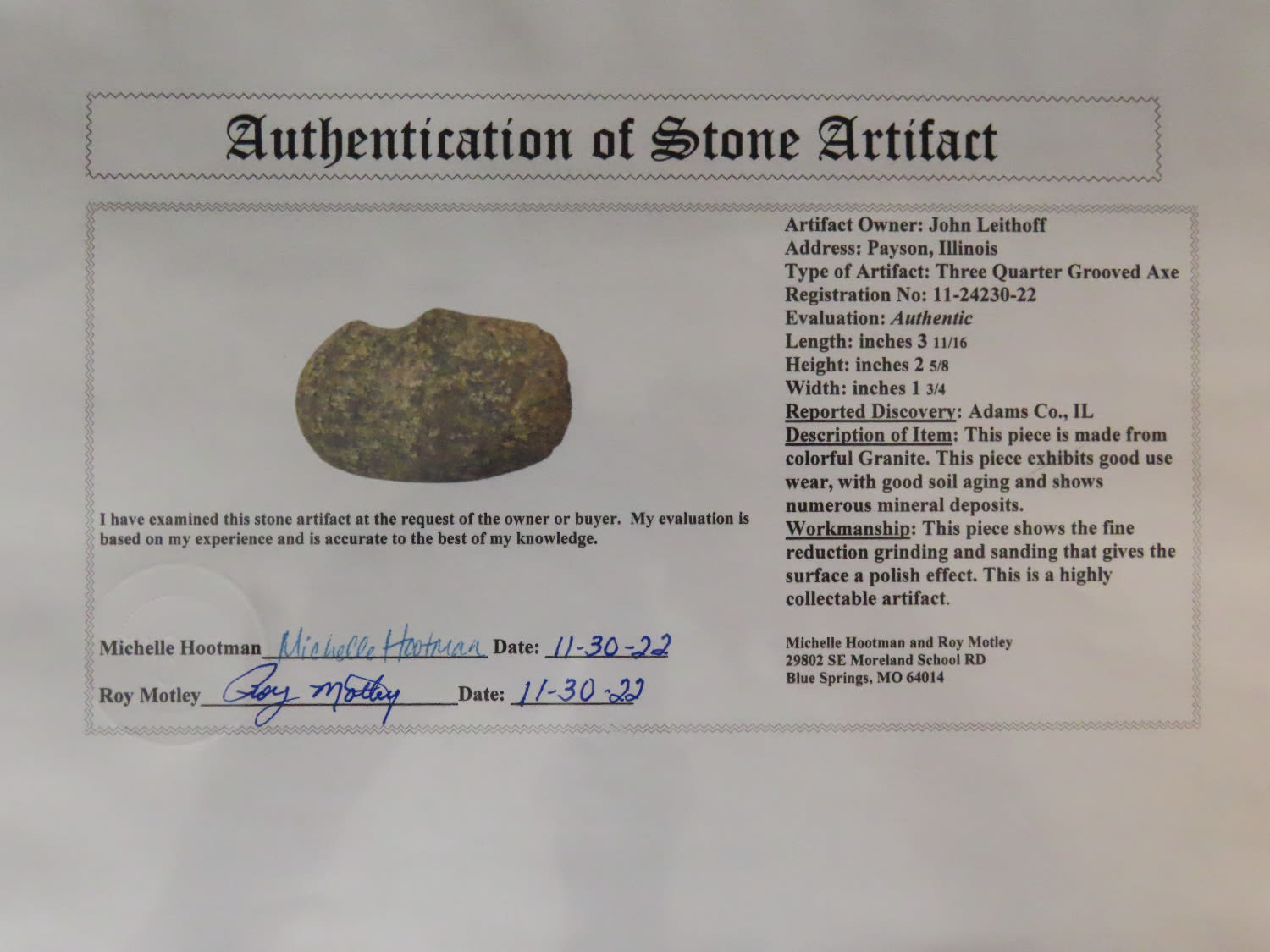 3 11/16″ 3/4 Groove Axe, Motley COA, found in Adams Co Illinois,