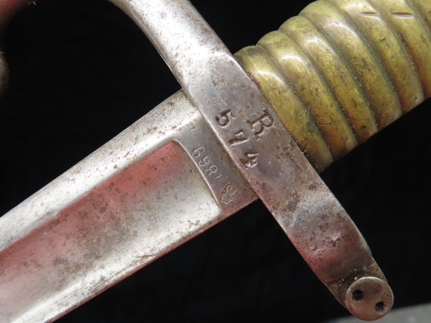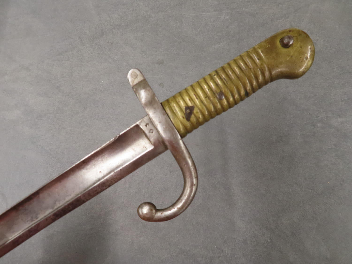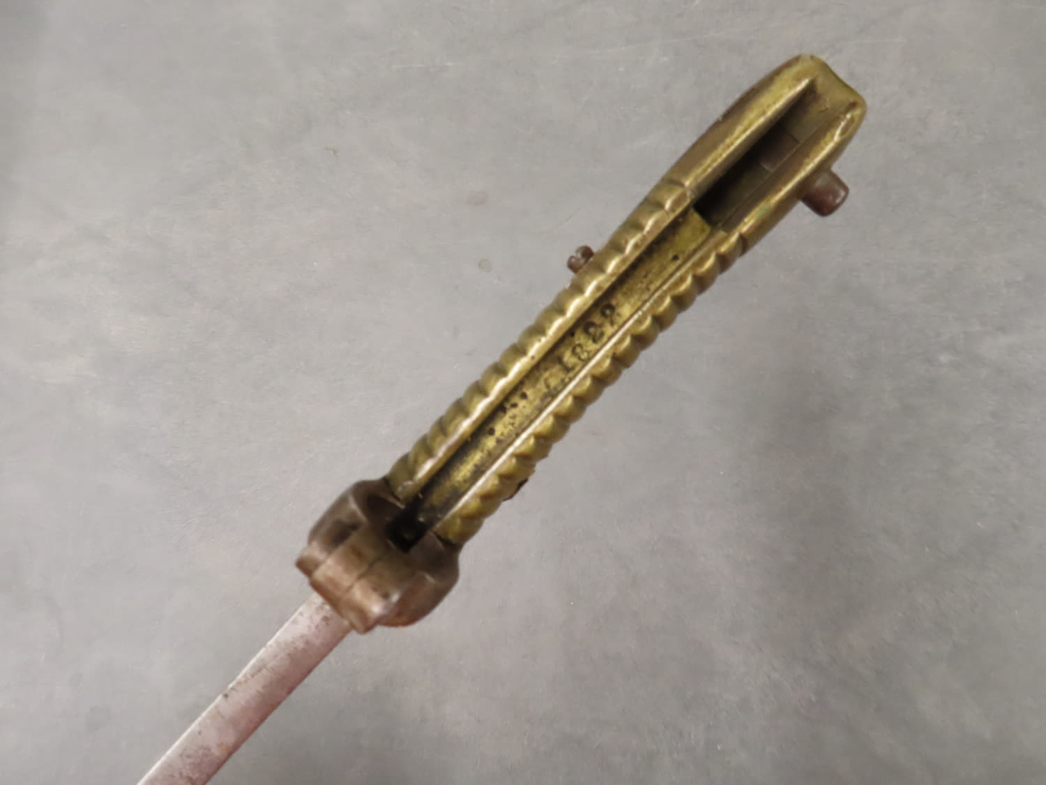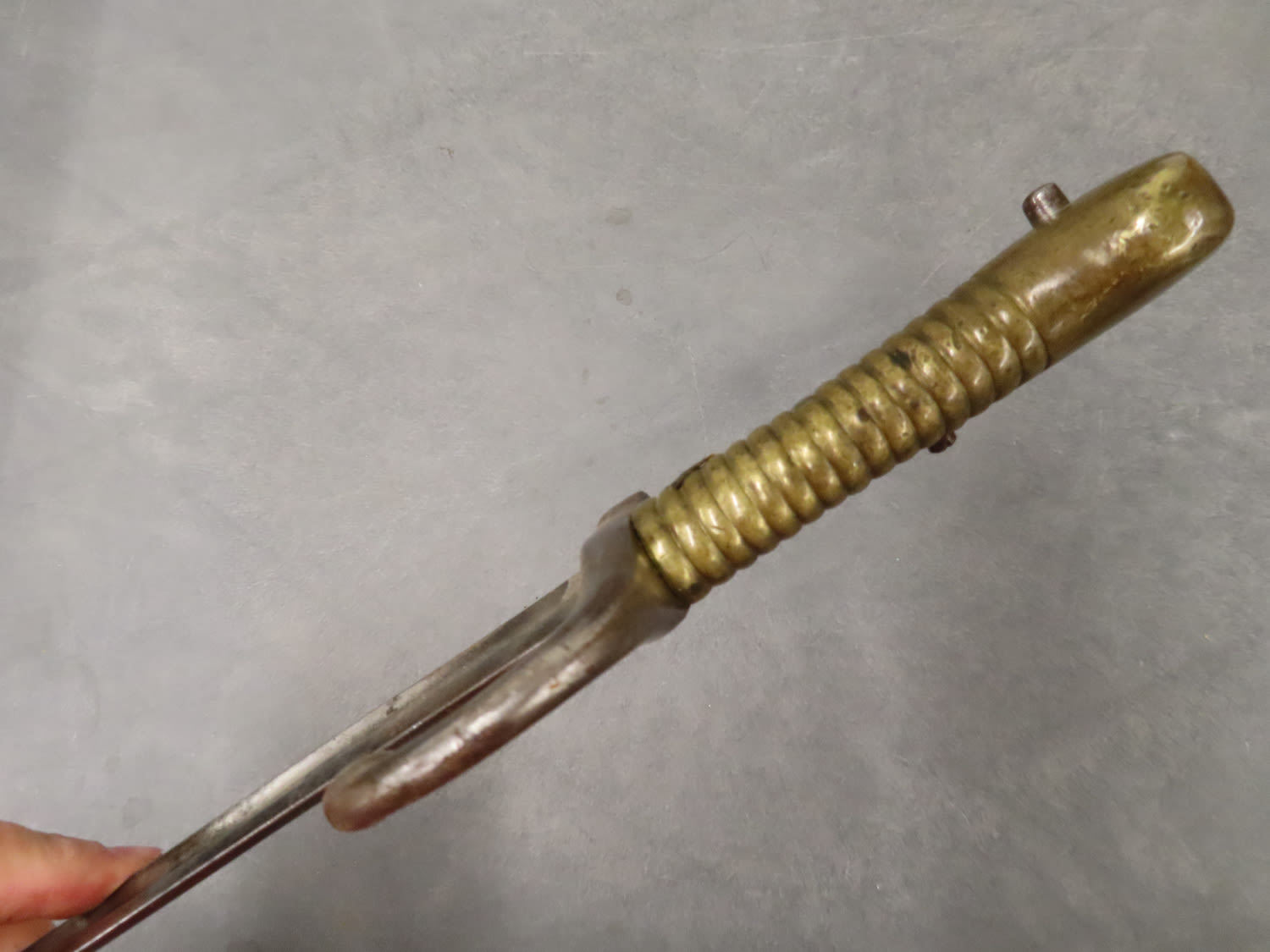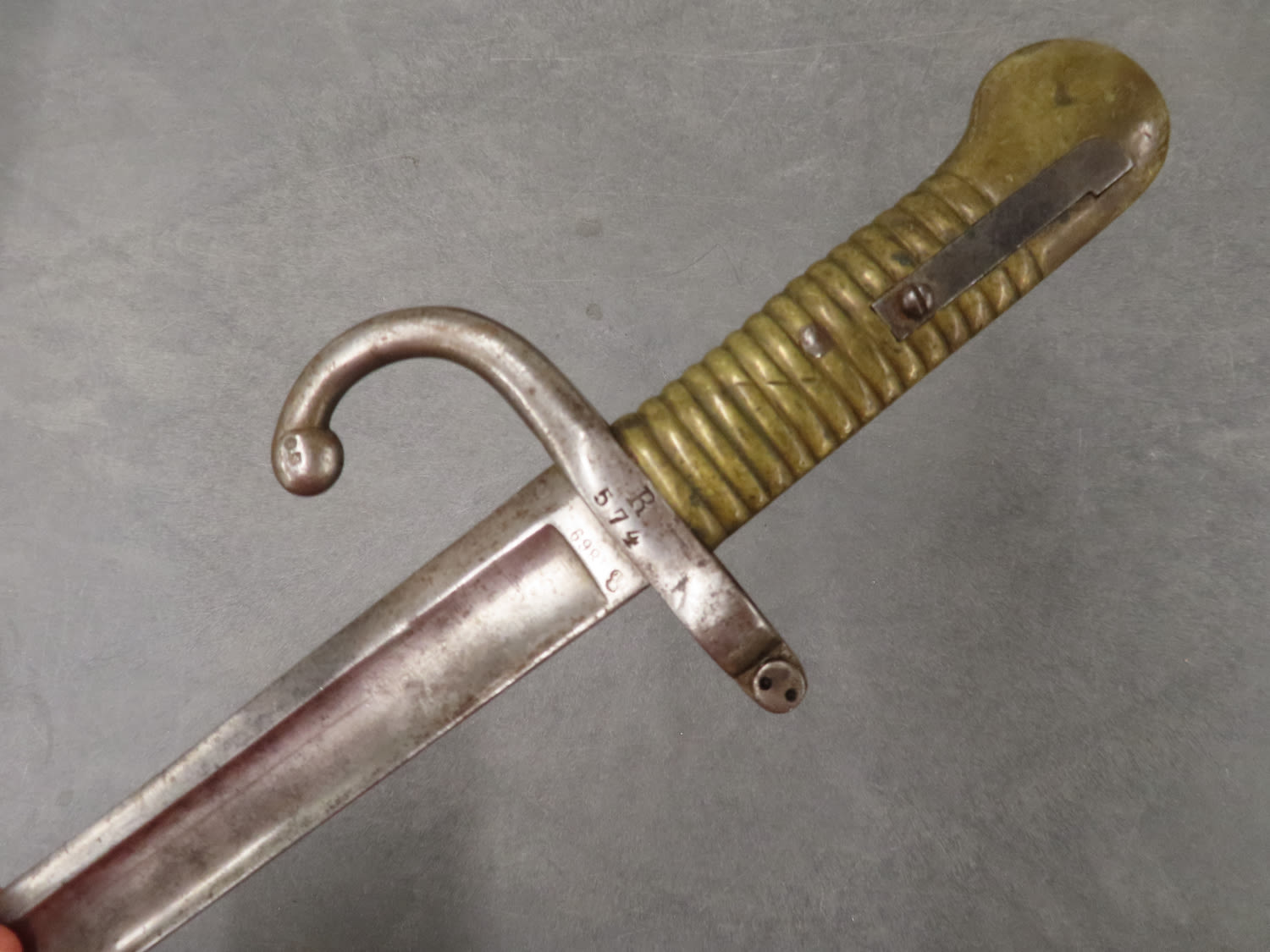 French 1870 Pattern Sword Bayonet w/ Brass Handle Marked on one face with a maker stamp and 3, on the other we have a maker cartoos 6981 R 574, then on the handle guard there are 2 more cartoos. 27 1/4″ Overall, 22 1/2″ Blade. 1822 Stamped inside handle