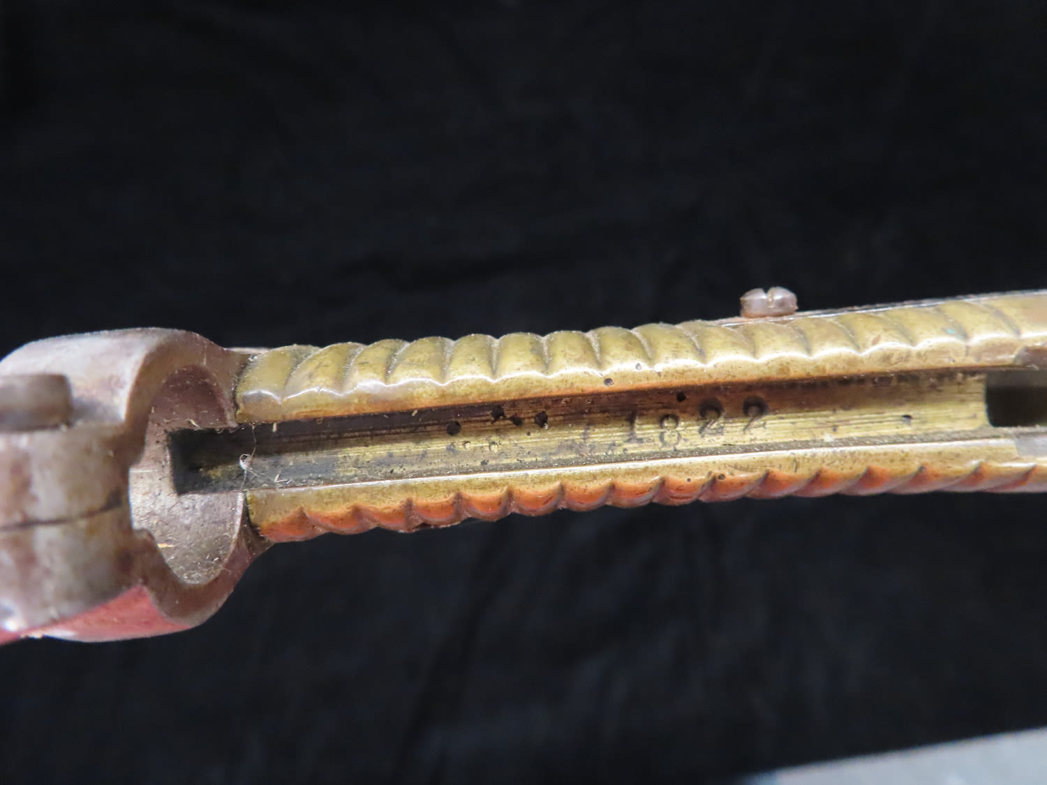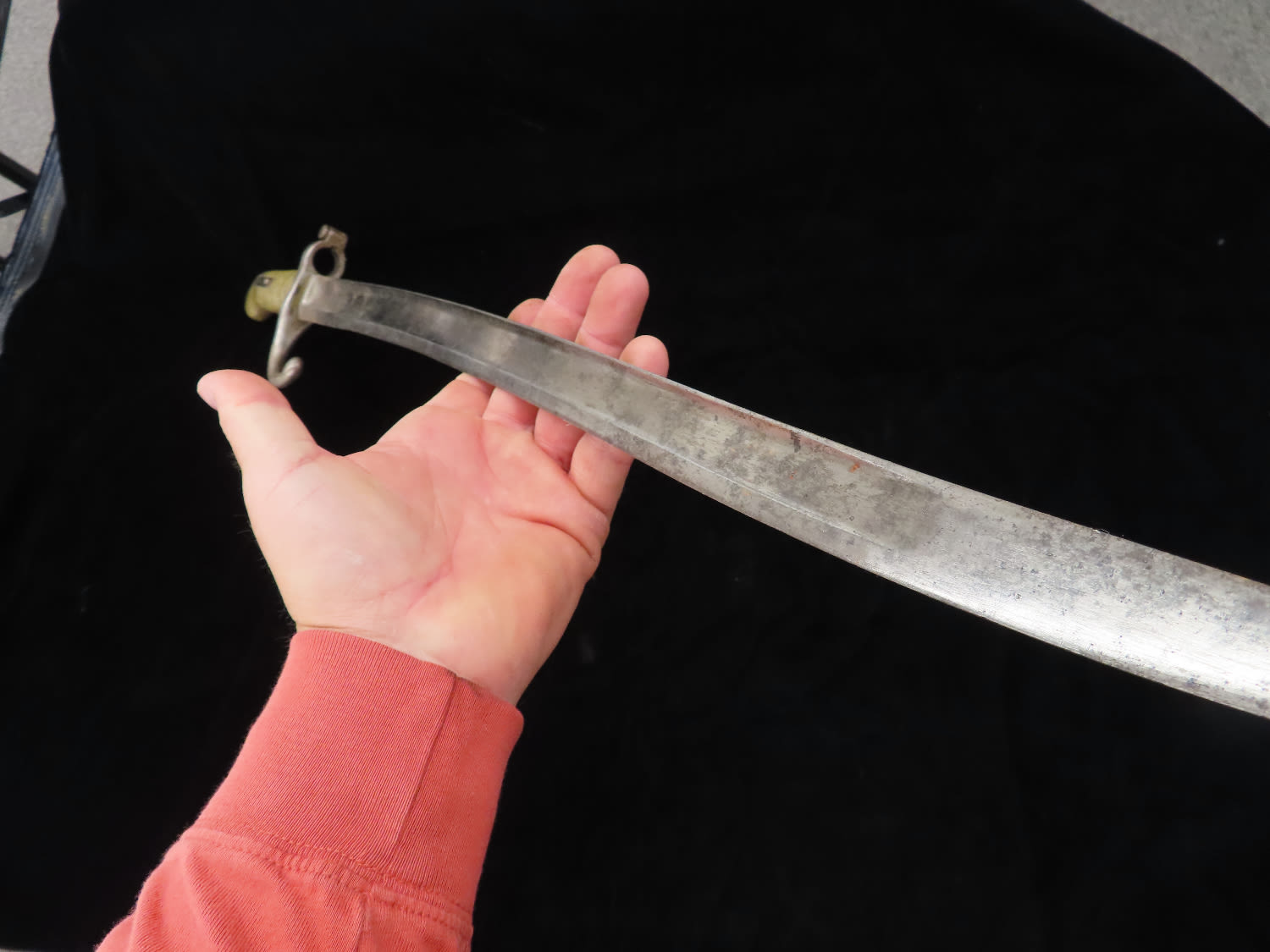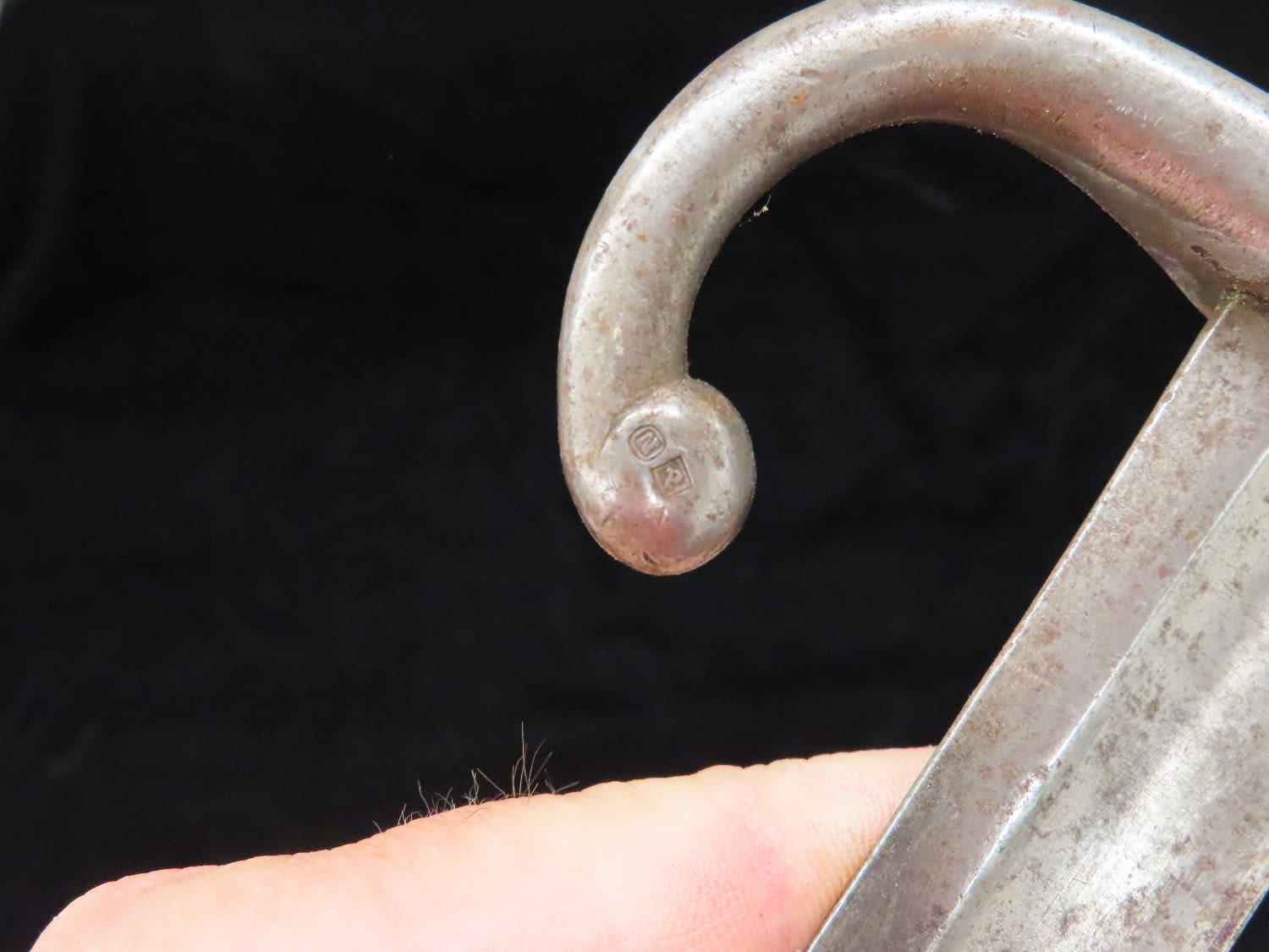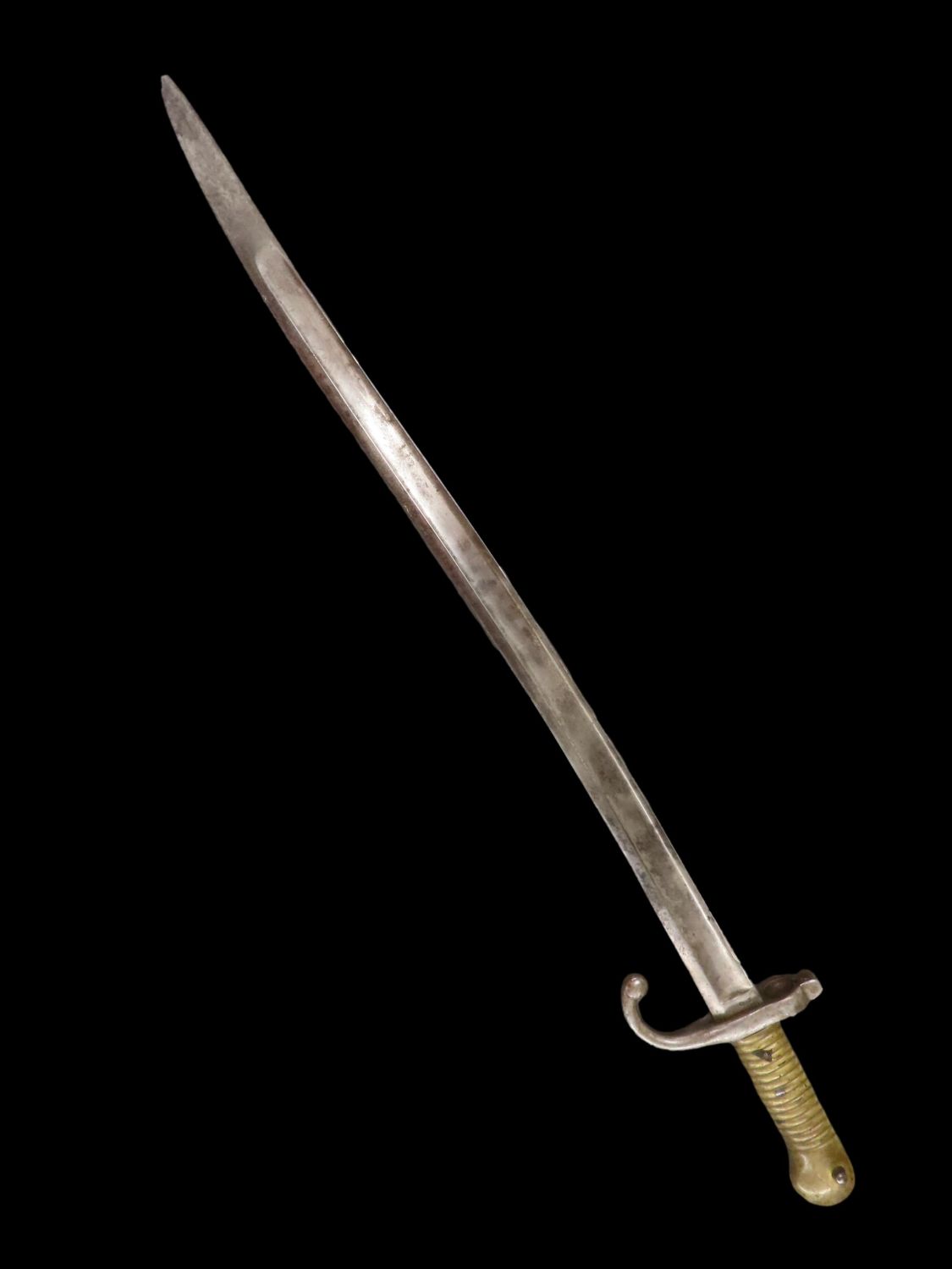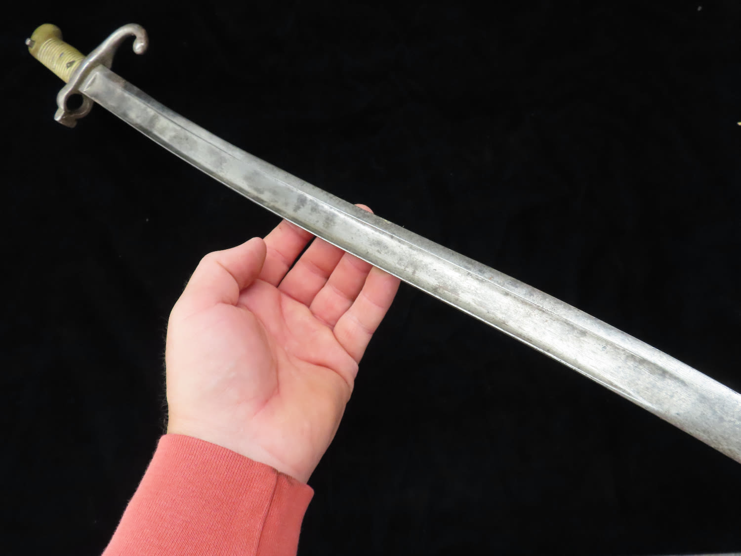 French 1870 Pattern Sword Bayonet w/ Brass Handle Marked on one face with a maker stamp and 3, on the other we have a maker cartoos 6981 R 574, then on the handle guard there are 2 more cartoos. 27 1/4″ Overall, 22 1/2″ Blade. 1822 Stamped inside handle