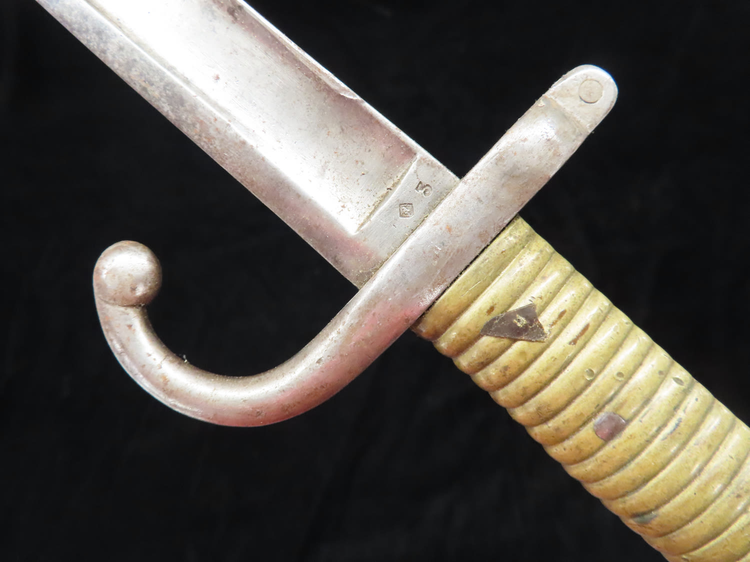 French 1870 Pattern Sword Bayonet w/ Brass Handle Marked on one face with a maker stamp and 3, on the other we have a maker cartoos 6981 R 574, then on the handle guard there are 2 more cartoos. 27 1/4" Overall, 22 1/2" Blade. 1822 Stamped inside handle