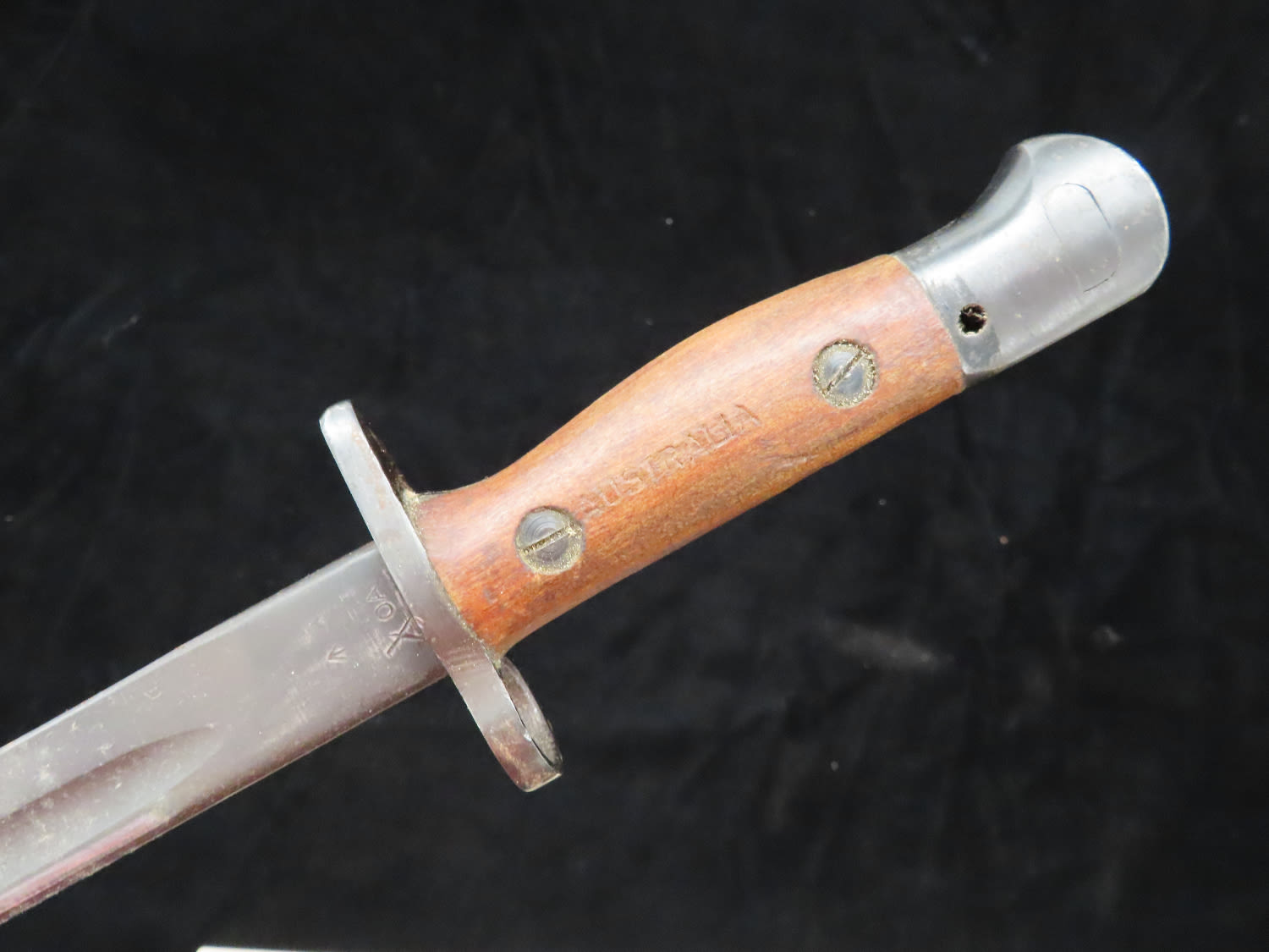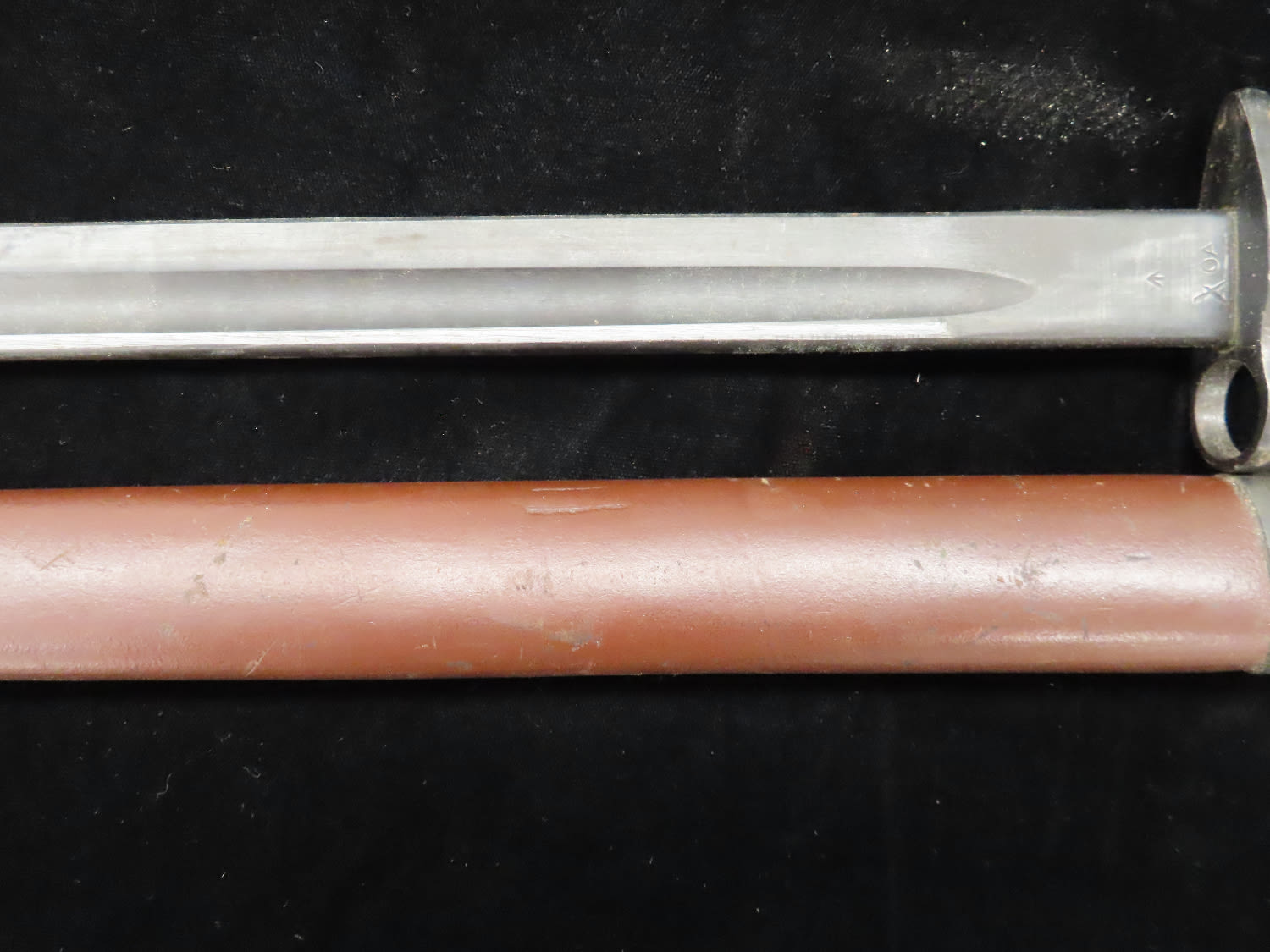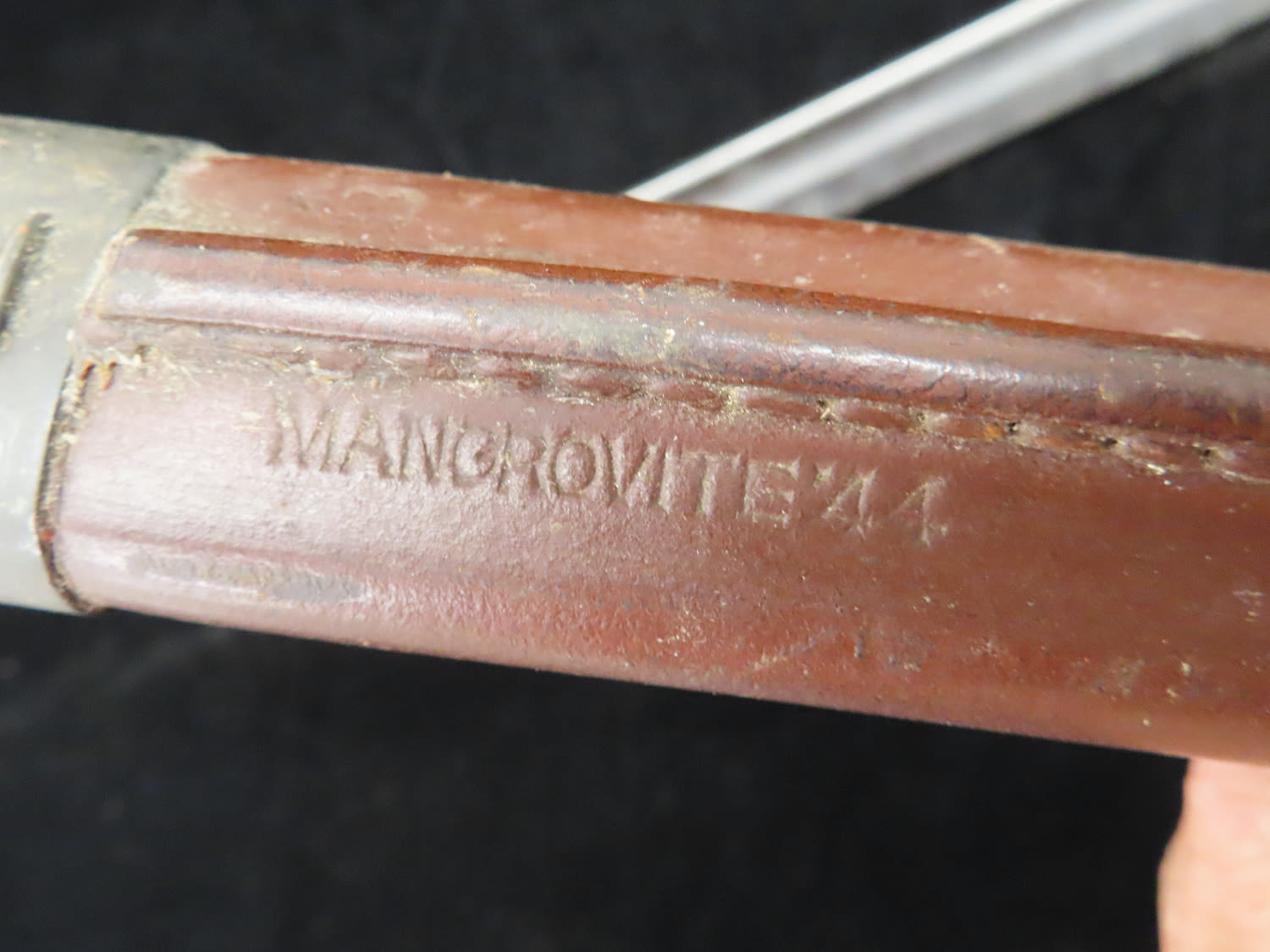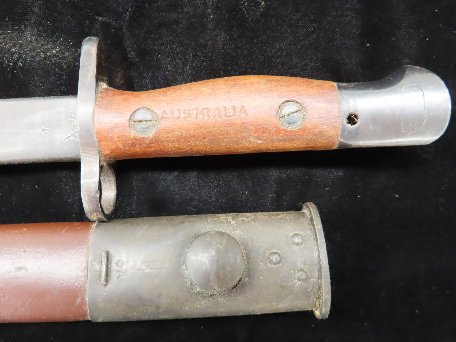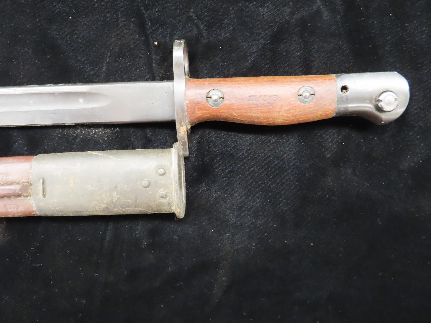 Brittish Enfield Bayonet / Scabbard Austrailian, Handles are marked Australia SLAZ 43 for Slazenger maker of grips in WWII, 21 5/8″ Overall Scabbard is marked MANGROVITE’44