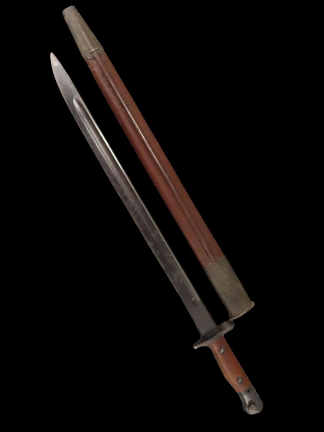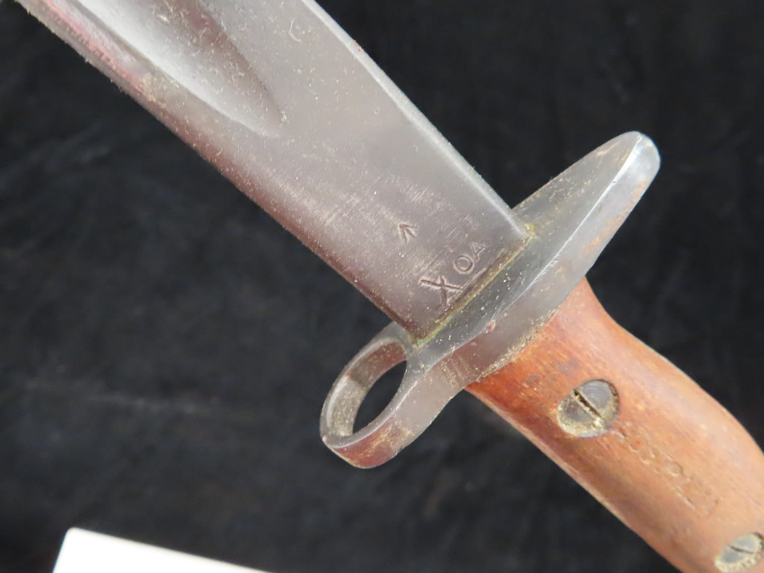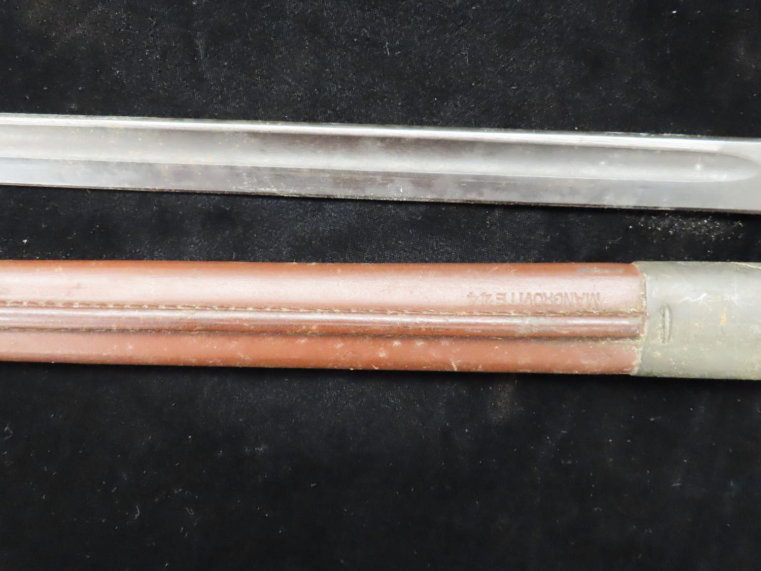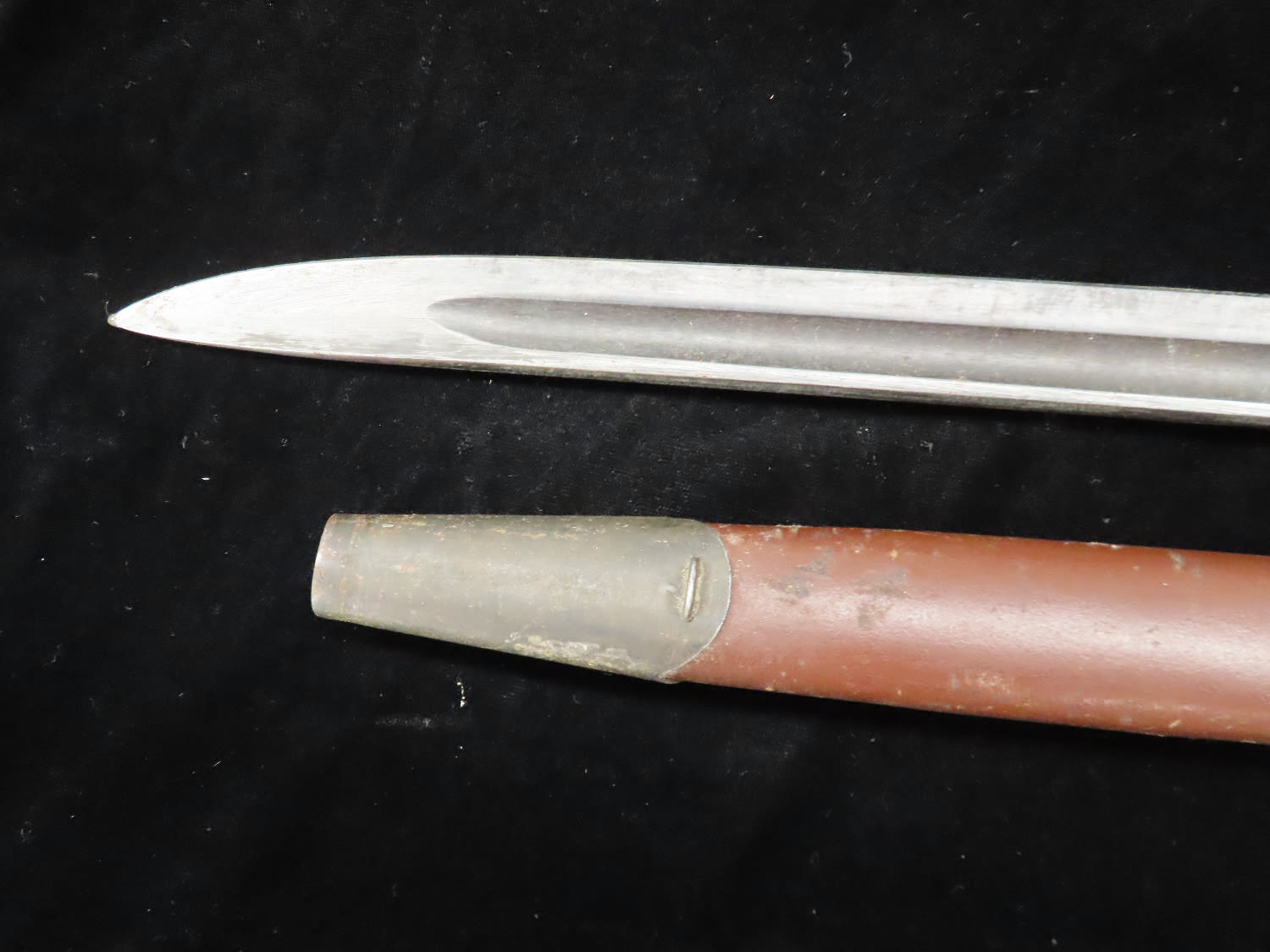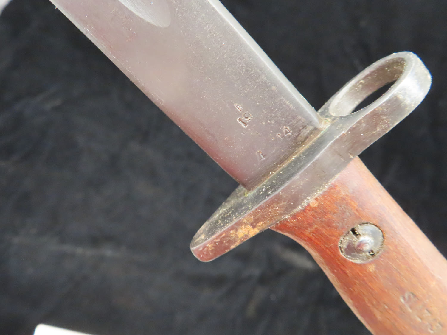 Brittish Enfield Bayonet / Scabbard Austrailian, Handles are marked Australia SLAZ 43 for Slazenger maker of grips in WWII, 21 5/8″ Overall Scabbard is marked MANGROVITE’44