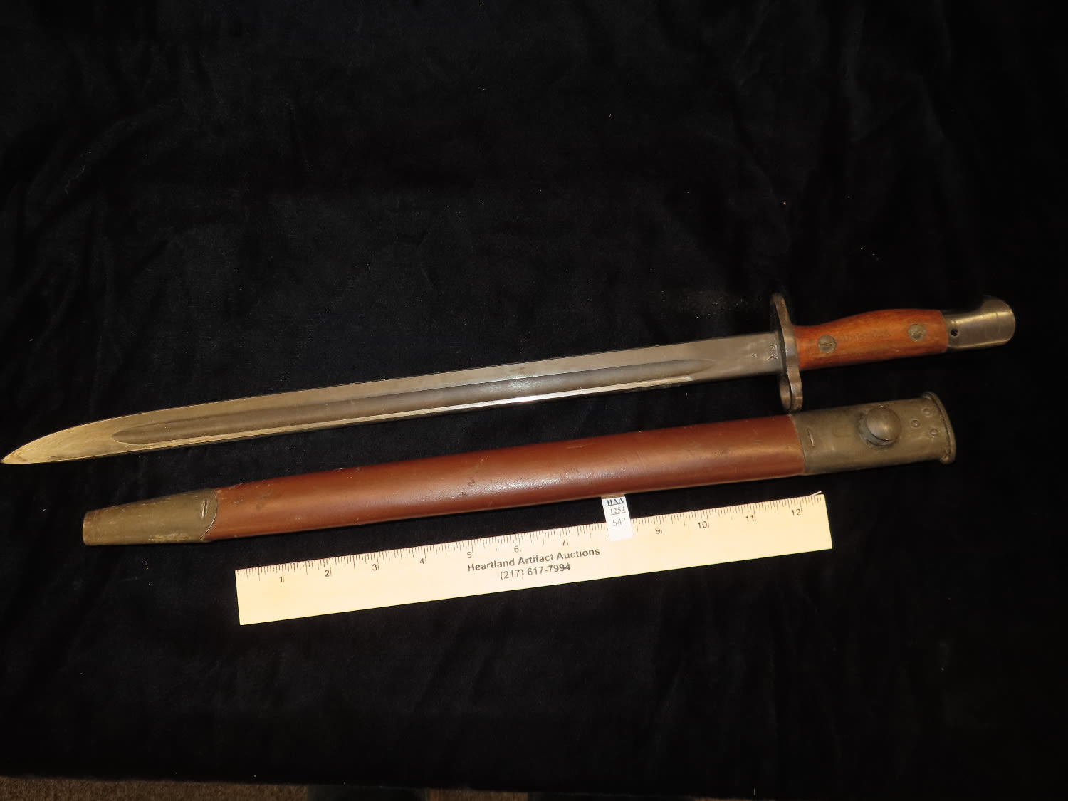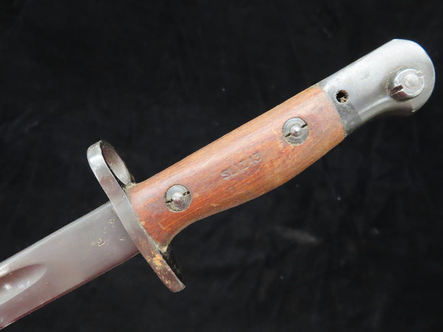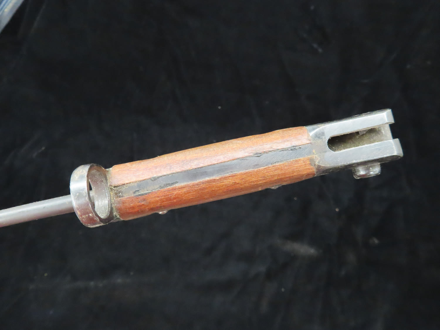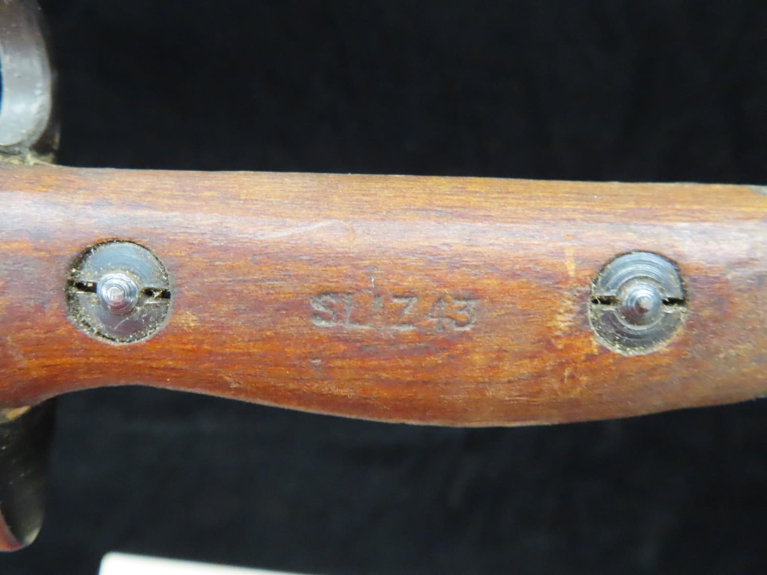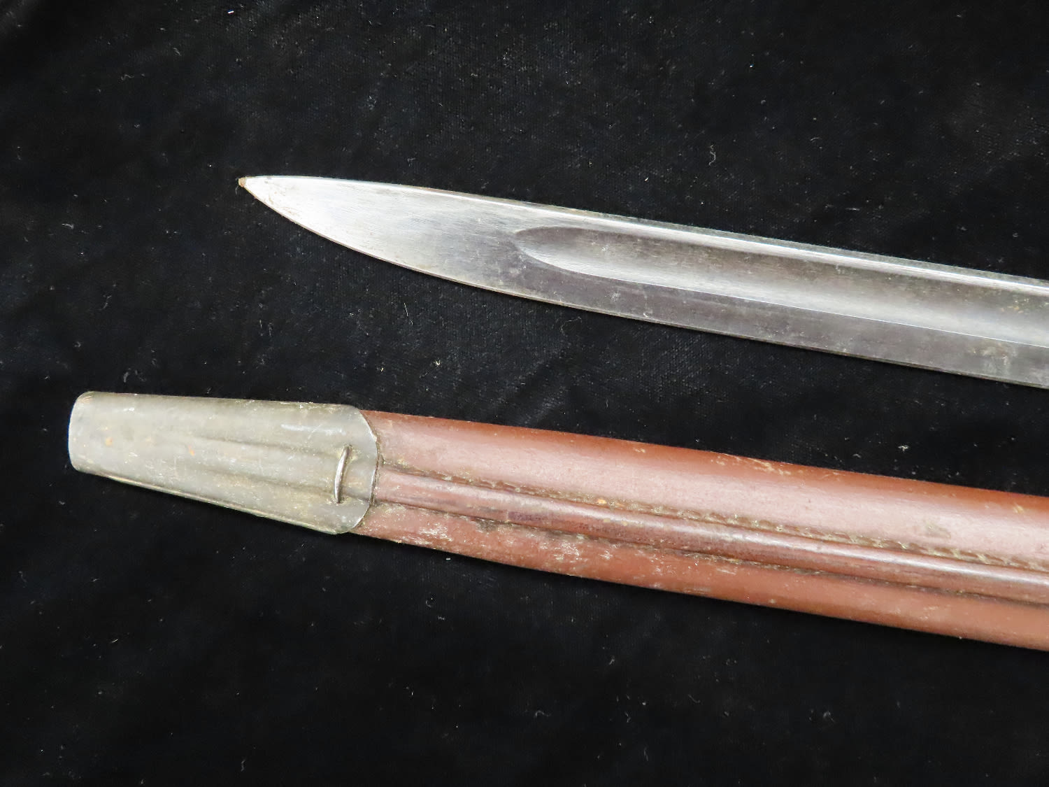Brittish Enfield Bayonet / Scabbard Austrailian, Handles are marked Australia SLAZ 43 for Slazenger maker of grips in WWII, 21 5/8″ Overall Scabbard is marked MANGROVITE’44