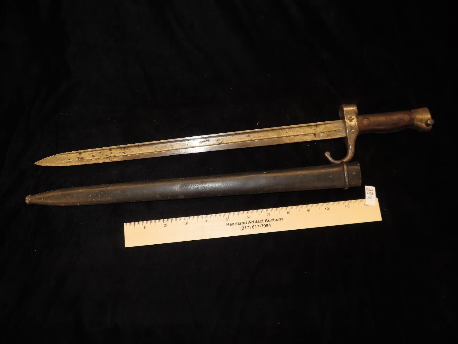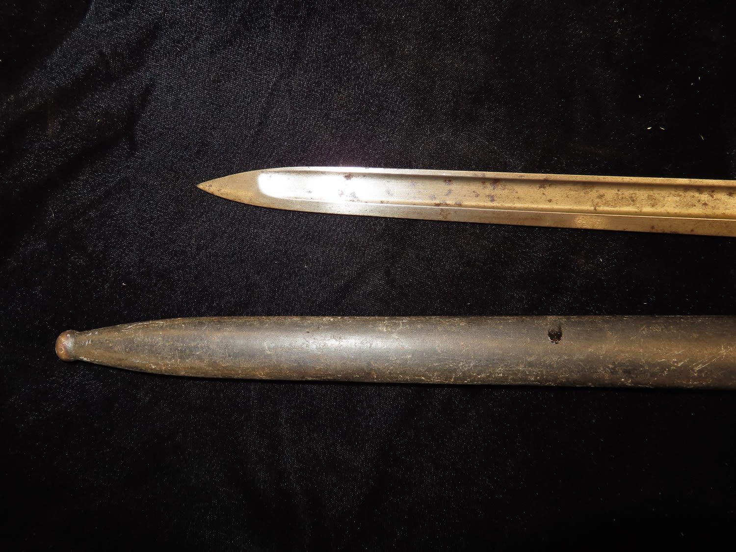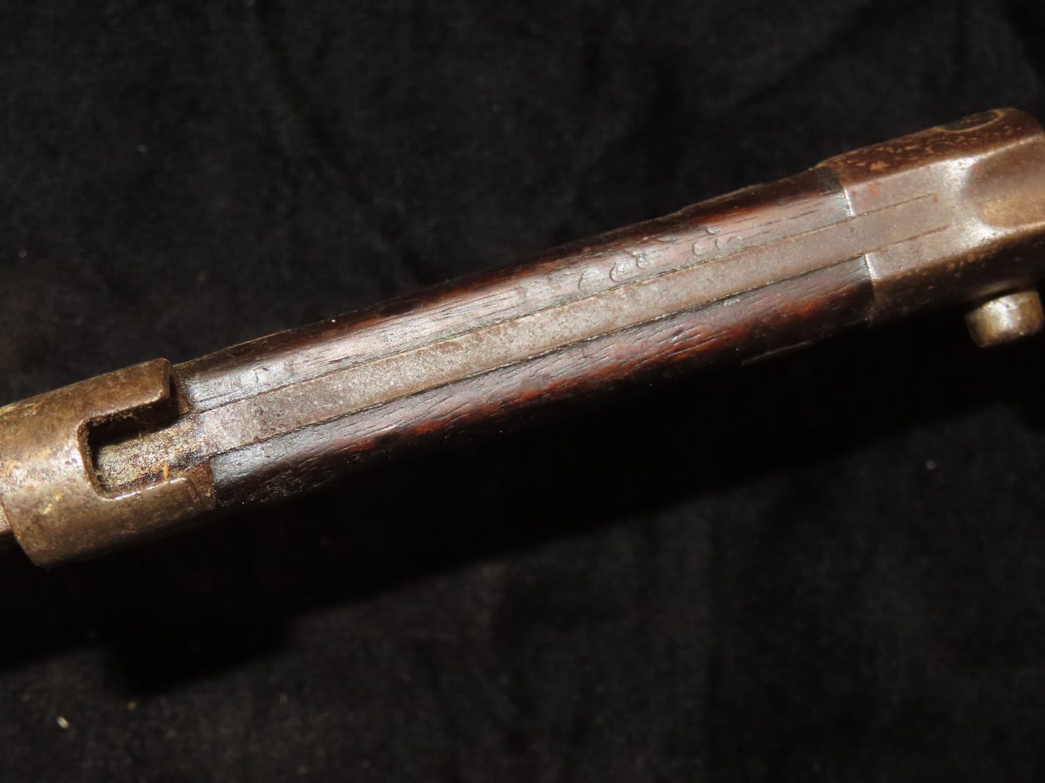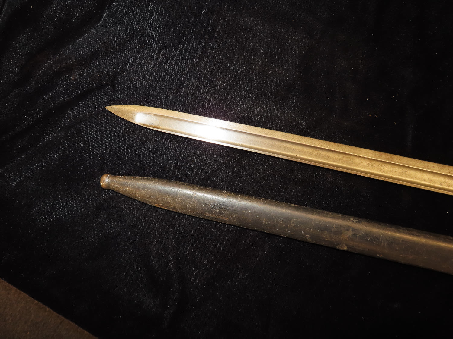 Early Bayonet, Unknown Manufacture. Has cartoos and a Steel guard with wood handle w/ scabbard. 20 1/4″ overal length