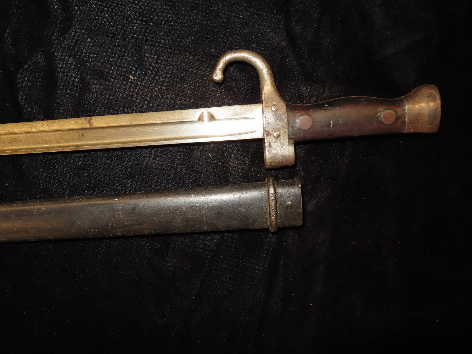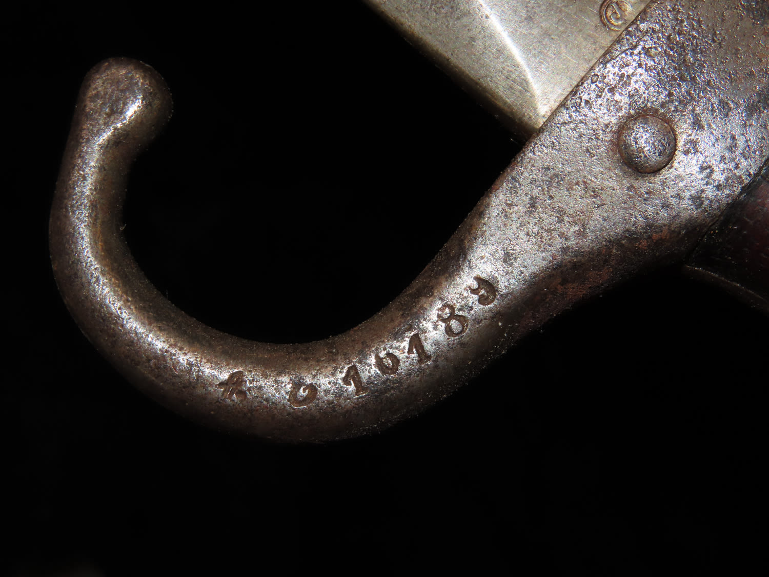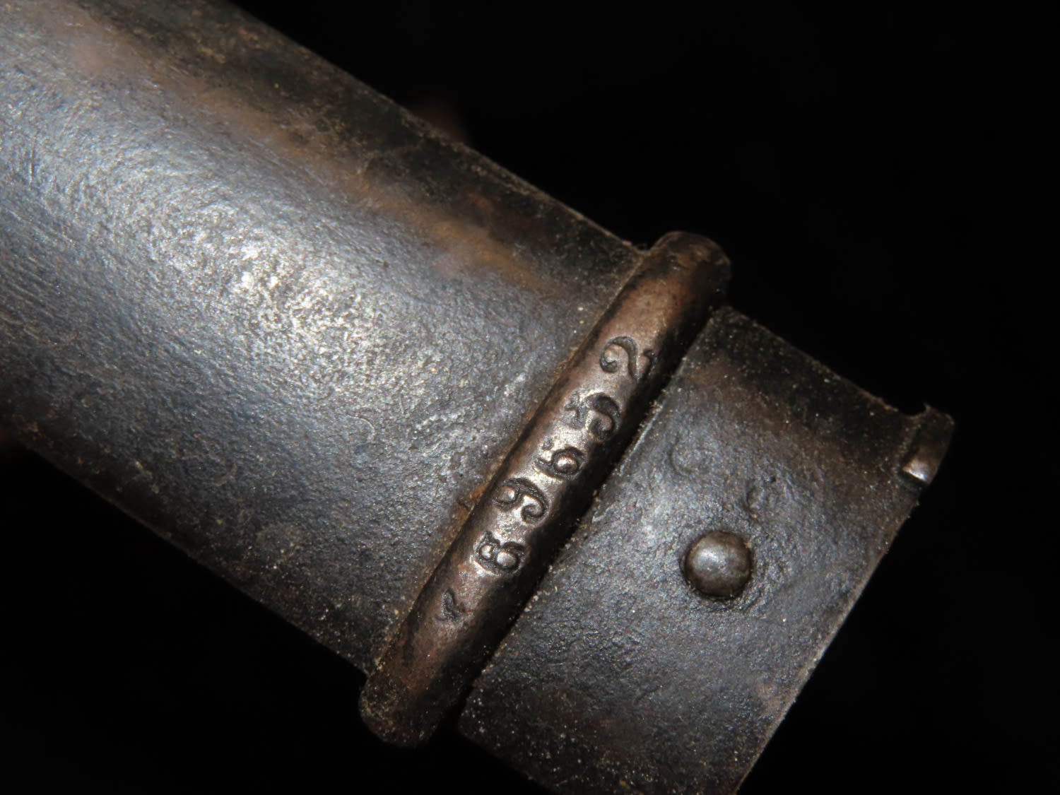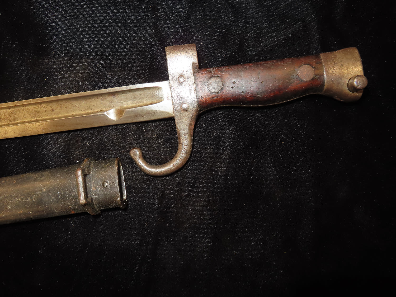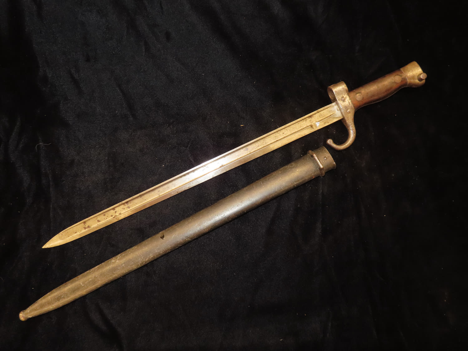 Early Bayonet, Unknown Manufacture. Has cartoos and a Steel guard with wood handle w/ scabbard. 20 1/4″ overal length