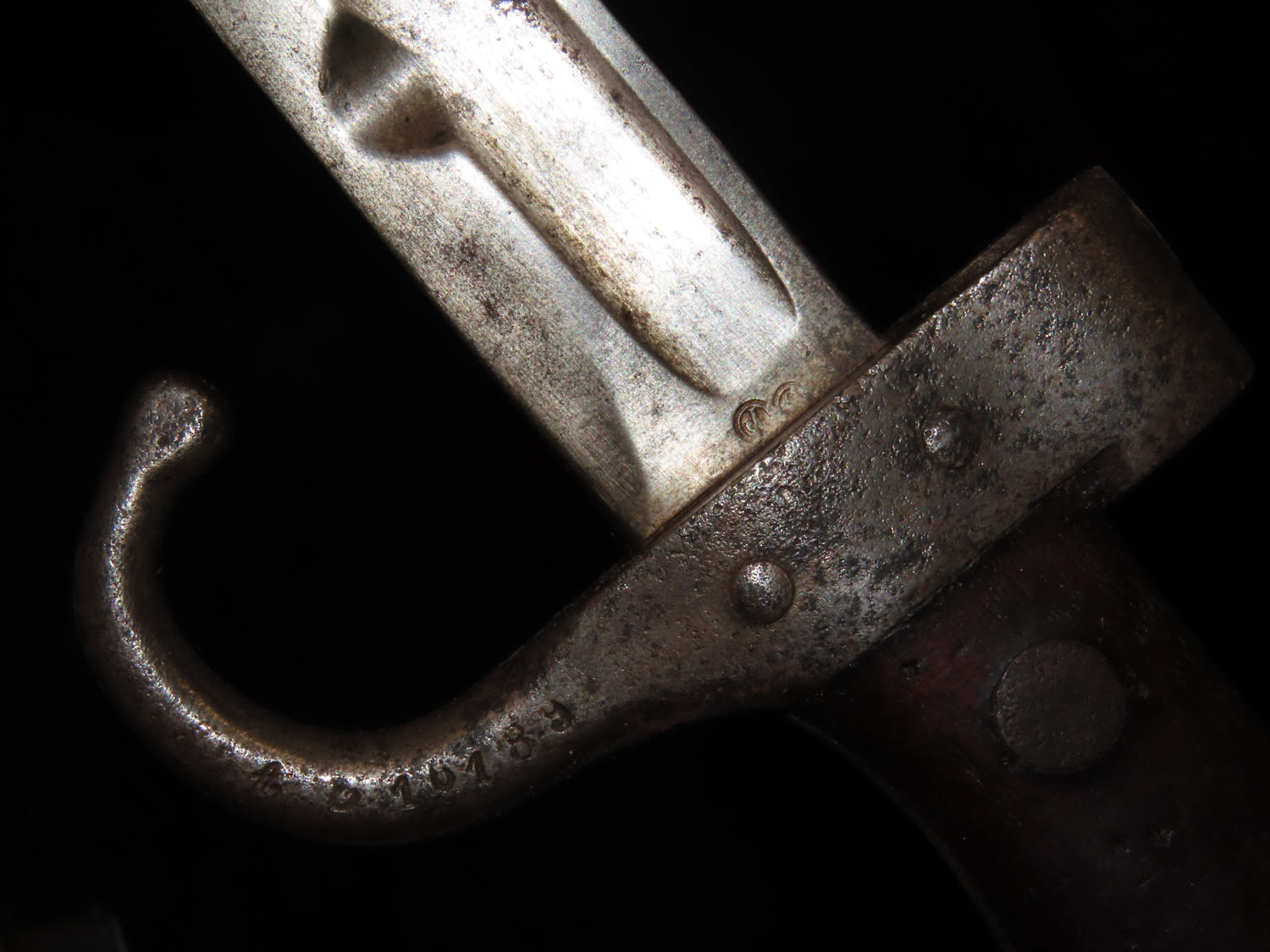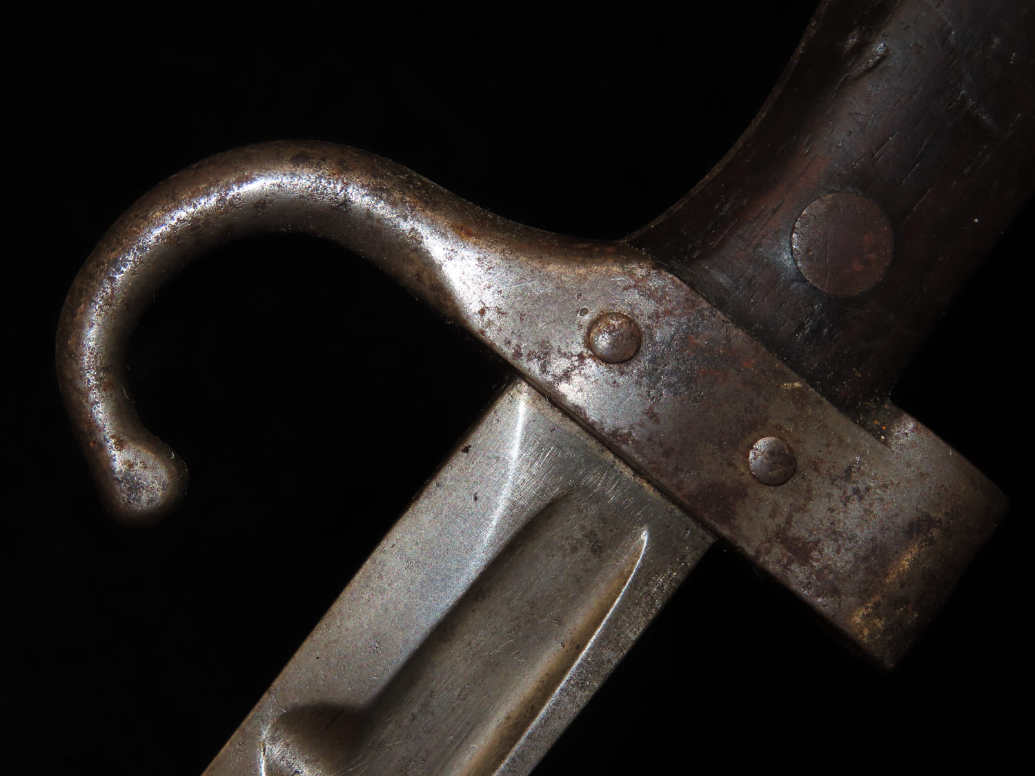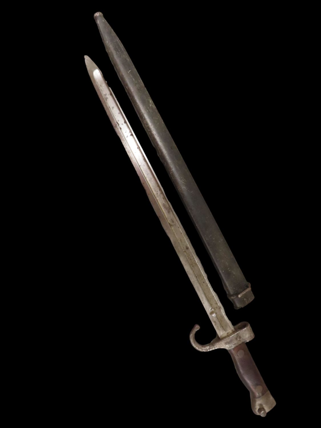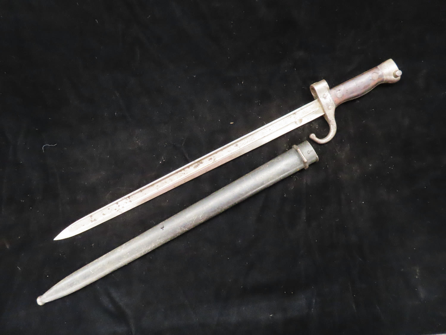 Early Bayonet, Unknown Manufacture. Has cartoos and a Steel guard with wood handle w/ scabbard. 20 1/4″ overal length