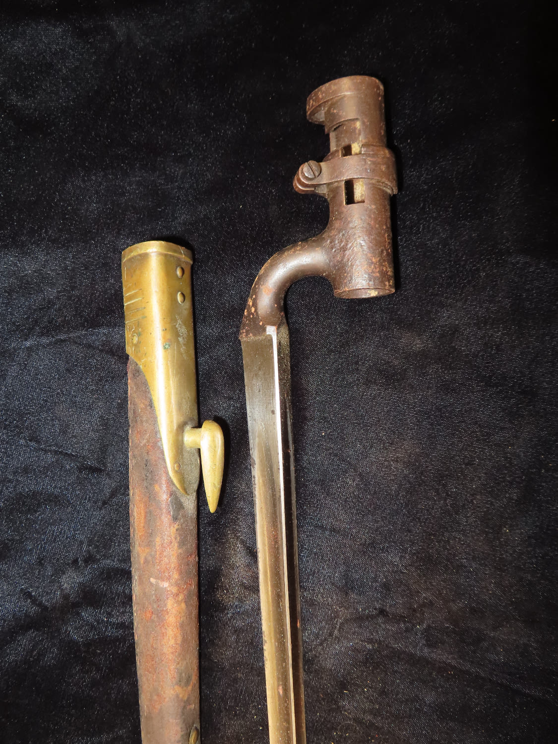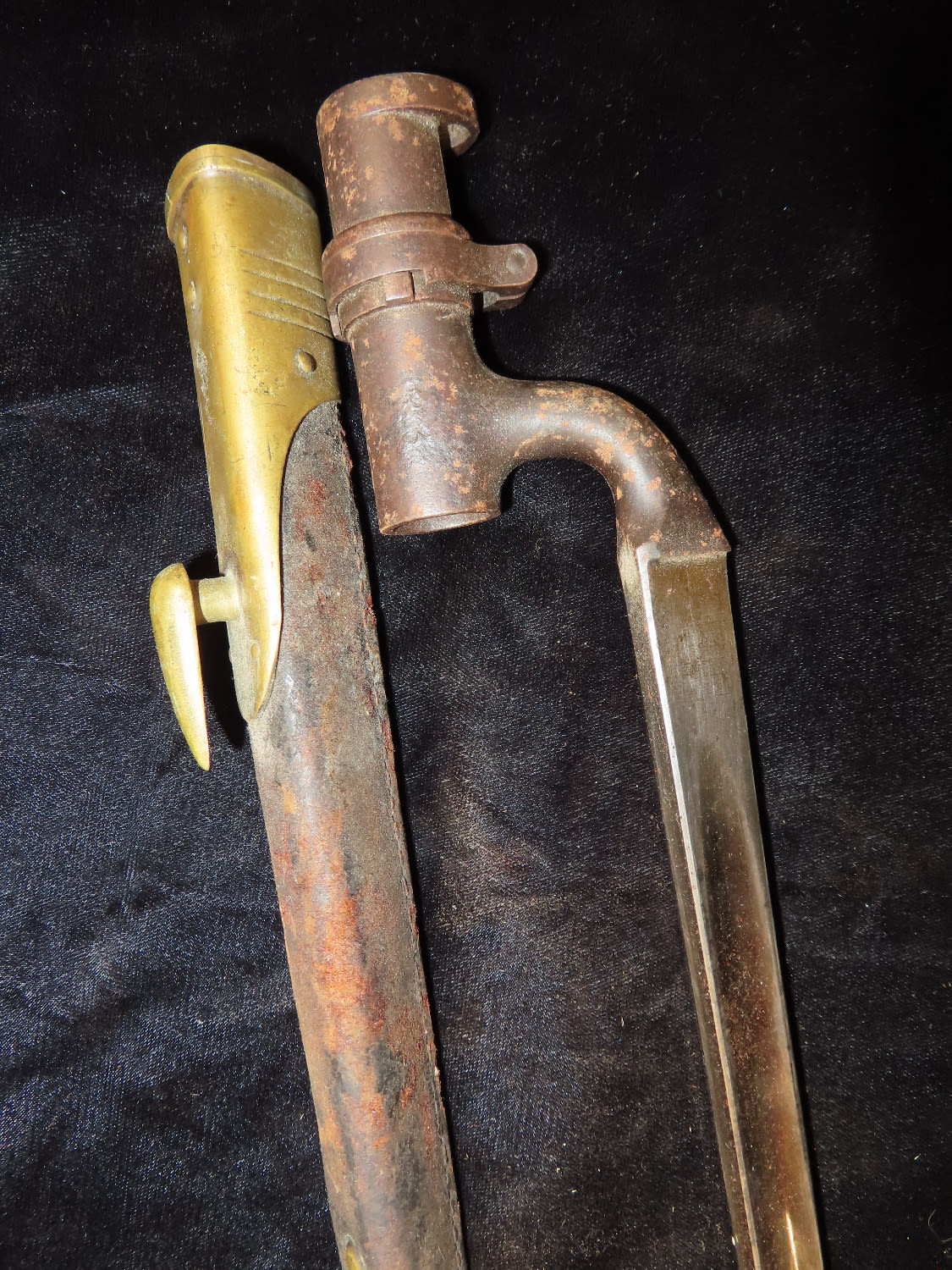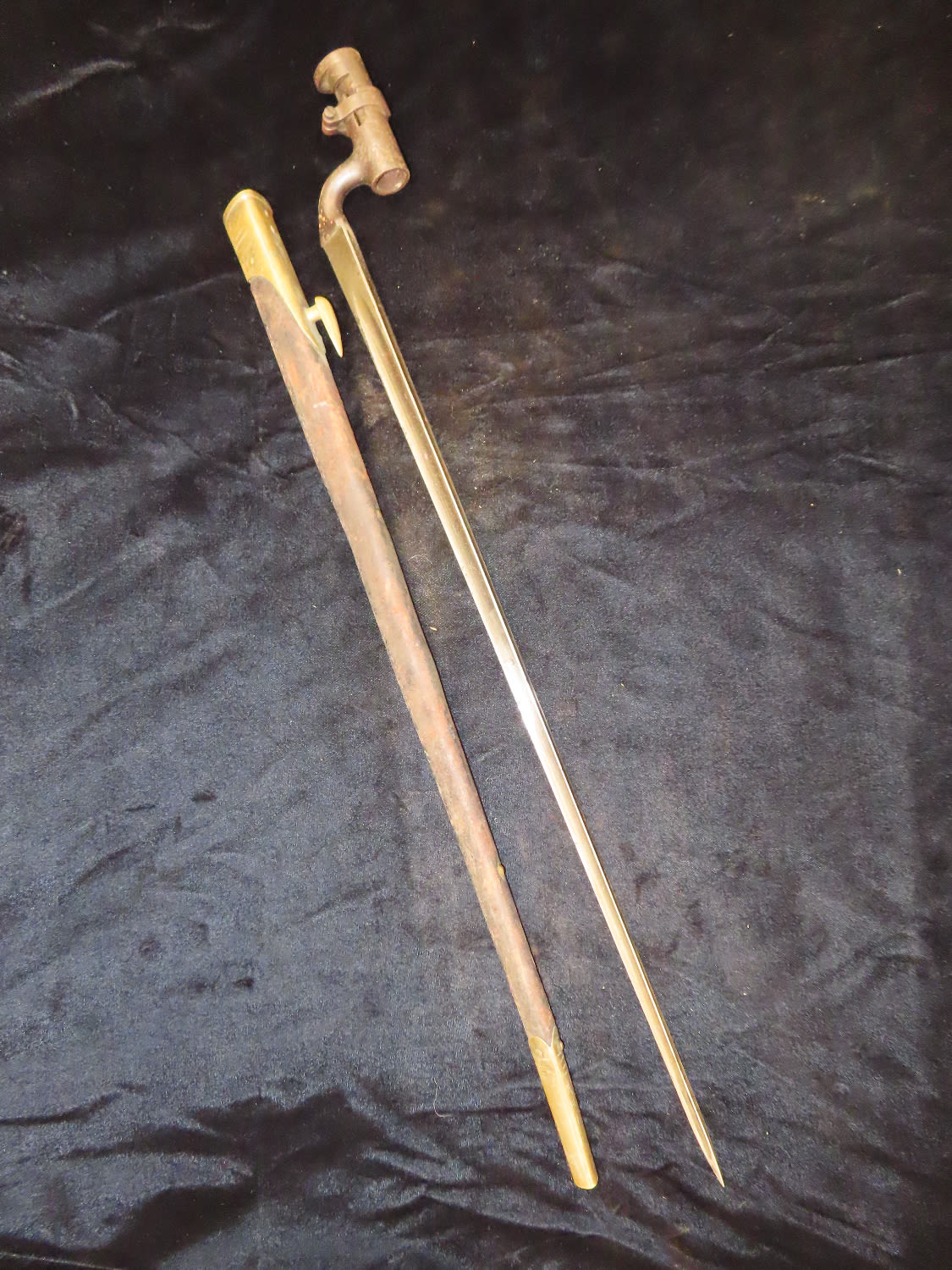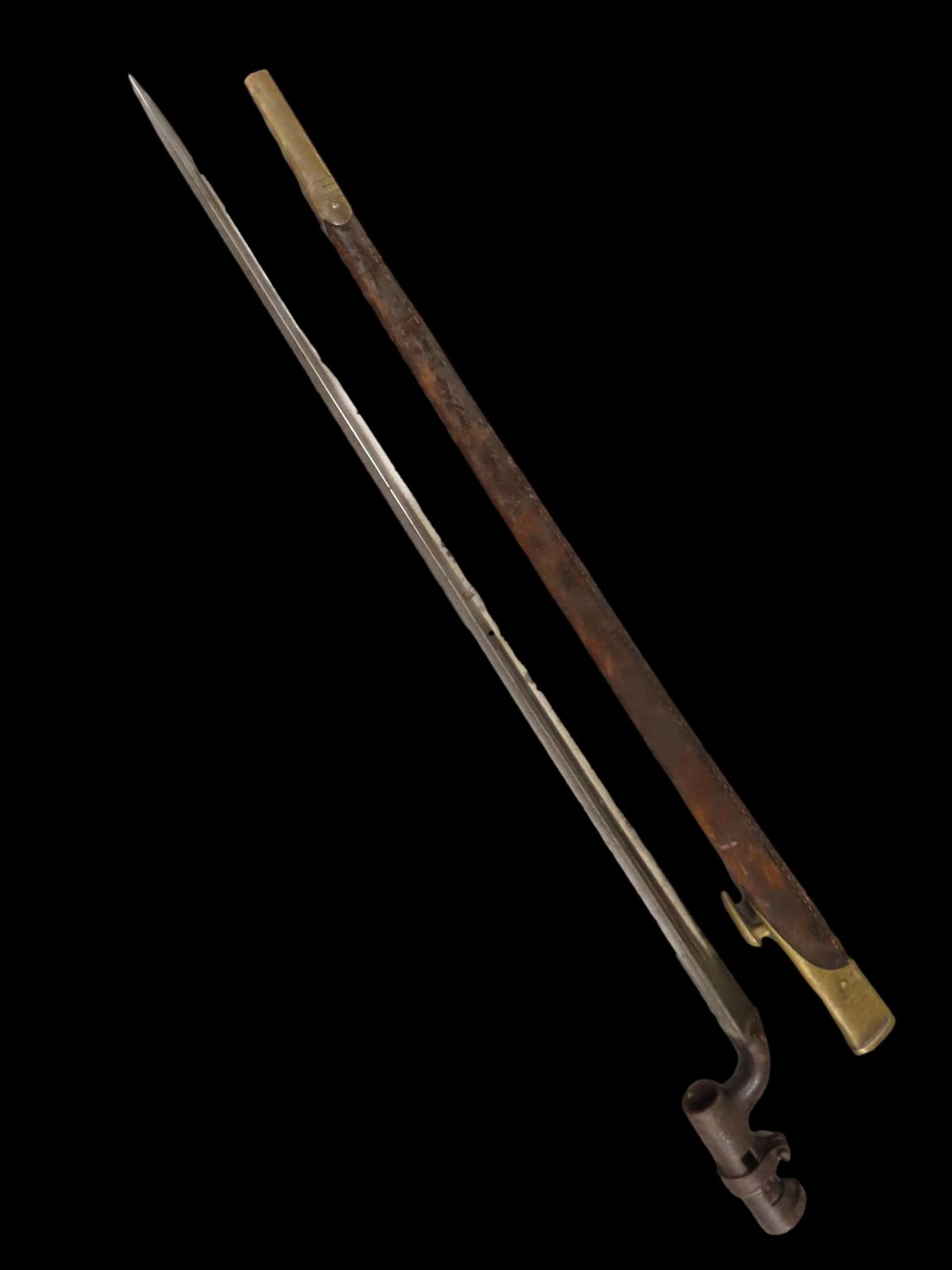 British Pattern M1853 Enfield Socket Bayonet & Scabbard. Stamped WD R Crown 2 on ricasso. Model 1853 socket bayonet, designed for the Enfield Pattern 1853 Rifle-Musket (also known as the Pattern 1853 Enfield, P53 Enfield, and Enfield Rifle-Musket), a British .577 caliber Minie-type muzzle-loading rifle that was also used by both the North and the South in the American Civil War. 25 1/4″ overall