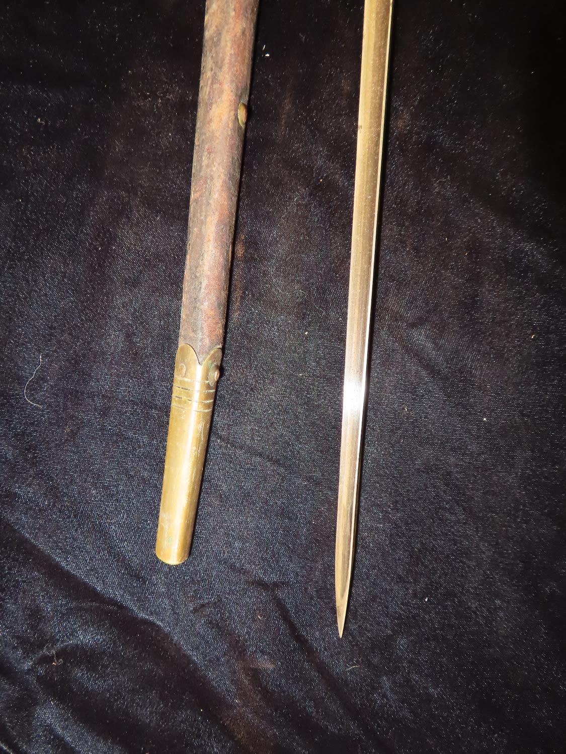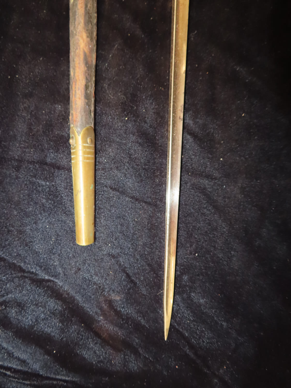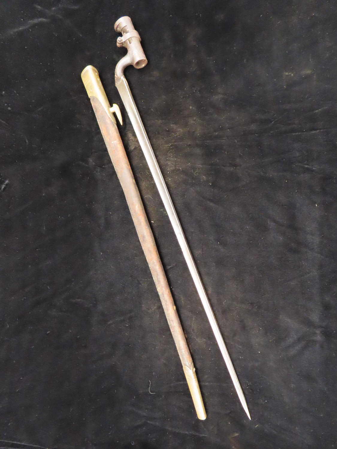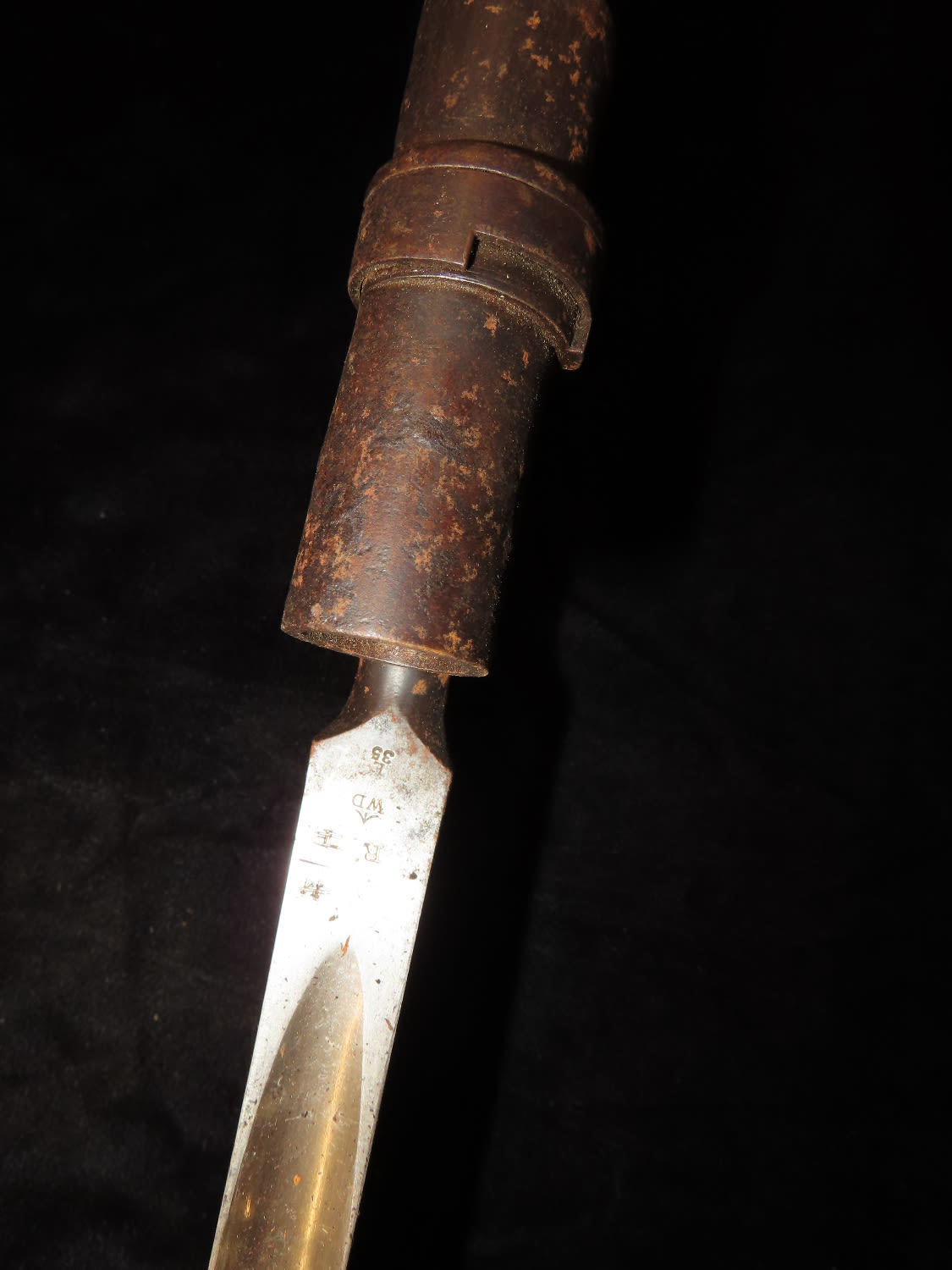 British Pattern M1853 Enfield Socket Bayonet & Scabbard. Stamped WD R Crown 2 on ricasso. Model 1853 socket bayonet, designed for the Enfield Pattern 1853 Rifle-Musket (also known as the Pattern 1853 Enfield, P53 Enfield, and Enfield Rifle-Musket), a British .577 caliber Minie-type muzzle-loading rifle that was also used by both the North and the South in the American Civil War. 25 1/4″ overall