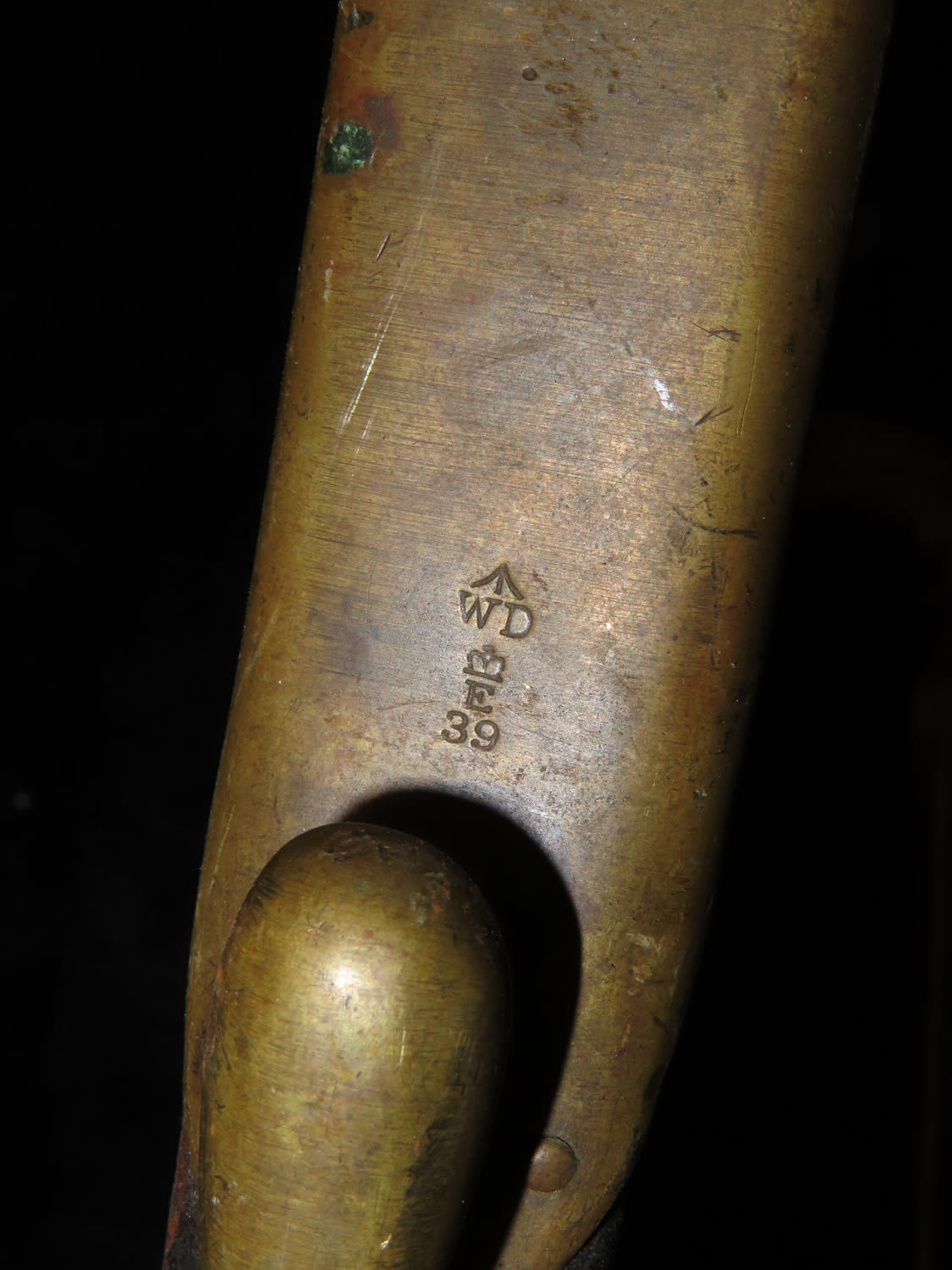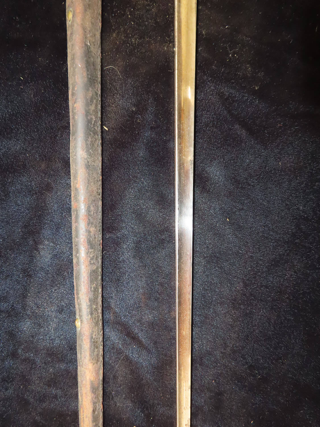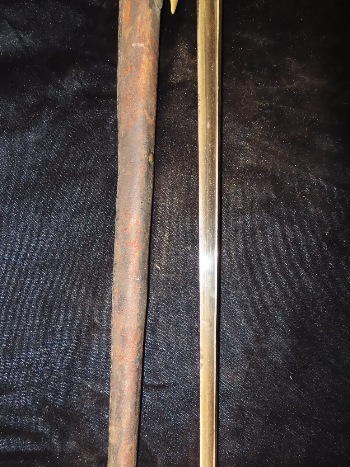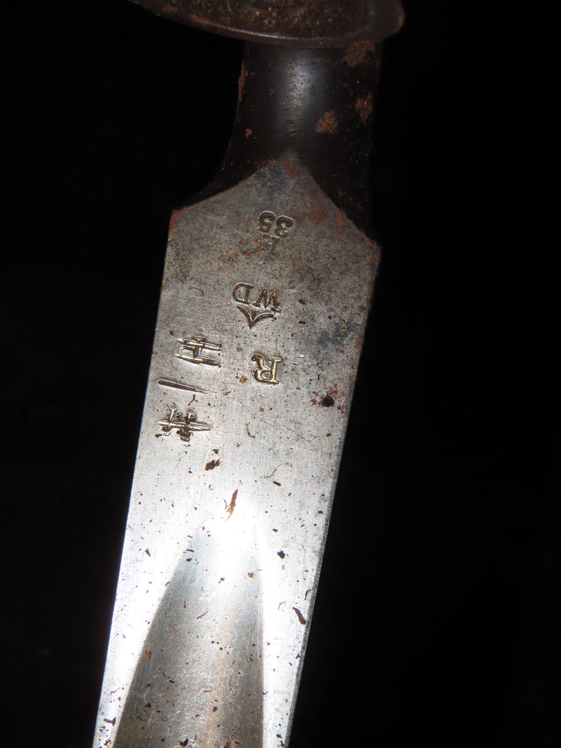 British Pattern M1853 Enfield Socket Bayonet & Scabbard. Stamped WD R Crown 2 on ricasso. Model 1853 socket bayonet, designed for the Enfield Pattern 1853 Rifle-Musket (also known as the Pattern 1853 Enfield, P53 Enfield, and Enfield Rifle-Musket), a British .577 caliber Minie-type muzzle-loading rifle that was also used by both the North and the South in the American Civil War. 25 1/4″ overall