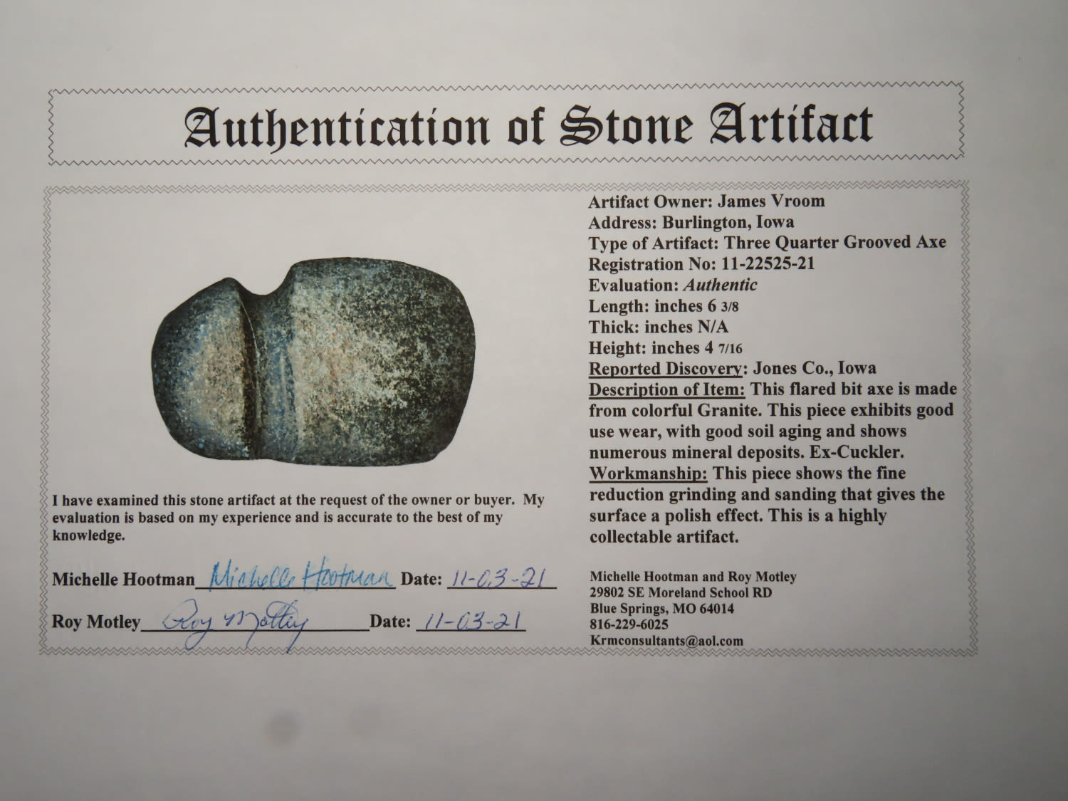 6 3/8″ 3/4 Groove Axe, Motley COA, found in Jones Co Iowa, Ex Cuckler, Ex James Vroom Collection