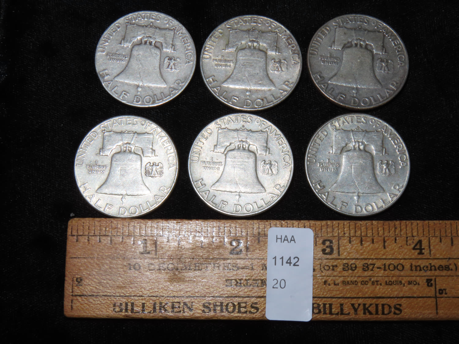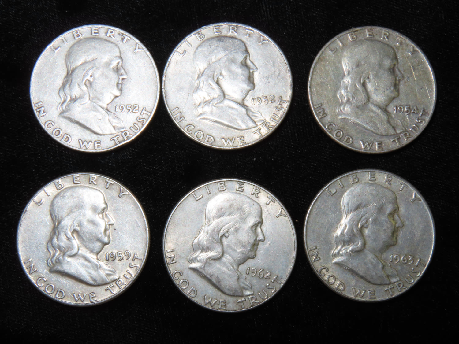 LOT OF 6 FRANKLIN SILVER HALF DOLLARS. ALL DIFFERENT