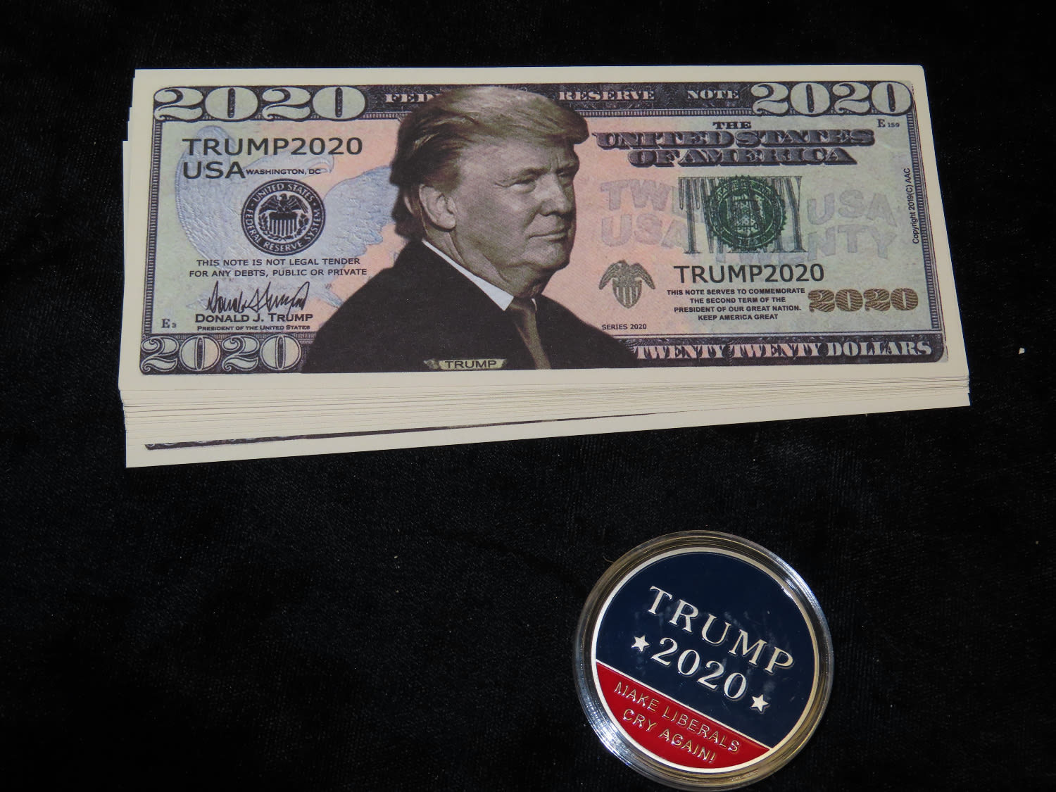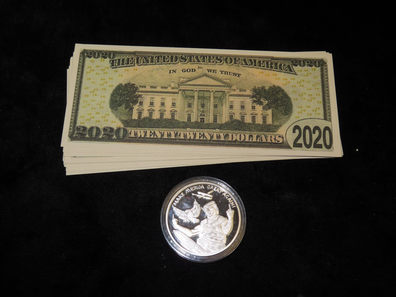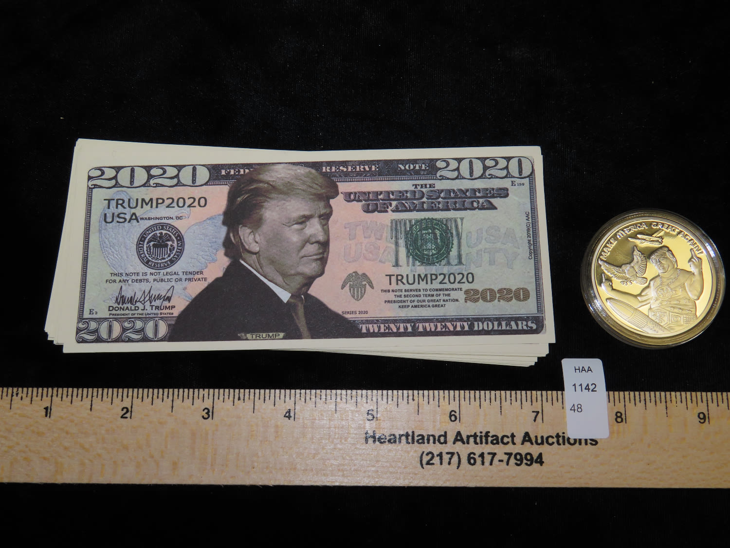 LOT OF 25 TRUMP BILLS & 2 FUNNY TRUMP COINS