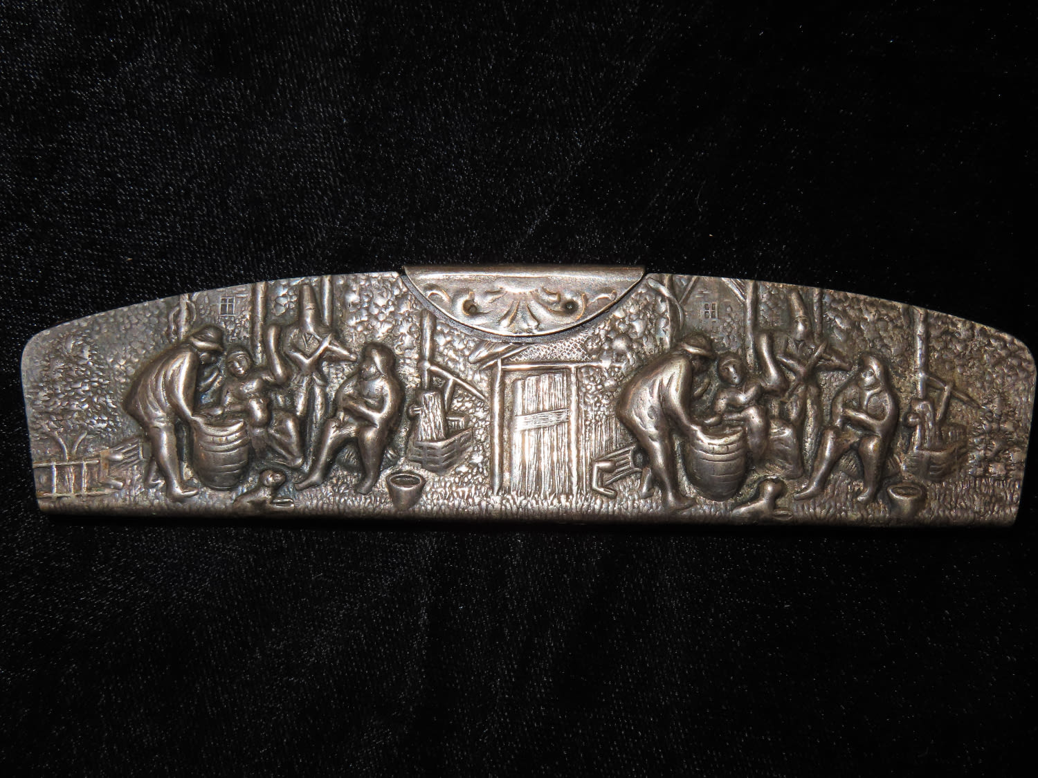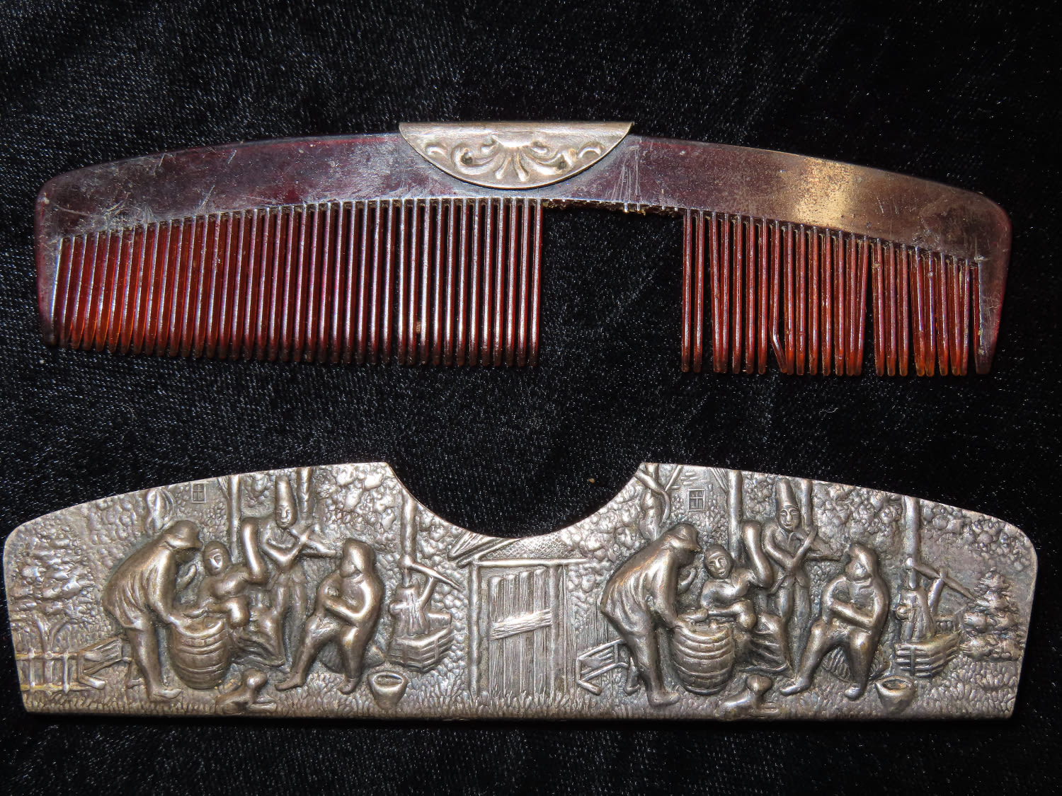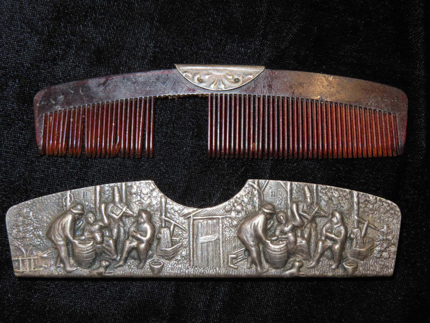Vintage Tortoiseshell Comb Silver Plate Repousse case signed “Denmark” with a whale/fish type logo on edge of case case measures approximately 5″ x 1.25″(Comb is missing some teeth)