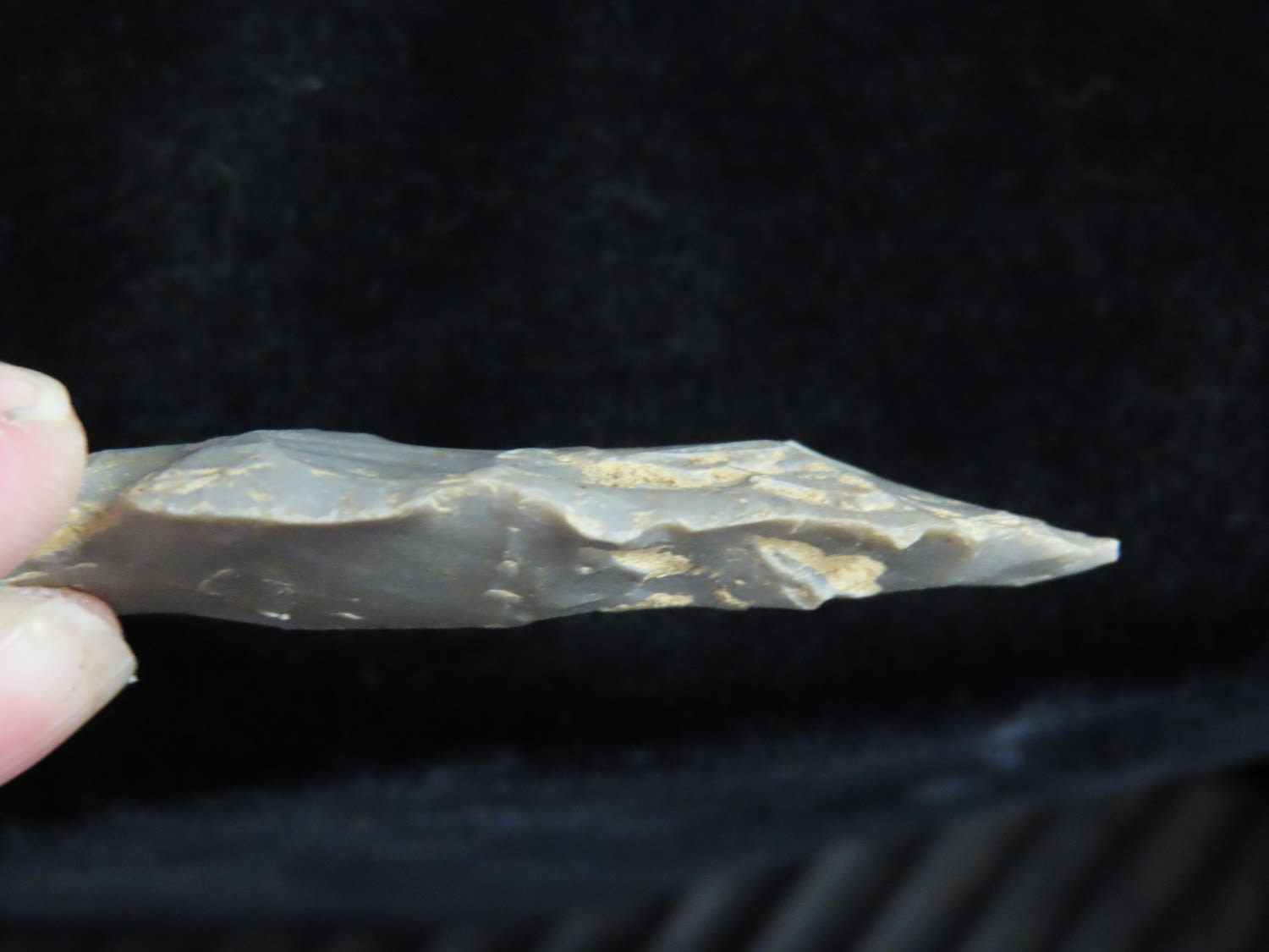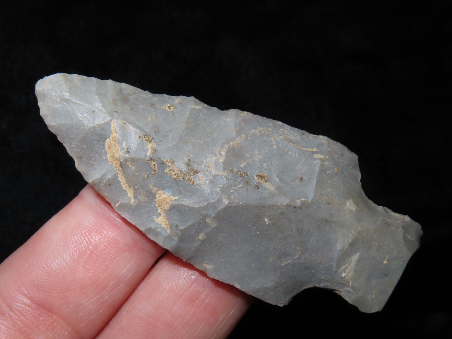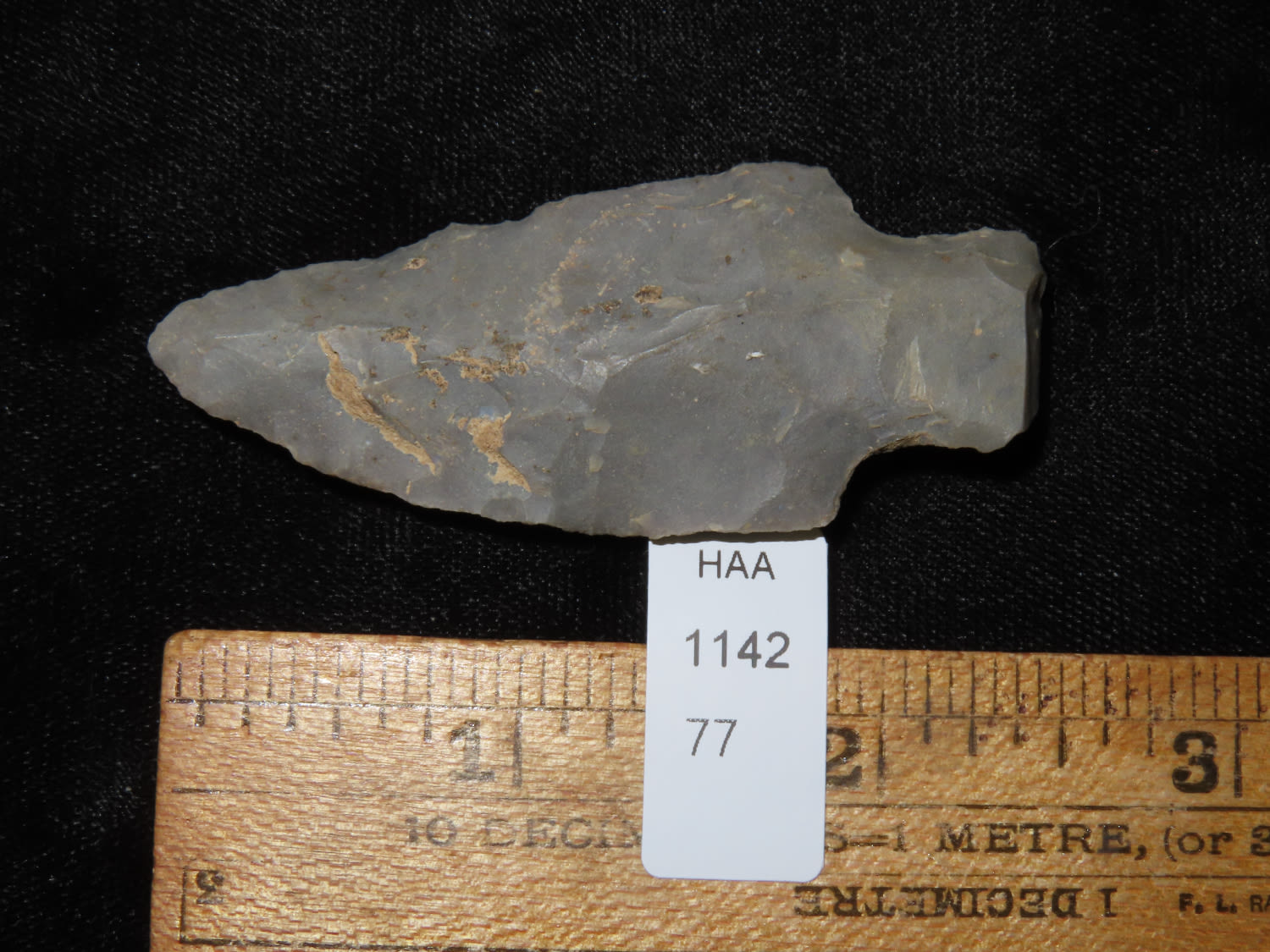 2 1/2″ KIRK STEMMED, FOUND IN THE BENTON / HUMPHREYS COUNTY TENNESSEE AREA BY E.J. SIMS, INDIAN ARROWHEAD, ARTIFACT