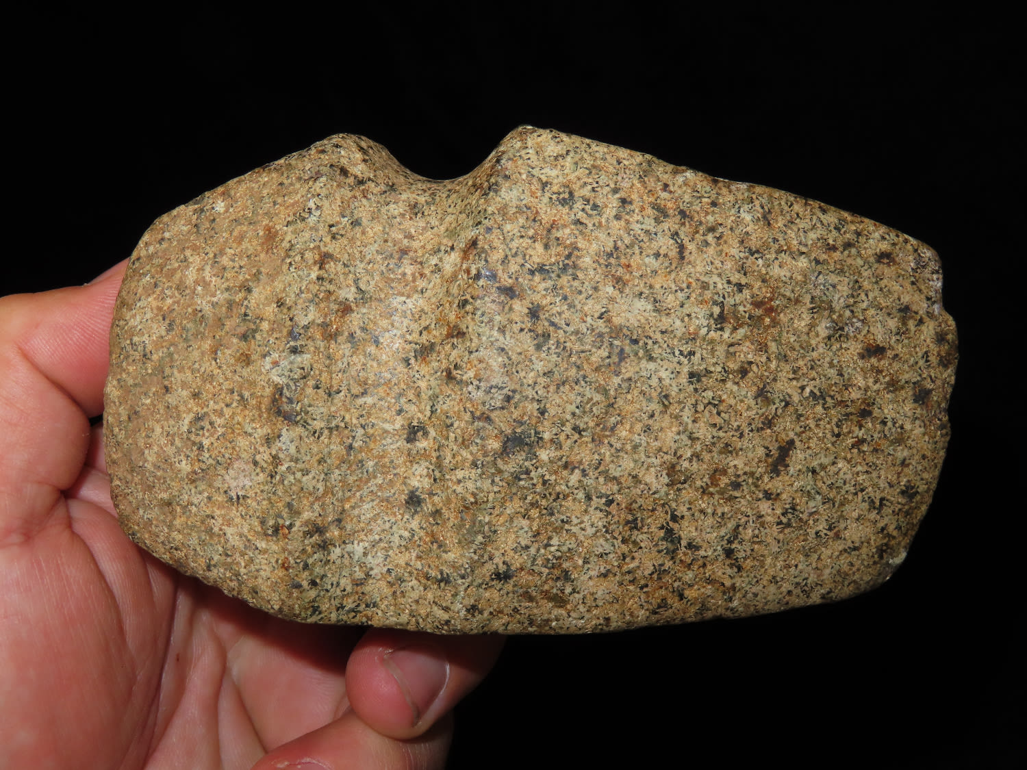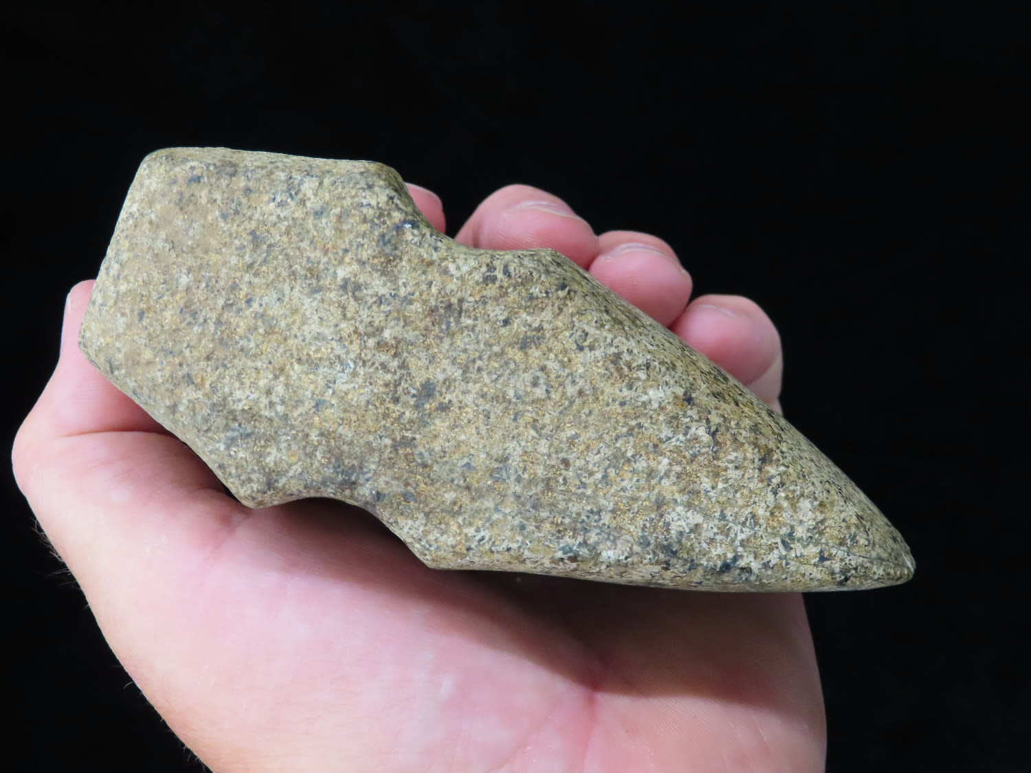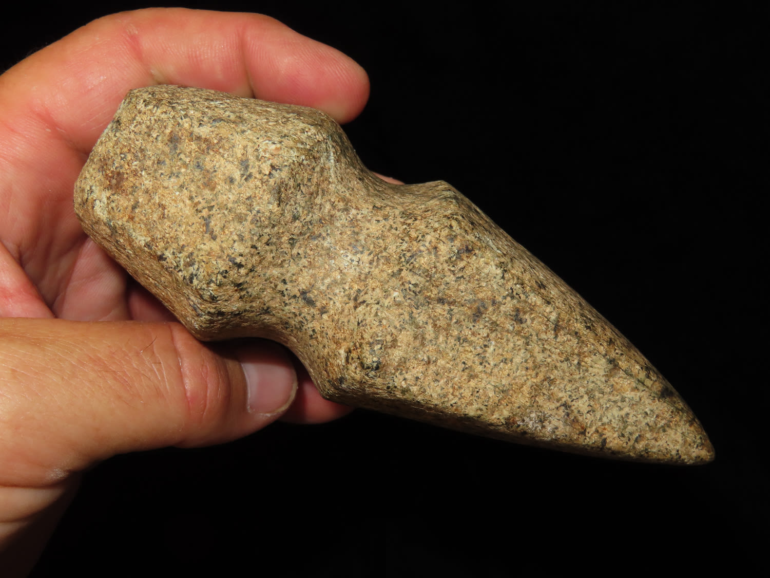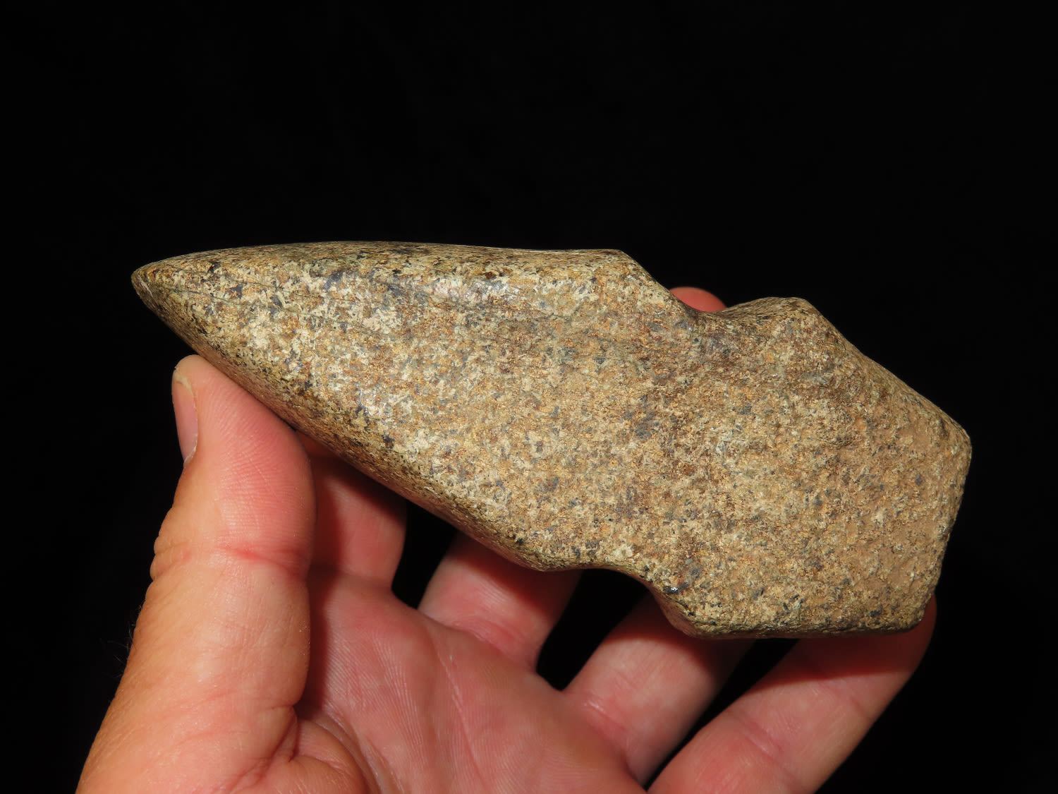 4 5/8″ Developed Missouri square 3/4 Groove Axe found in Cooper Co, Mo. Fluted Top and Bottom, Stands Nicely, Good Finish. This is a very nice axe with excellent granite color. Ex George Wolf Collection