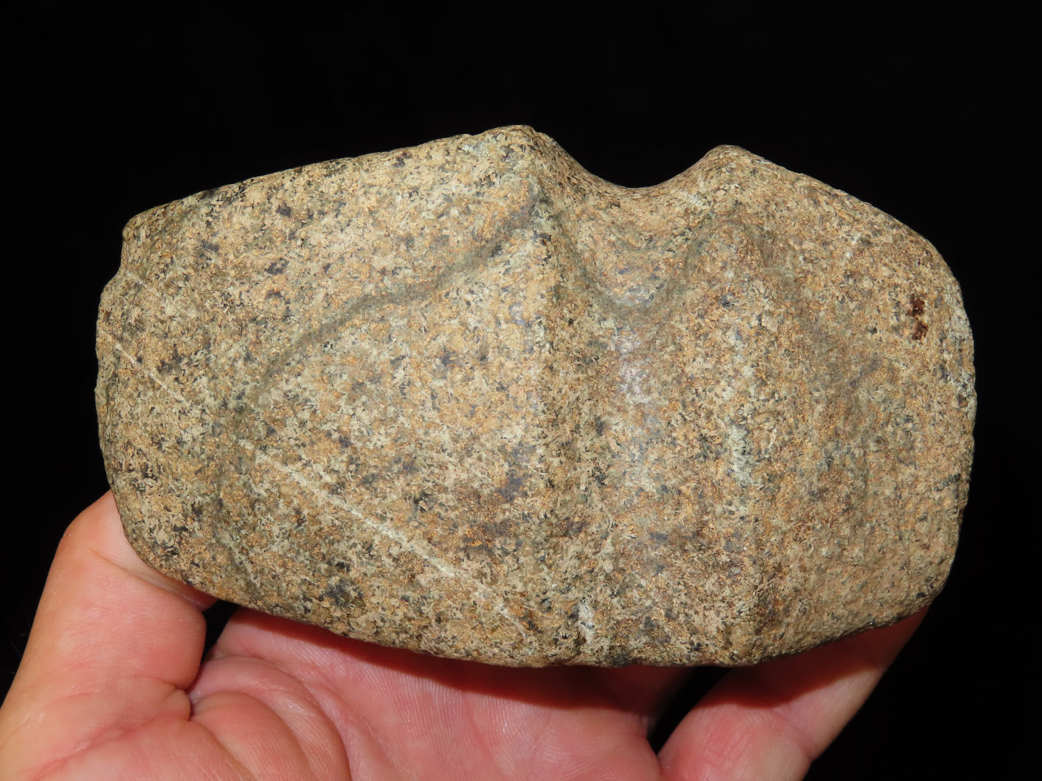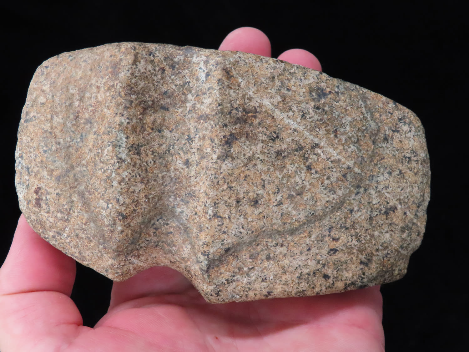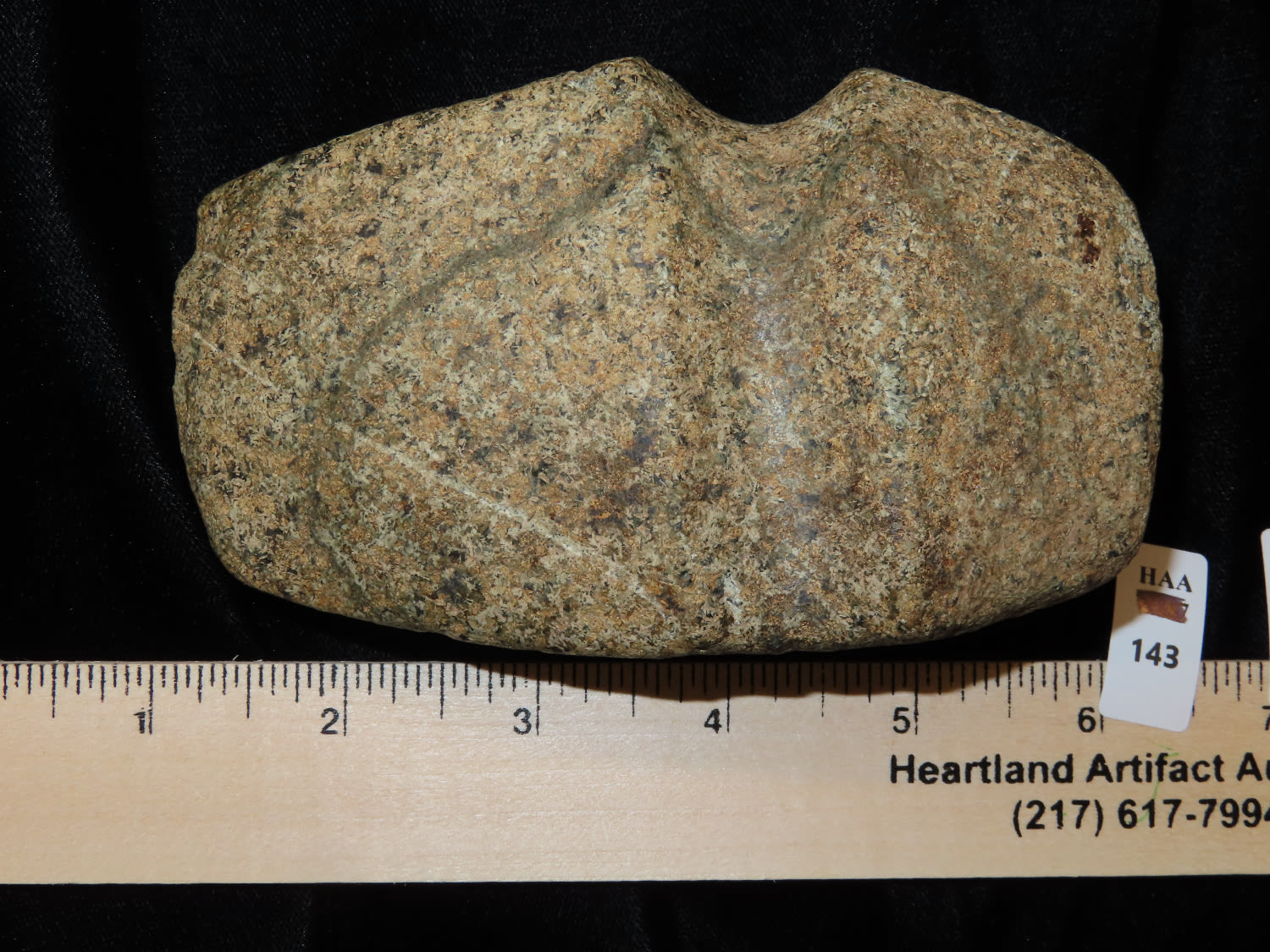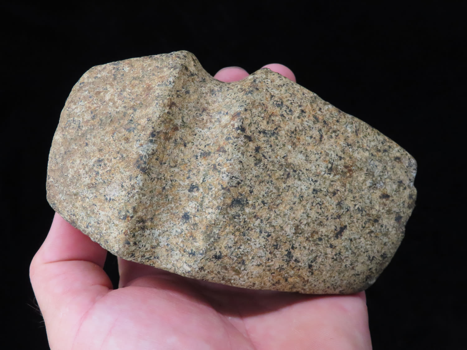 4 5/8″ Developed Missouri square 3/4 Groove Axe found in Cooper Co, Mo. Fluted Top and Bottom, Stands Nicely, Good Finish. This is a very nice axe with excellent granite color. Ex George Wolf Collection