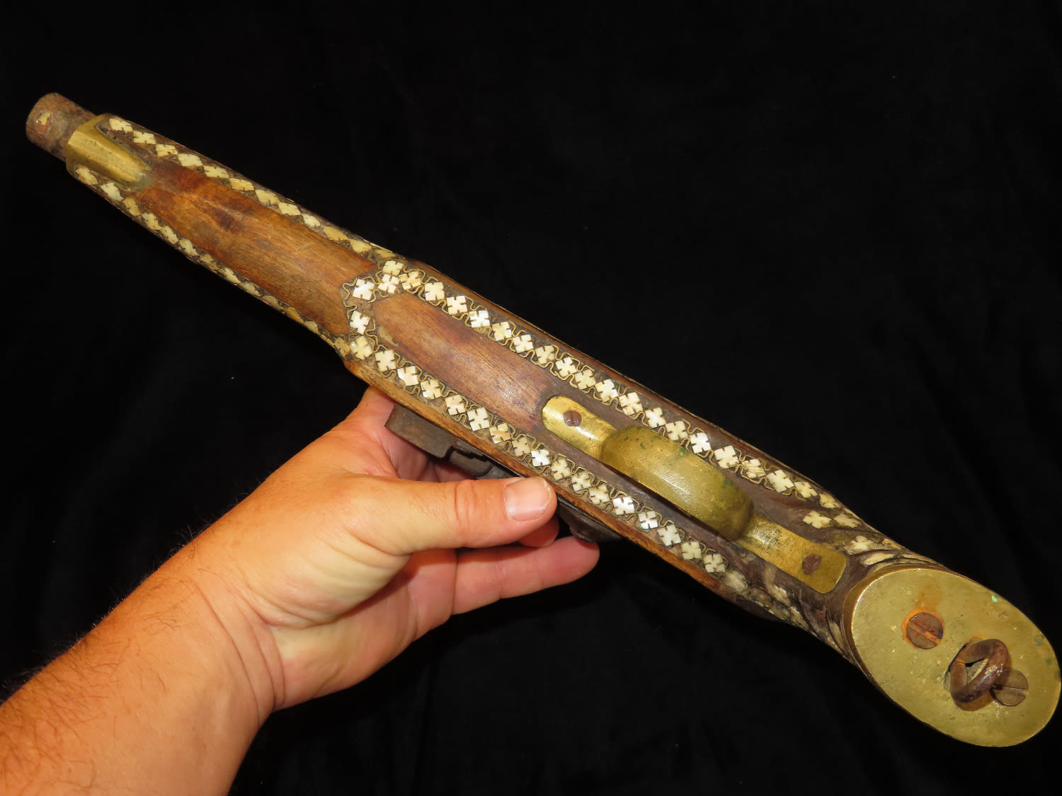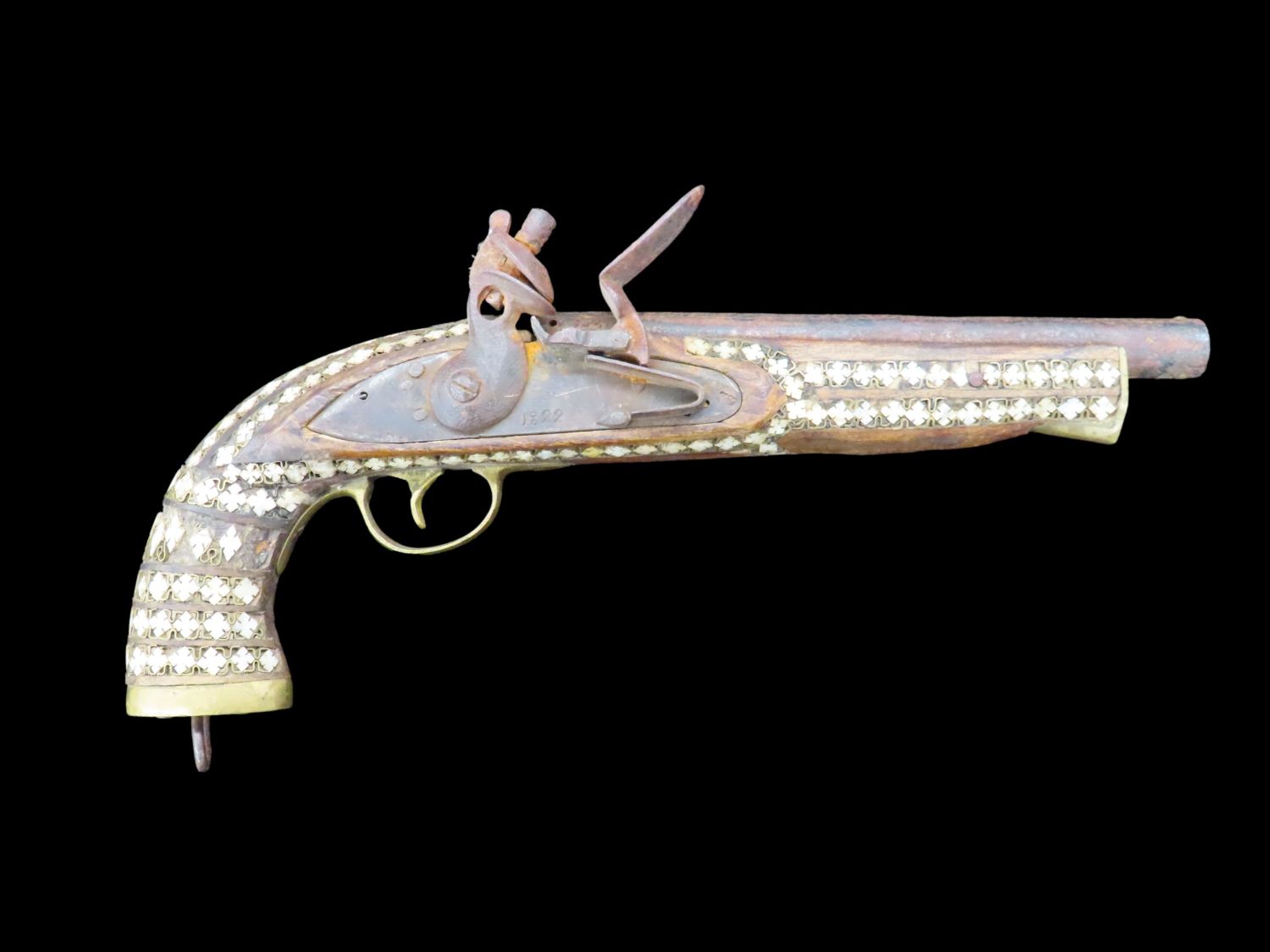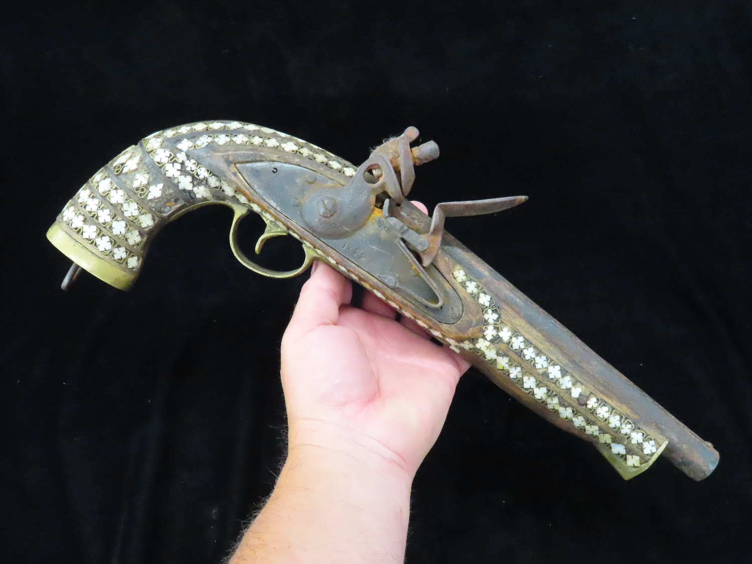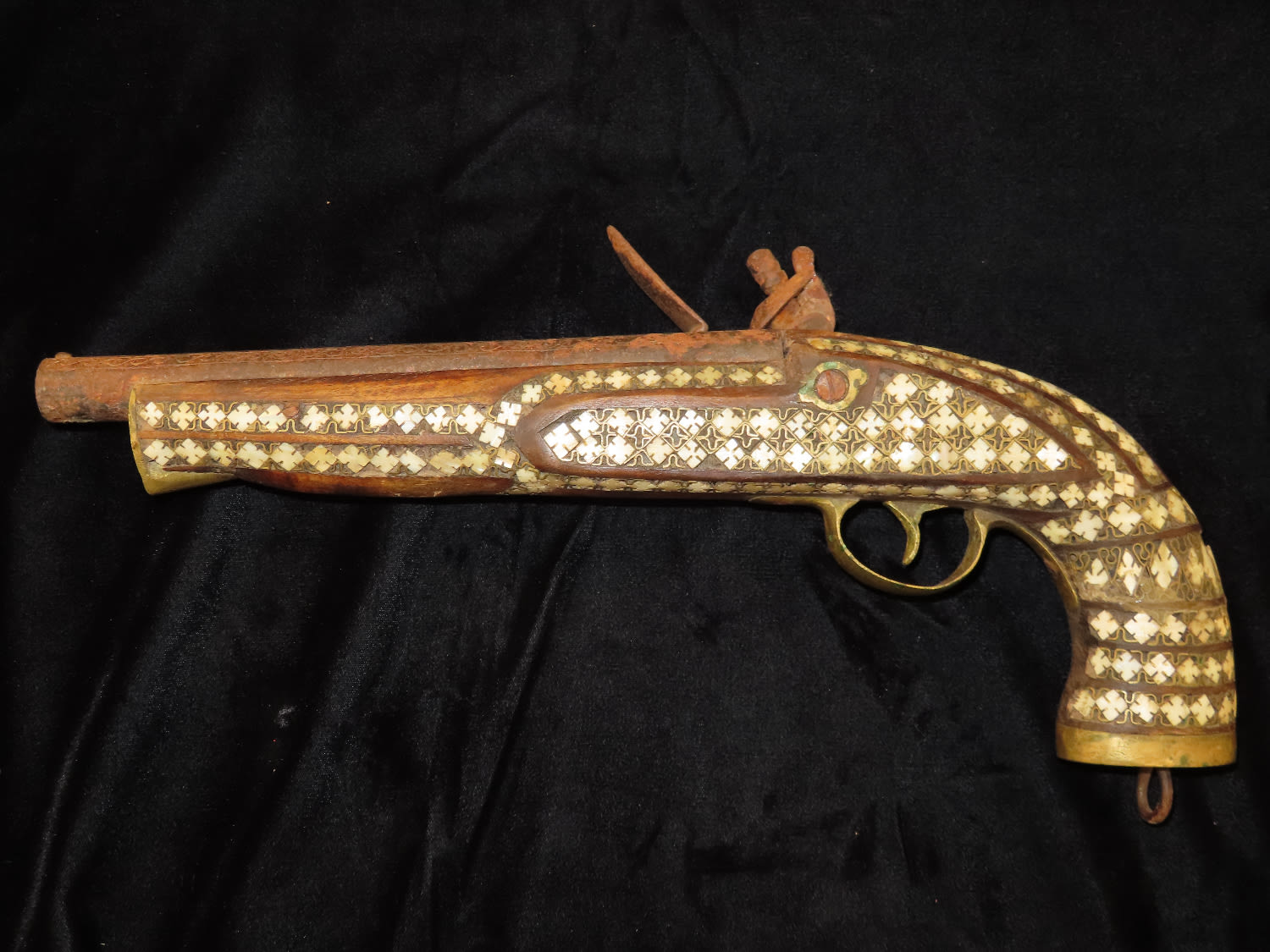 Flintlock Pistol, Very Ornate with inlayed stock and brass trigger. Mid East origin.