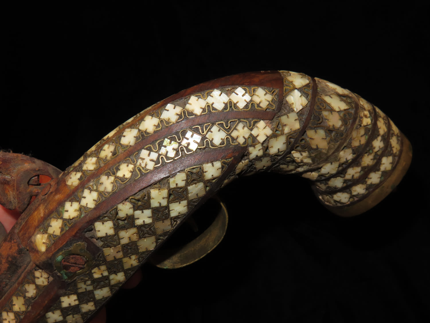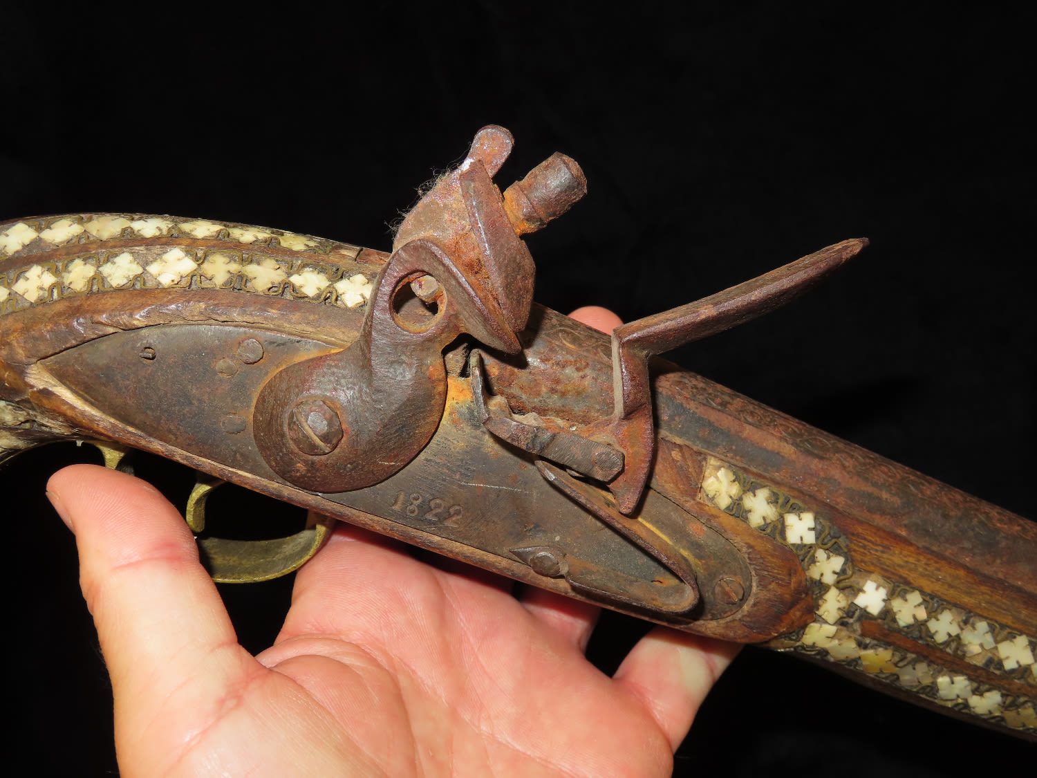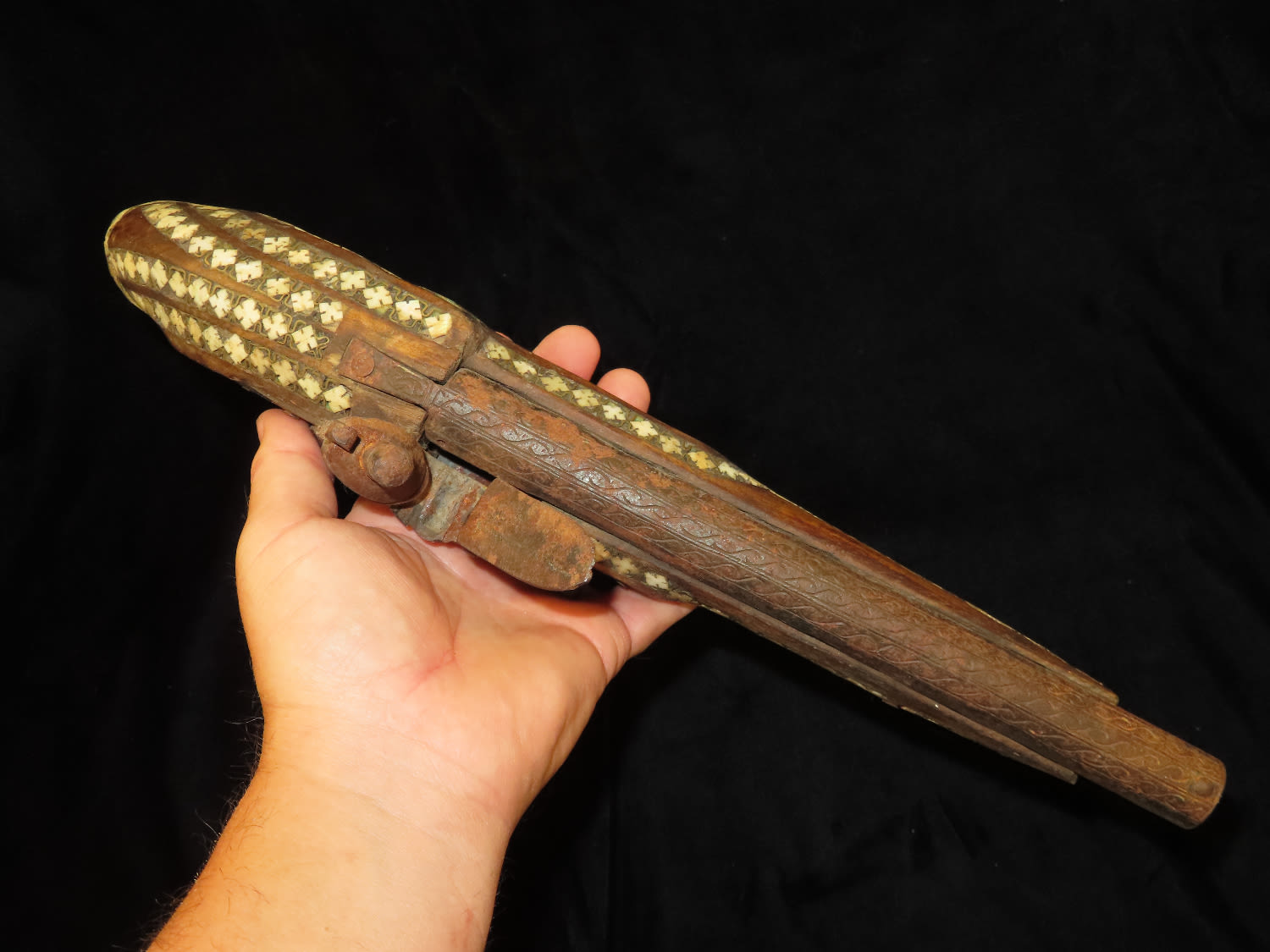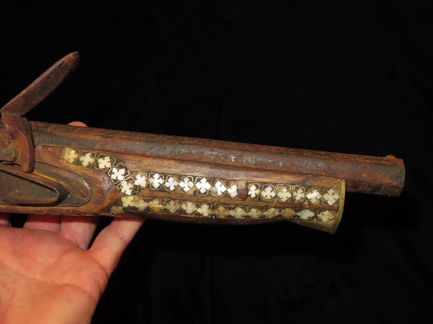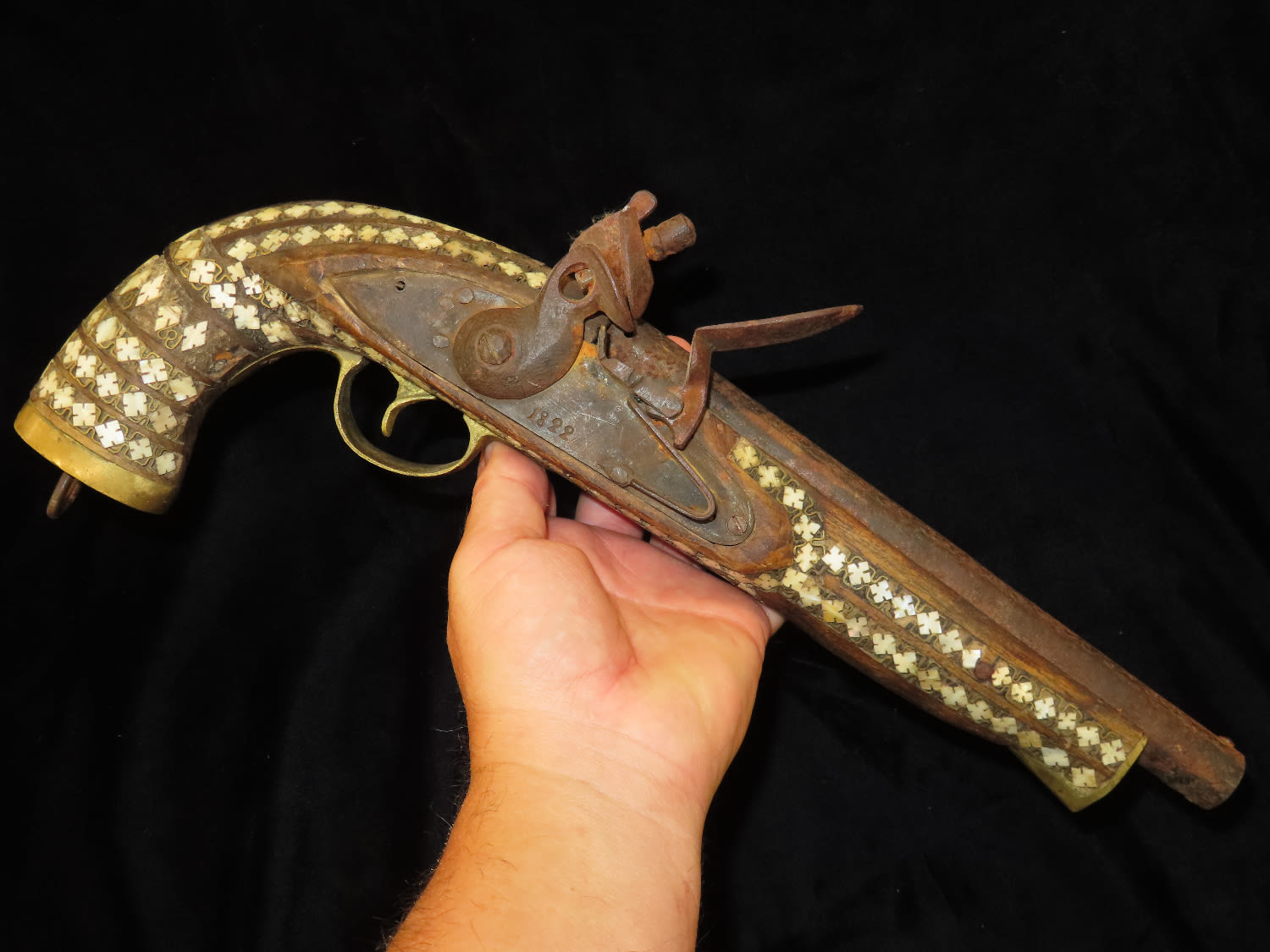 Flintlock Pistol, Very Ornate with inlayed stock and brass trigger. Mid East origin.