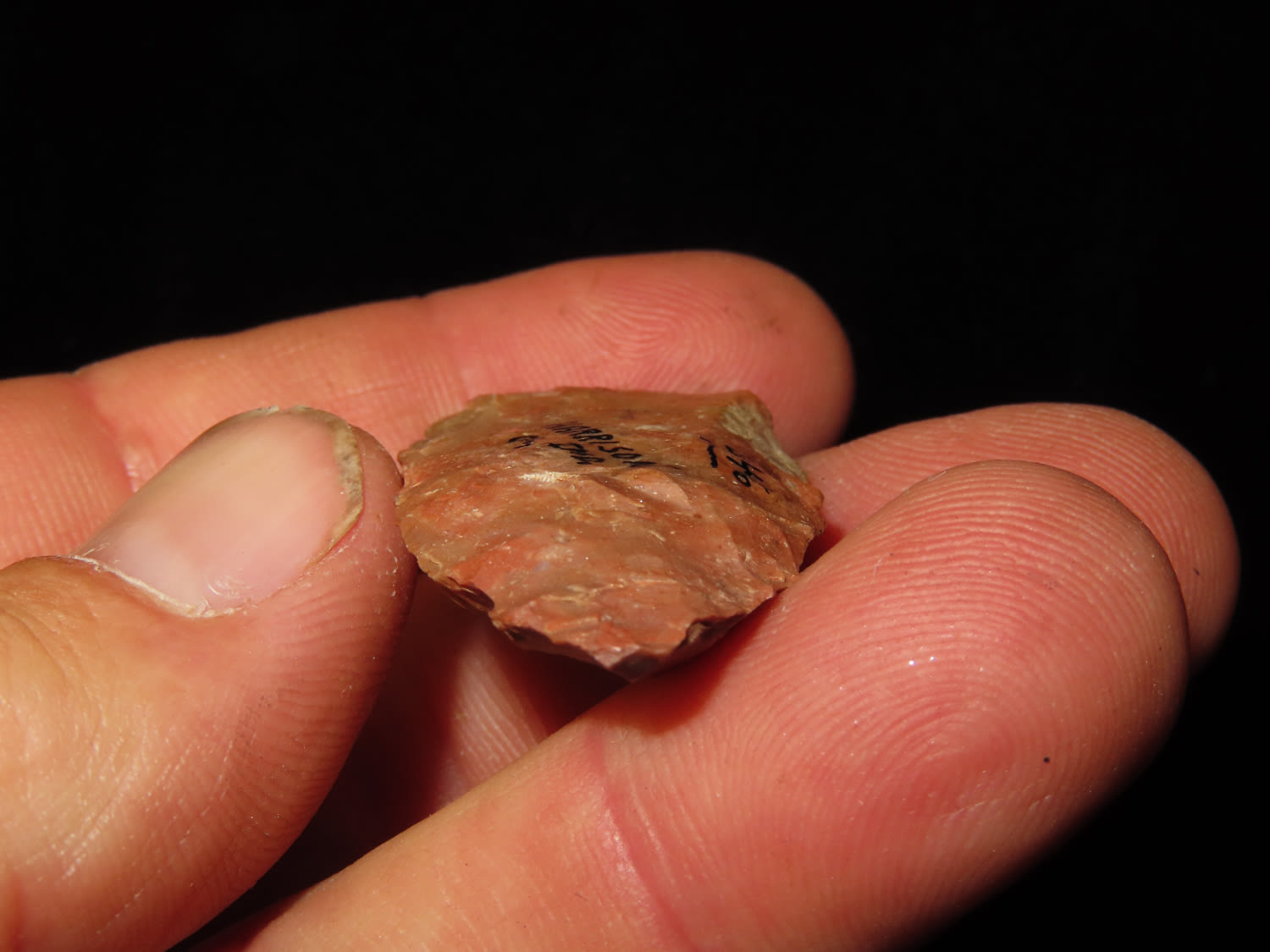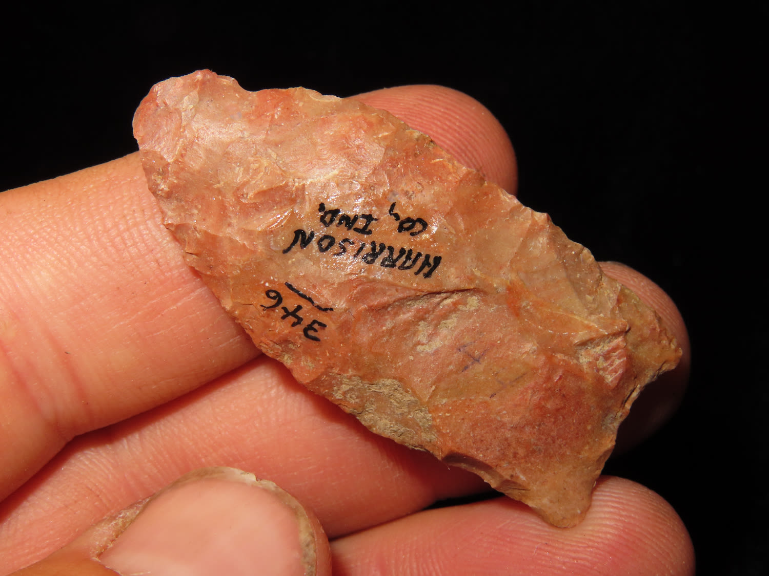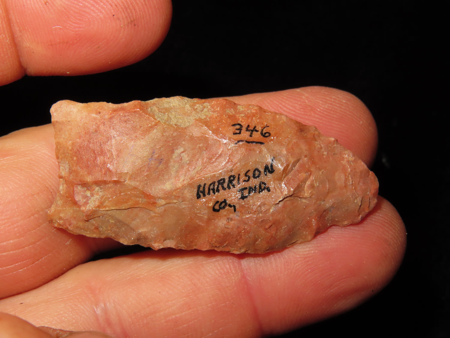 1 7/8″ Paleo Dart Point, found in Harrison Co. Indiana, purchased from Jim Bennett at Premiere Auctions in 2017, Ex Ron Comer Collection