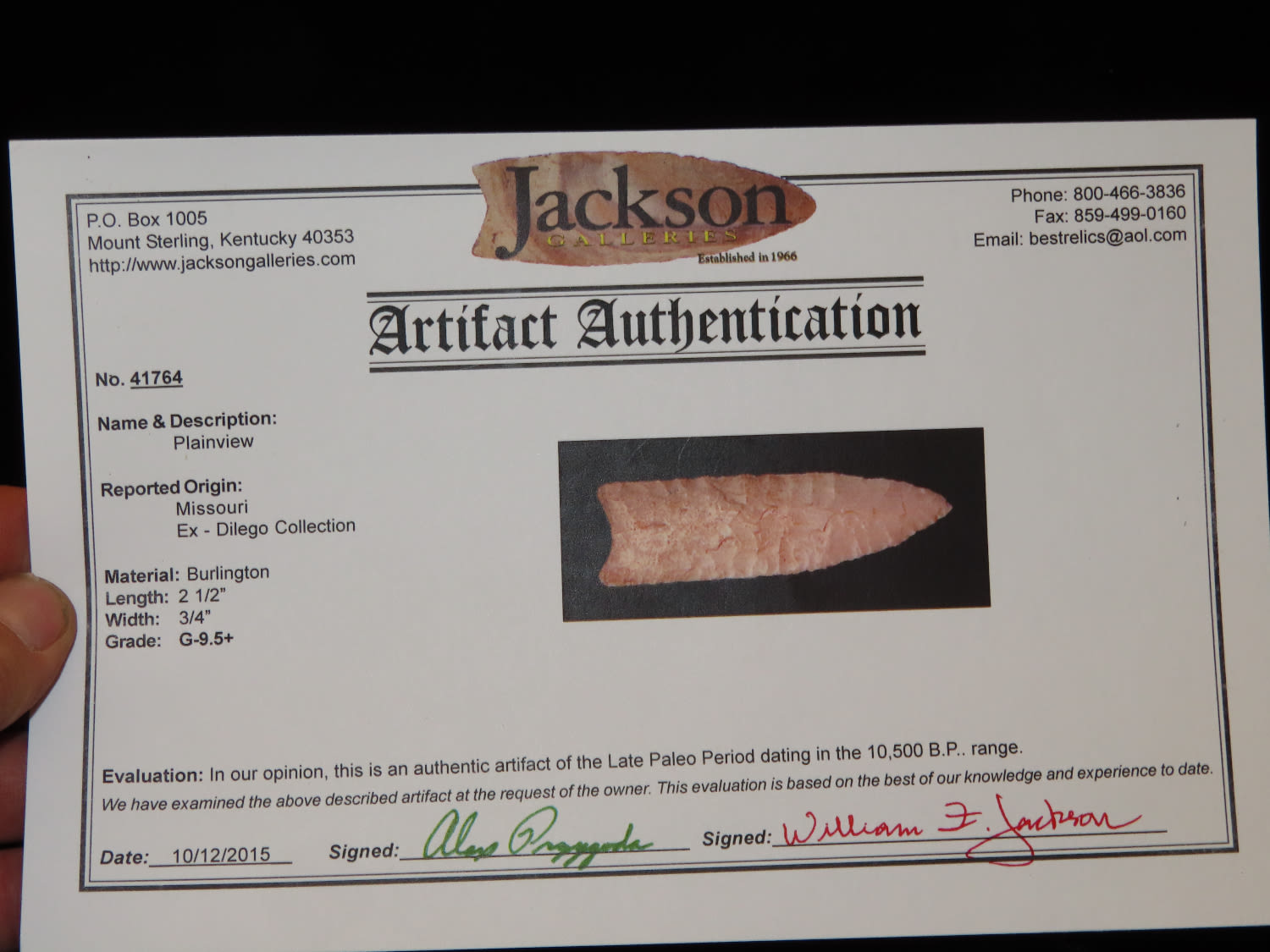2 1/2" Plainview, Jackson COA, found in Missouri, made of Burlington Chert, Beautiful Example of type, Flaking is exceptional, Ex Ron Comer Collection