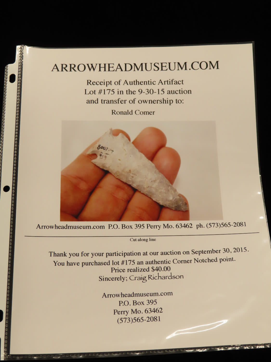 2 5/8" Corner Notch, COA Arrowhead Museum-also purchased from in 2015, Ex Ron Comer Collection