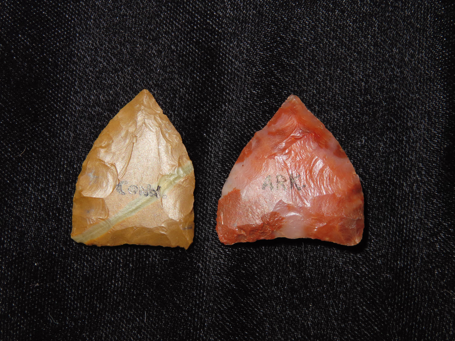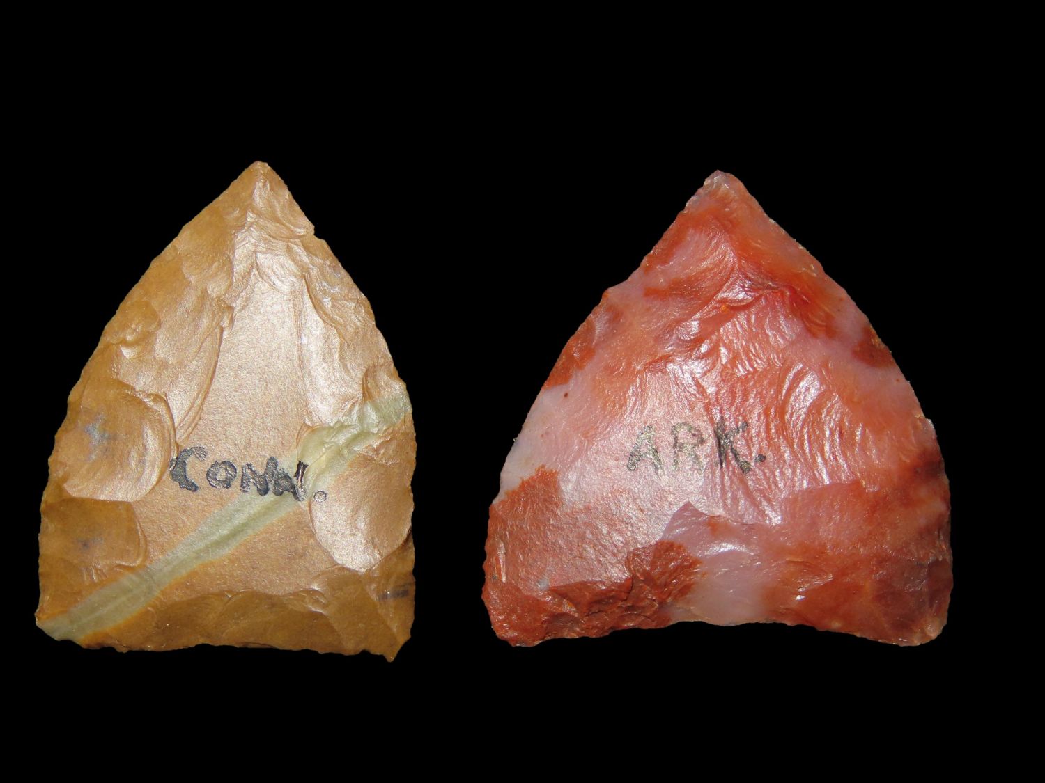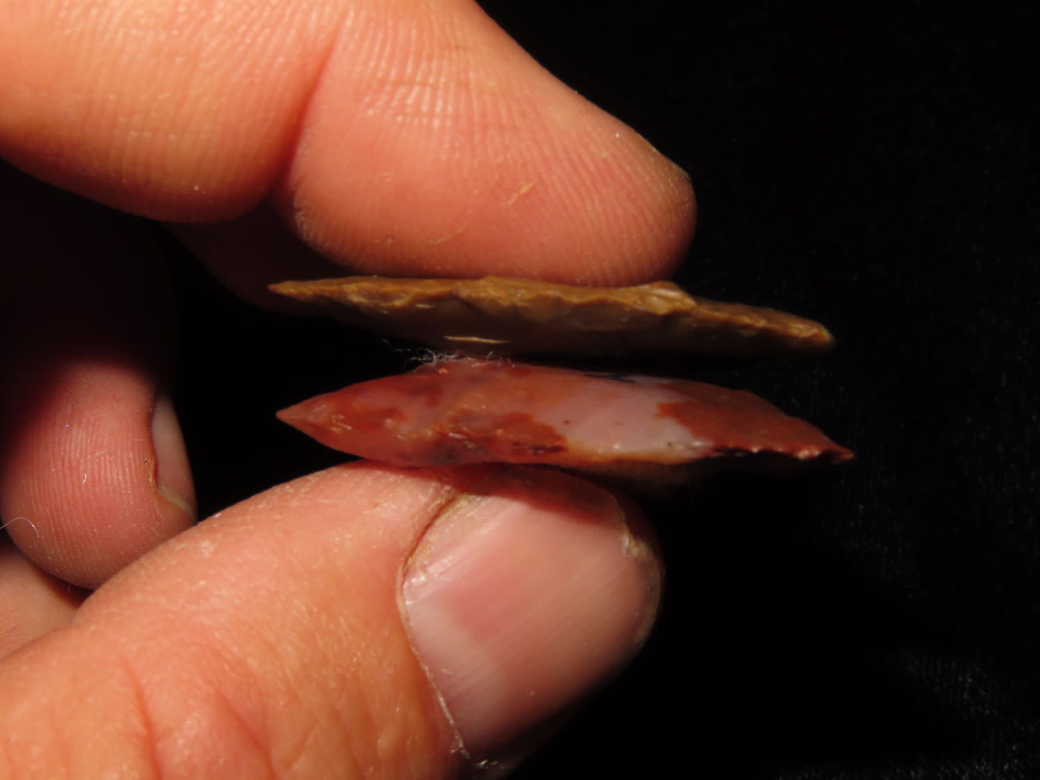 1 1/8″ x2 Paleo Dart Points -one made of semi-transluscent Red Agate-found in Arkansas; one made of brown chert, found in Connecticut, Ex Earl Townsend Collection, purchased from T Putty Auctions in 2015, Ex Ron Comer Collection