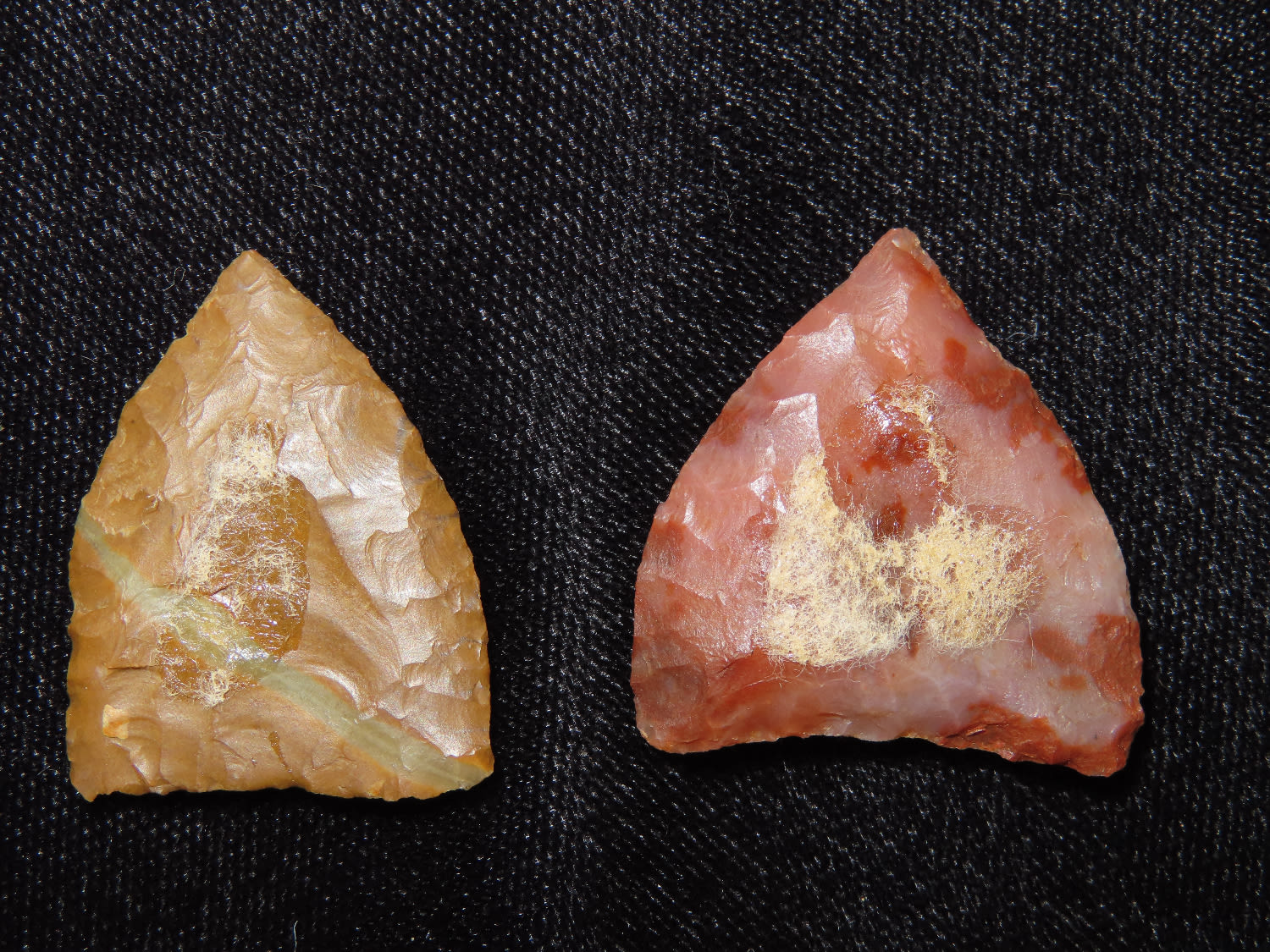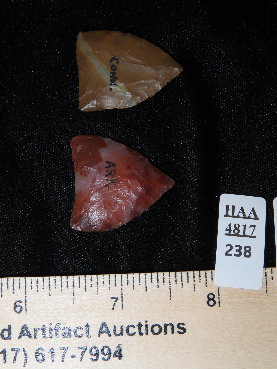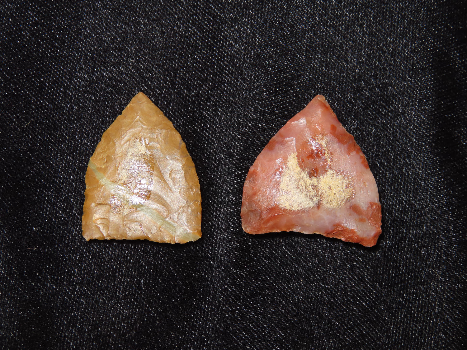 1 1/8″ x2 Paleo Dart Points -one made of semi-transluscent Red Agate-found in Arkansas; one made of brown chert, found in Connecticut, Ex Earl Townsend Collection, purchased from T Putty Auctions in 2015, Ex Ron Comer Collection